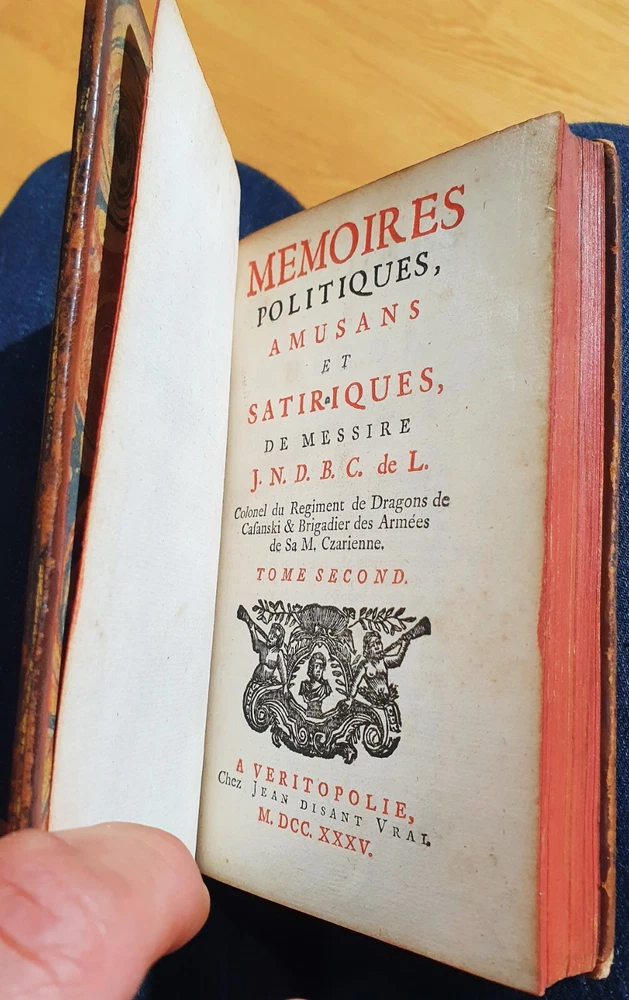 Brasey: Amusing and satirical political memoirs of Messire J.N.D.B.C. 1735 The description of this item has been automatically translated. If you have any questions, please feel free to contact us. Brasey (Jean-Nicolas de, count of Lyon) Mémoires Politiques Amusans and Satiriques de Messire JNDBC de L. Colonel of the dragons regiment of Casanski & brigadier of the armies of his M. Czarienne. Veritopolis in Jean Disant True, 1735 3 volumes in-12 (15.5 x 10cm), marbled calf, period binding, ornate back, ex-armié "Robillard". [10] -325- [1]; [2] -318; [2] -292 pages Some worn corners and caps, rubbed hinges, rare freckles. Very correct state. Complete from the frontispiece, the portrait and the 12 engraved plates including 2 leaflets. Brasey (Jean-Nicolas de, count of Lyon) Mémoires Politiques Amusans and Satiriques de Messire JNDBC de L. Colonel of the dragons regiment of Casanski & brigadier of the armies of his M. Czarienne. Veritopolis in Jean Disant True, 1735 3 volumes in-12 (15.5 x 10cm), marbled calf, period binding, ornate back, ex-armié "Robillard". [10] -325- [1]; [2] -318; [2] -292 pages Some worn corners and caps, rubbed hinges, rare freckles. Very correct state. Complete from the frontispiece, the portrait and the 12 engraved plates including 2 leaflets. Recommended products Provided by Letters From Mr. William Coxe... On The Political State... Of Switzerland 1782 View item Physical And Medical Topography Of Avignon And Its Territory, Pamard, 1802 View item De Bomy: Statutes And Customs Of The Country Of Provence... 1620 View item André Perrin: History Of The Valley And The Priory Of Chamonix... 1887 View item Art Of Glassmaking By Neri, Merret And Kunckel 1752 View item Ingenious Thoughts Of The Ancients And The Moderns, 1741 View item Historical And Scientific Description Of Haute-Auvergne, J.B. Bouillet, 1834 View item De Laborde: General And Particular Description Of France - Rhône 1781-1784 View item Date de publication 1735 Objet modifié Non Reliure Cuir Reliure Relié Langue Français Époque XVIIIème Nom de publication Mémoires politiques amusans et satiriques de Messire J.N.D.B.C. Lieu de publication Veritopolis Nom Mémoires politiques amusans et satiriques de Messire J.N.D.B.C. d Caractéristiques spéciales Édition originale Auteur BRASEY (Jean-Nicolas de, Comte de Lyon) Nombre de pages 950 Type Ouvrage historique Quantité unitaire 1 Sujet Brasey, Mémoires, Politiques, Casanski, Villars