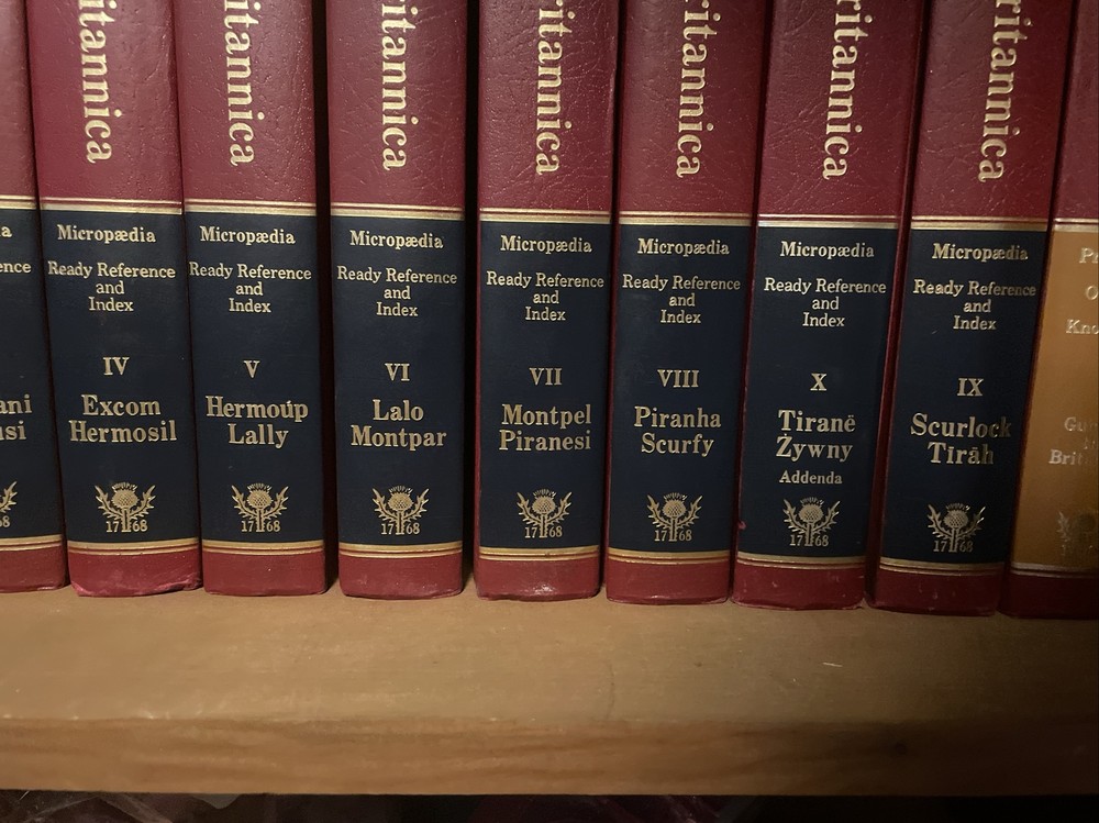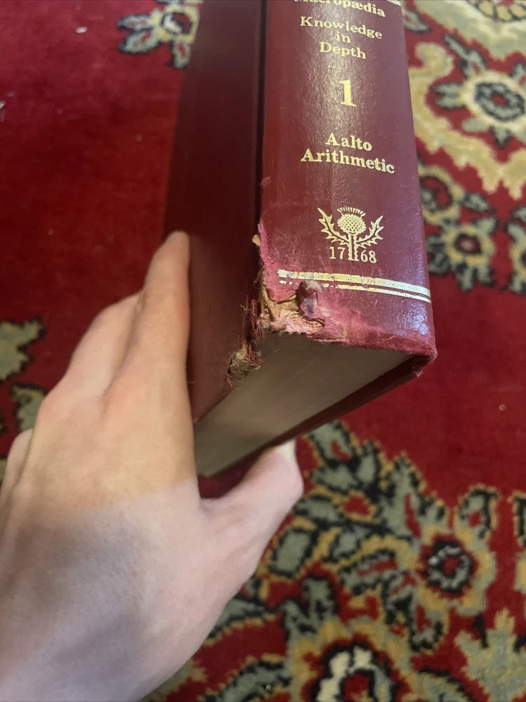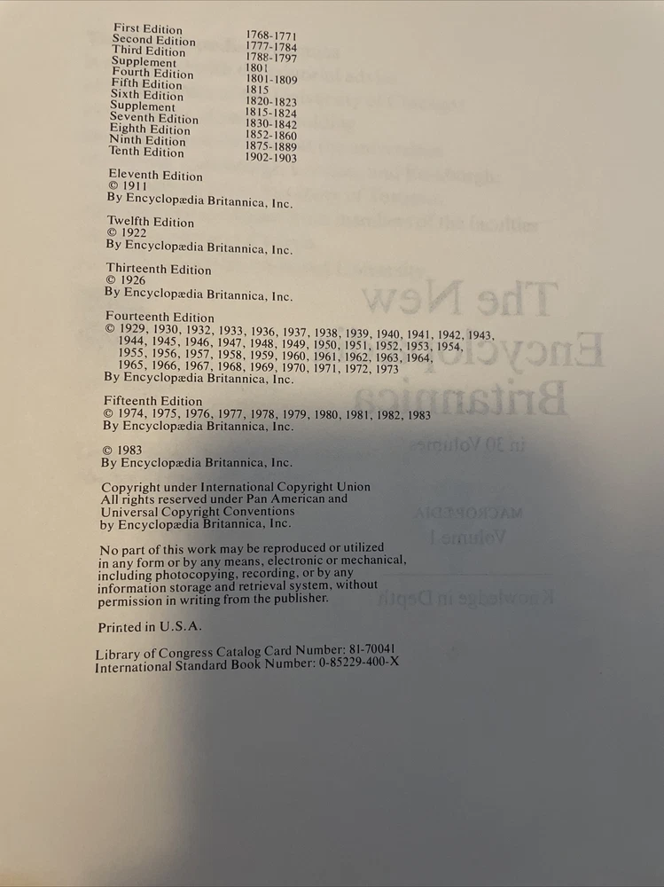 This 30-volume set of the Britannica Encyclopedia is a must-have for any collector or lover of reference books. The 1768 edition, published in 1983 by Encyclopædia Britannica, Inc in Chicago, is a true treasure for anyone interested in expanding their knowledge. The books are in excellent shape and would make a great addition to any bookshelf or collection. The encyclopedia covers a wide range of topics and subjects, making it a valuable resource for students, researchers, and anyone interested in learning more about a particular subject. The books are in English and have not been signed or personalized. This set is perfect for anyone who loves collecting antique and collectible books. These are in pretty good shape. There appears to be no water damage. Volume 1 has some binding damage as shown.