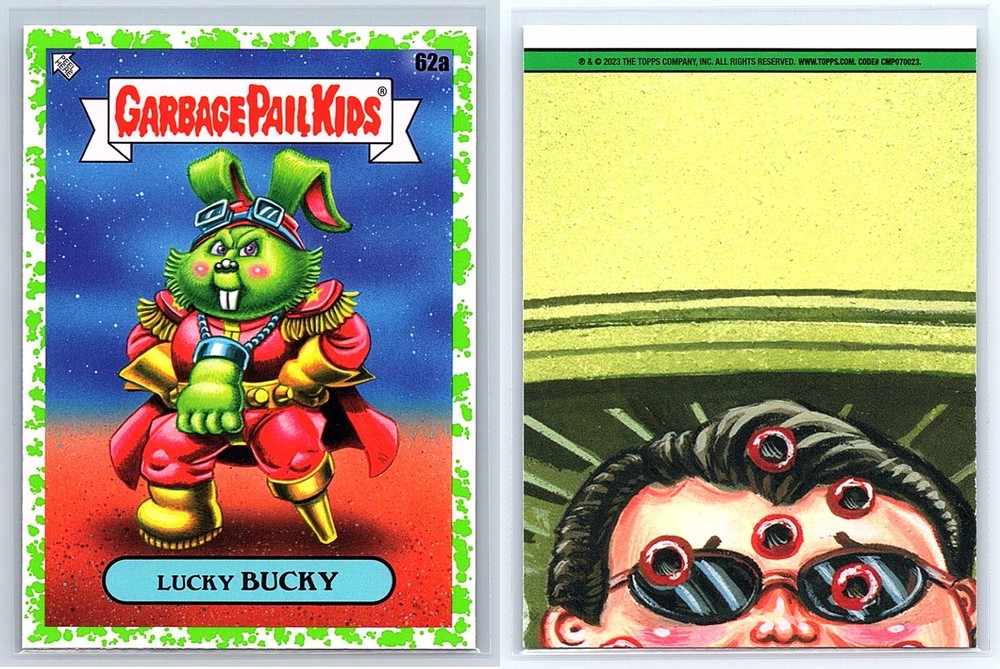 This Bucky O'Hare Garbage Pail Kids set is a must-have for collectors and fans! The two-card combo featuring Lucky Bucky and Robert Rabbit is hilarious and nostalgic, with sharp, vibrant artwork. The cards arrived in perfect condition—pack fresh and well-protected in a top loader. Fast shipping and great packaging make this a fantastic gift or addition to any GPK collection. Highly recommend grabbing this fun spoof set!