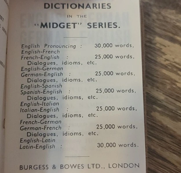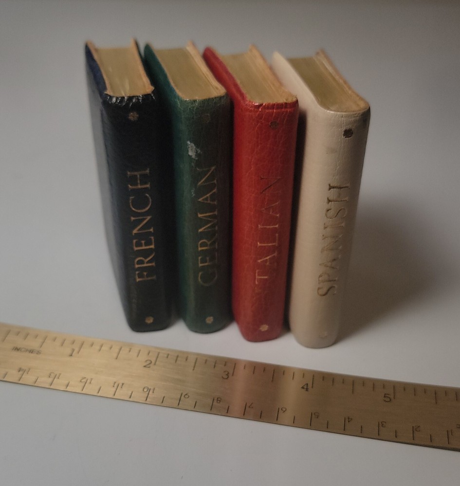 Vintage Burgess & Bowes Midget Book Set Translation Dictionaries 4 Volumes. ENGLISH-FRENCH ENGLISH-GERMAN ENGLISH-ITALIAN ENGLISH-SPANISH unique for travelers, these books are made in England No major damages. Minor ware. I doubt these books have really ever been used. They are acceptable for reading