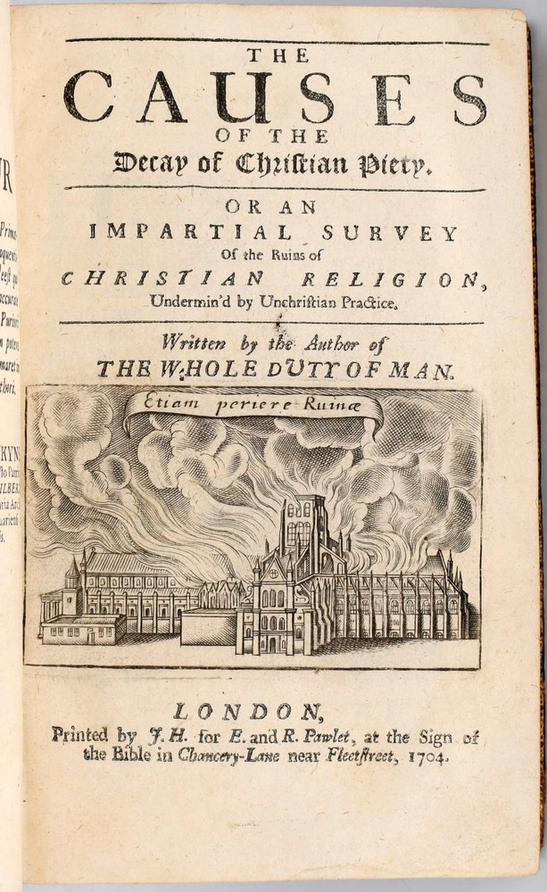 [RELIGION] THE CAUSES OF THE DECAY OF CHRISTIAN PIETRY. OR AN IMPARTIAL SURVEY OF THE RUINS OF CHRISTIAN RELIGION, UNDETERMINED BY UNCHRISTIAN PRACTICE Author: By the author of The Whole Duty of Man [Richard Allestree?] Title: [RELIGION] THE CAUSES OF THE DECAY OF CHRISTIAN PIETRY. OR AN IMPARTIAL SURVEY OF THE RUINS OF CHRISTIAN RELIGION, UNDETERMINED BY UNCHRISTIAN PRACTICE Publication: Printed by J. H. for E. and R. Pawlet, at the Sign of the Bible in Chancery-Lane, 1704 Description: Full Leather. 8vo.; in crimson morocco with a decorative device in gilt to the center of each board, and dentelles borders to the perimeter of the boards, and with raised banrds and decorations in gilt to the spine; all edges gilt; the beginnings of separation to front joint; wear to the corners; name label to the pastedown.~~With the name label of Charles Whibley ~["Sum Caroli Whibley"] on the front pastedown. Very Good binding. Seller ID: 297554 Black Swan Books Richmond VA We specialize in antiquarian books, classic literature, the Civil War, Viriginiana, travel, art, children's books, and other subject areas, including religion and philosophy . Terms Payment via PayPal is preferred. All orders ship within two [2] business days, Monday through Friday by standard mail, USPS Media Mail. Combined orders and expedited shipping is available. Please contact us for a shipping quote before ordering. All items are guaranteed as listed and described. Any item may be returned within 30 days for any reason in the condition is which they were sent. This listing was created by Bibliopolis.