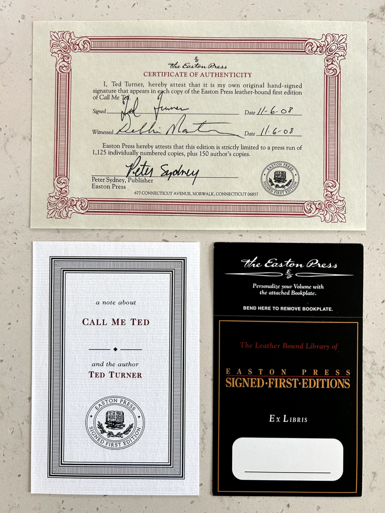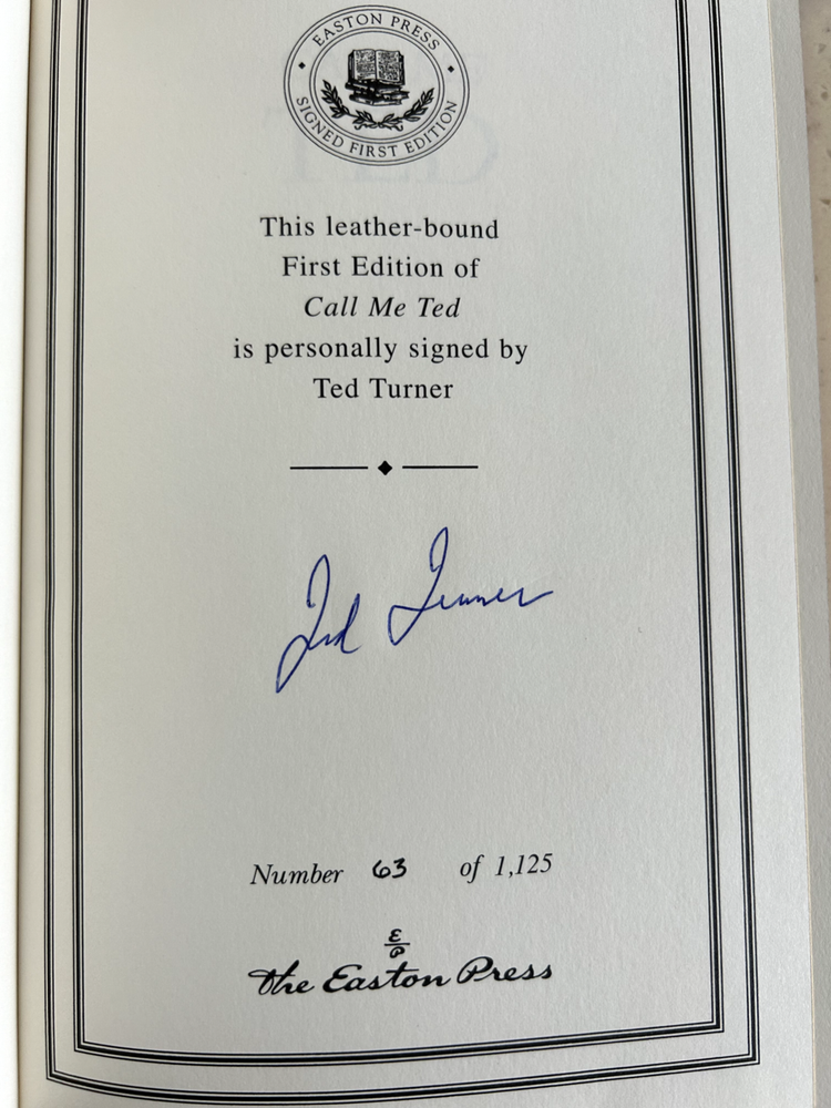 Call Me Ted by Ted Turner Signed leather bound 1st edition with COA, numbered 63 of 1,125 "Ted Turner" embossed in gold on book cover Like new - book has not been read, no bent pages Easton Press "Signed First Editions" (2008) Bound in fine genuine leather with 22K gold page edges Archival acid-free paper Domestic shipping only Returns accepted within 30 days