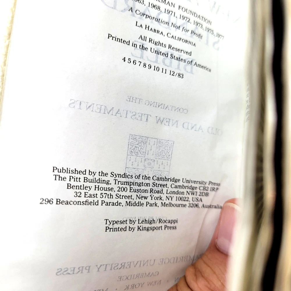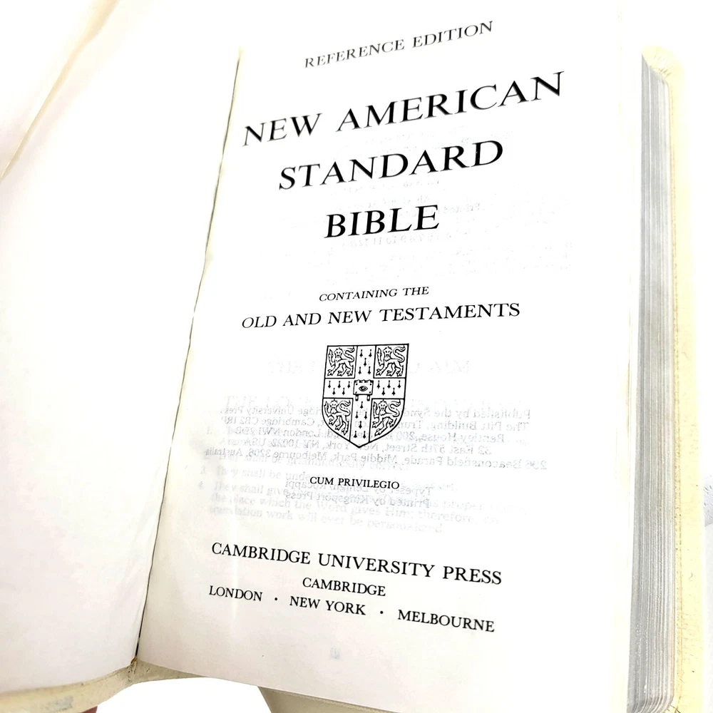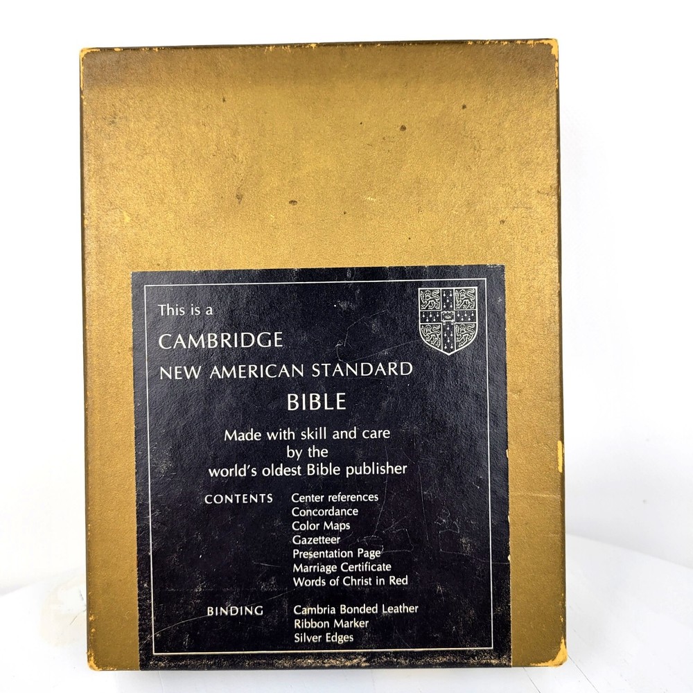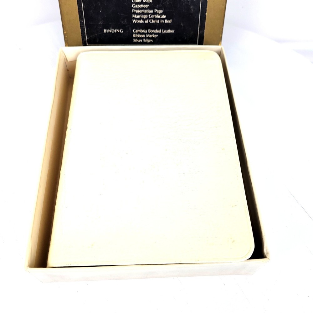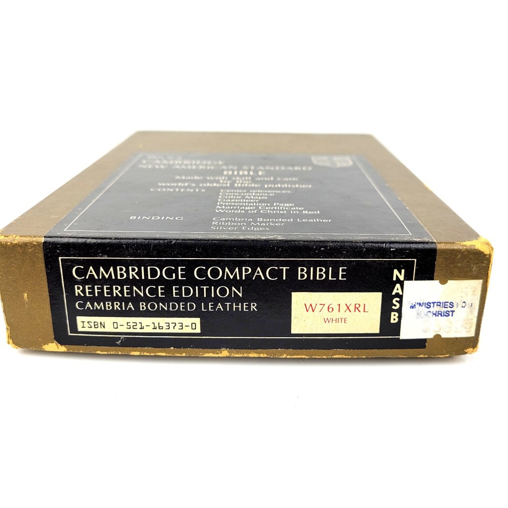 CAMBRIDGE NASB COMPACT BIBLE REFERENCE EDITION W761XRL WHITE Cambria Leather Item Condition: The book looks to be in "New" or "Unused" condition. There is some "Cracking" on leather the binding edge. The cracking looks to be from age and not use. The "White" color has changed to a "Cream" color due to the age. See Pictures. The item in the pictures is the one that will ship. Features: Original Box Cambria Bonded Leather Silver Edges Ribbon Marker Contents: Center References Concordance Color Maps Gazetteer Presentation Page Marriage Certificate Words of Christ in Red Publisher: Cambridge Press Model: W761XRL in White ISBN:0-521-16373-0 Thank you for viewing the Listing. Hat Shipping Notes: All hats will be boxed, bagged and have a moisture control gel pack for shipping. All hats are as is and as seen in the pictures. International Buyer Notes: Import duties, taxes, and charges are not included in the item price or shipping cost. These charges are the buyer's responsibility. Please check with your country's customs office to determine what these additional costs will be prior to bidding or buying.