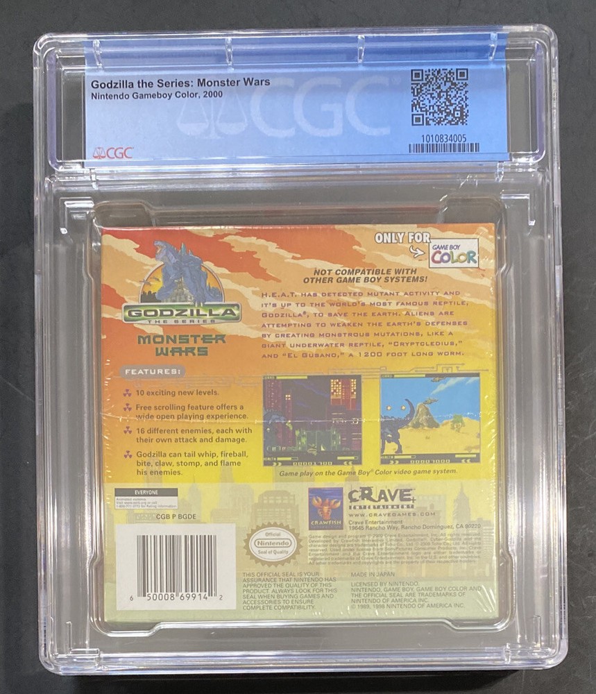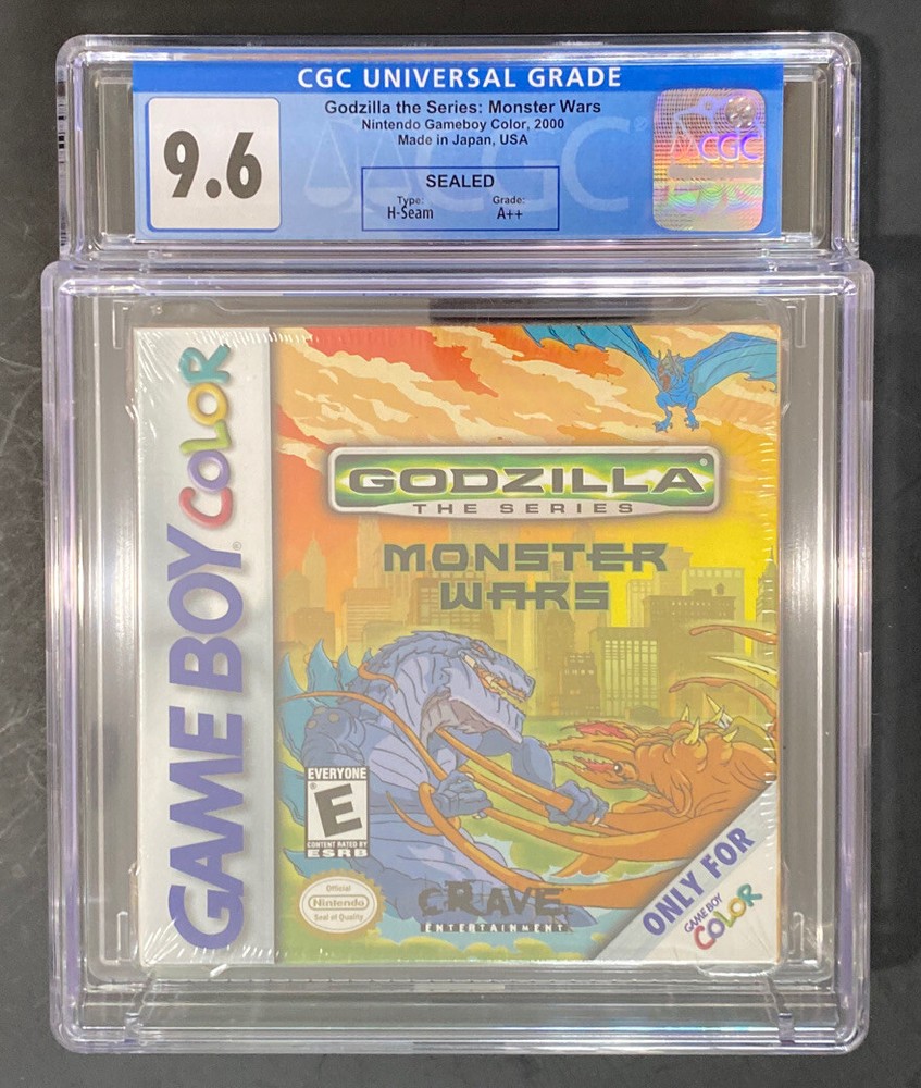 📦 CGC POP 1 H-SEAM SEALED COPY Godzilla: Monster Wars (Nintendo Game Boy Color) 📊 CGC Details: Grade : 9.6 A++ Seal Type : H-SEAM SEALED Release : 2006 Console : Nintendo Game Boy Color ✨ Key Features: Godzilla Franchise Collectibility : A perfect crossover for fans of video games and the iconic Godzilla series. H-Seam Sealed : A bonafide sealing style that collectors love, adding an extra layer of authenticity and appeal. Mint Presentation : The A++ seal rating ensures this copy has gem mint shrink wrap and outstanding preservation. 🎮 Collector’s Note: This is one of the finest-sealed examples of Godzilla: Monster Wars in the world , blending nostalgia, rarity, and top-tier condition. A standout piece for any Nintendo or Godzilla fan’s collection. 🔥 Don’t Miss Out! Buy It Now or make your Best Offer to secure this incredible collectible! Opportunities like this don’t come often!