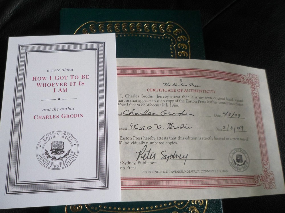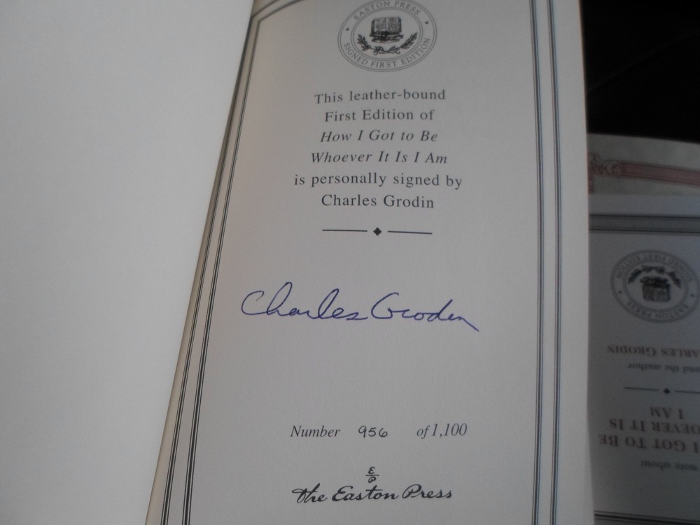 This is a leather bound signed numbered first edition of Charles Grodin's best-selling memoir - "How I Got To Be Whoever It Is I Am", the fascinating story of the well-known Hollywood actor and TV personality, describing a remarkable career spanning more than half a century. In his candid and engaging new book HOW I GOT TO BE WHOEVER IT IS I AM, successful actor, author, and activist, Charles Grodin, looks back at the major events and private moments that have shaped his life. And, since Grodin is one of the best storytellers around, he can't help but entertain while offering insight gained from a wealth of experience. The combination of being impeached as class president by his fifth grade teacher (and then winning many school elections thereafter) with being thrown out of Hebrew School for asking too many questions (only to find a much better teacher as a result) informed Grodin's view of himself and made him adept at dealing with rejection--an important skill for an actor. Grodin's success in plays in high school and adventures in college theater led him to a career in acting, studying with the great teachers like Uta Hagen and Lee Strasberg. Grodin shares behind-the-scenes tales of working on plays like Same Time Next Year and movies like The Heartbreak Kid and Midnight Run --even how close he came to playing the lead in The Graduate. His stories feature the many actors, directors, writers, and producers, with whom he's worked, such as Robert DeNiro, Dustin Hoffman, Johnny Carson, Orson Welles, Warren Beatty, and other colorful characters. Grodin's greatest work isn't limited to stage and screen, however. He has been an award winning talk show host and commentator on Sixty Minutes II , and he reveals insights about the political and personal side of journalism and some of the larger-than-life characters he's interviewed. Still, it is the personal aspects of Grodin's life that are truly revealing and funny. He shares intimate anecdotes of humorous dating experiences during the carefree 70s along with stories of what it was like to be a young actor then with friends and colleagues like Robert Redford, Gene Wilder, and Dustin Hoffman. The book is in excellent condition. It is unread, and only opened to check the number and the signature. Signed by the famous Hollywood star on the limitation page, this is number 956 of 1100 copies ever printed. It includes the signed and dated certificate of authenticity, as well as the note card. Easton Press books are the golden standard in the publishing industry, highly collectible and lasting generations. Easton Press Full Genuine Leather Dubbed Spine Accented Wit 22 kt. Real Gold Satin Ribbon Page Marker Distinctive Cover Design Gilded Page Edges To Protect Against Humidity High Quality Acid - Free paper Smyth-Sewn Pages Silk-Moire Endleaves I combine multiple items for savings on shipping charges. I ship worldwide. Please ask about international shipping charges and/or different shipping options. Please check out my other auctions for several rare signed books for sale. Thank you!