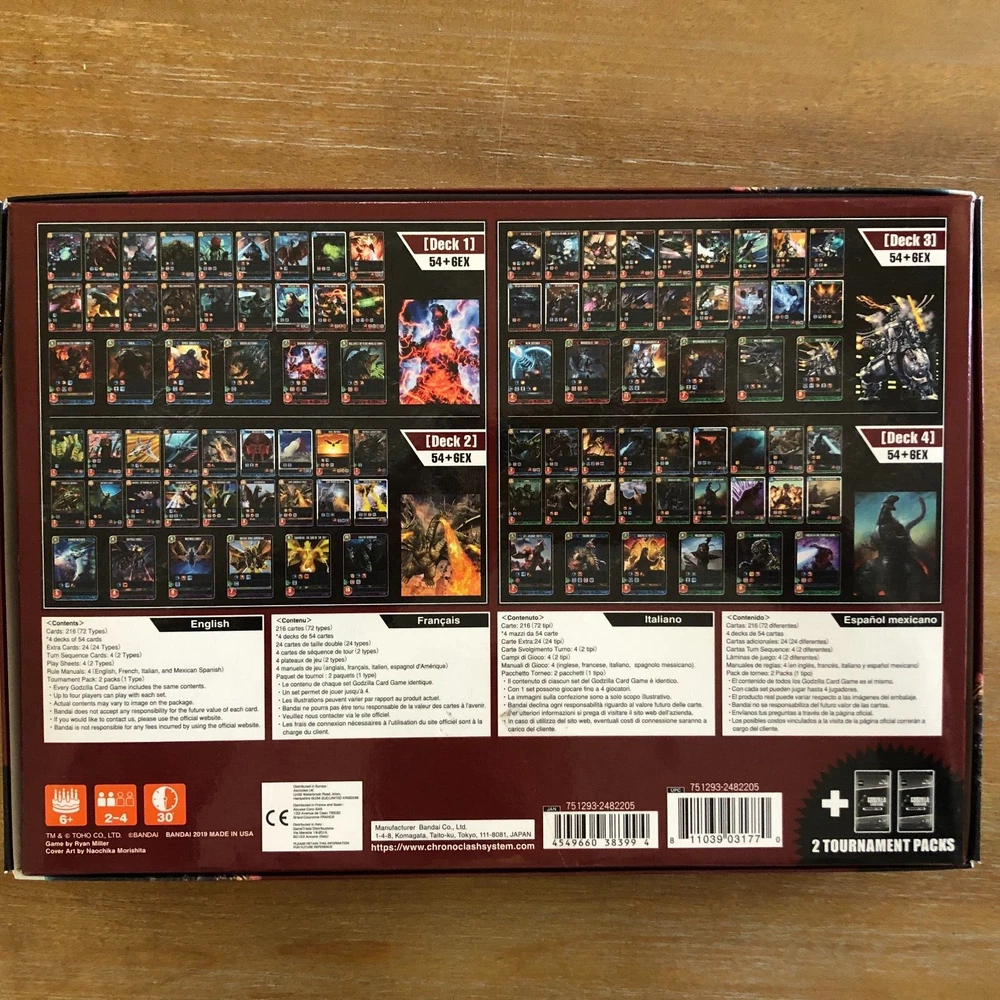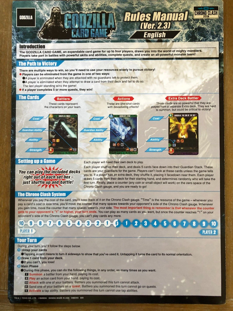 Godzilla Card Game System by Bandai > Designed around the Godzilla Archetype > Ages 8 and up > Standard card size > Play manual in 8 different languages > Complete > New Open Box Condition