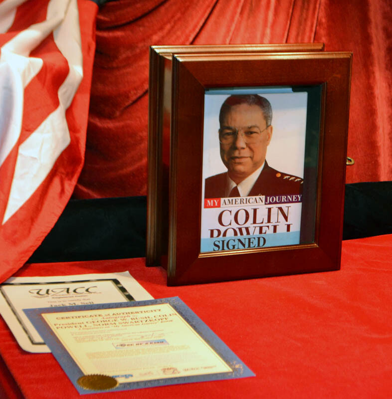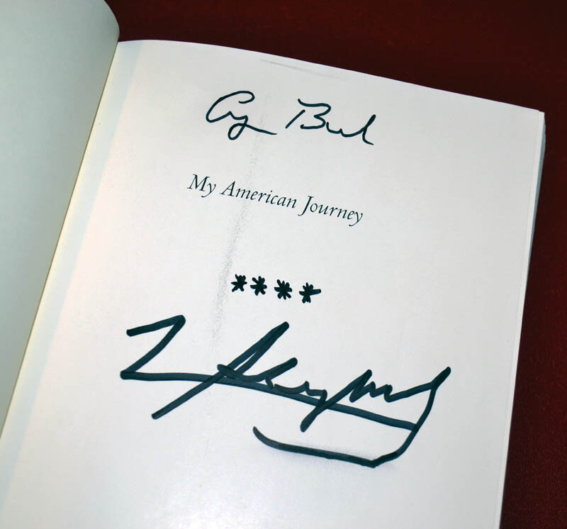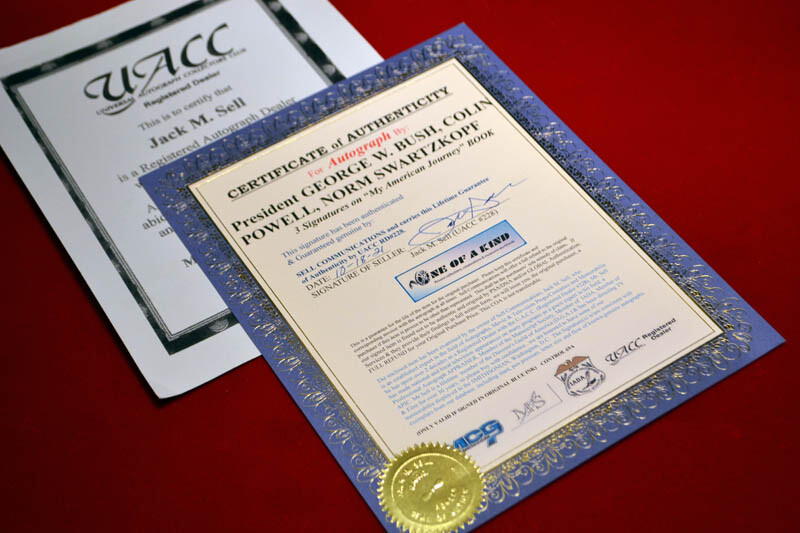 "My American Journey" Signed by General COLIN POWELL, President GEORGE W. BUSH & General NORMAN SCHWARZKOPF A VERY RARE High Quality 1st Edition Signed Autographed BOOK in Hard Cover, Dust Jacket, COA, UACC in a beautiful Wood BOX with Key This is a Near Mint edition Book with an acid-free book cover... General COLIN POWELL, President GEORGE W. BUSH & General NORMAN SCHWARZKOPF all signed in Black Marker... These 3 signatures are Guaranteed genuine for life by: UACC Registered Dealer #228 This BOOK is filled with interesting stories and anecdotes about the life of COLIN POWELL... A COLLECTOR'S EDITION Hard Back Book of "MY AMERICAN JOURNEY" by COLIN POWELL with Joseph E. Persico, 1995, signed by Colin Powell, President Bush & General Schwarzkopf. This beautiful signed first edition of General COLIN POWELL's best-selling book "MY AMERICAN JOURNEY" could become a valuable collectible and comes housed in this beautiful wood and glass display with key. A beautiful book that has the original Dust Cover over the Hard Back Book ... This BOOK is Near MINT with a Dust Cover in overall good condition...pristine - clean, tight, square, sharp corners....this has only been carefully opened to be photographed. The new Wood & Glass Display CASE measures approximately 14" x 12" x 4"... ...the box easily opens so you can remove the book from the display case when you prefer. You also receive this KEY to lock the Case as well... This Book is just filled with COLIN POWELL's remarkable story as a child, father, husband & politician! There are dozens of other great photos of the General inside this Book! This is a RARE 1st EDITION BOOK, published in 1995 by RANDOM HOUS. A Great FIND!!! We have always been an avid collector of Books, HISTORICAL Autographs, Movie Props and High End Collectibles and we have been selling much of our prized collections on ebay for over 15 years....so, take a look at this collectible & many other highly-treasured items that we've collected over the years in our ebay Store. The CERTIFICATE OF AUTHENTICITY for the AUTOGRAPH is issued & guaranteed for life by UACC Registered Dealer #228, guaranteed to pass the standards of PSA or JSA. Colin Luther Powell General Powell (April 5, 1937 – October 18, 2021) was an American politician, diplomat and four-star general who served as the United States Secretary of State from 2001 to 2005. He was the first African-American Secretary of State under President Bush. Prior to the election of President Obama, he and his successor, Coneoleezza Rice were the highest-ranking African Americans in the history of the federal executive branch (by virtue of the Secretary of State standing fourth in the president line of succession.) He served as National Secruity Advisor from 1987 to 1989 and as the 12th Chairman of the Joint Chiefs of Staff from 1989 to 1993. President George W. Bush George Walker Bush is an American politician and businessman who served as the 43rd president of the United States from 2001 to 2009. A member of the Bush family and Republican Party, he previously served as the 46th governor of Texas from 1995 to 2000. Bush flew warplanes in the Texas Air National Guard. General Norman Schwarzkopf H. Norman Schwarzkopf Jr. (1934-2012) was a United States Army general. While serving as the commander of United States Central Command, he led all coalition forces in the Gulf War. Born in Trenton, New Jersey, Schwarzkopf grew up in the United States and later in Iran. We might pay more for our autographs & fine collector's books, but we want to make sure that what we acquire is absolutely genuine and in the best condition to not only make this a valuable piece for your family to enjoy, but also a valuable investment piece. I direct movies & television shows, but my wife & I have traveled the world in my business and have been avid collectors of Historical Memorabilia, Autographs, Art, Movie Props & High End Collectibles for over a quarter of a Century. We've only invested money in the higher end collectibles and buy from prestigious auction houses & galleries when acquiring many of our items...always buy from a reputable dealer, one who is preferably certified by the UACC. This Original 1st Edition Autographed Book has been stored in an acid free sleeve in a dark, 72 degree, smoke free, pet free environment....it has never been displayed or read since being acquired. CHECK OUT OUR OTHER COLLECTIBLES FOR MORE GREAT ITEMS INCLUDING Books, Autographs from other famous People, Movie & Television Prop & Costume Collections, rare Toys, POSTERS and more "ONE OF A KIND" finds! Please ask any questions before bidding since all sales are final to protect the provenance and chain of custody & most autographs are UV marked....the original photography in this ebay ad are covered by U.S. copyright laws and are the sole property of Sell Communications. They cannot be duplicated or reproduced or posted anywhere without the express written permission of Sell Communications...our pictures in this ad are part of our ad description...buyer is responsible for any VAT or SALES tax that your country or state may or may not charge. Jack M. Sell is a Registered Dealer with the U.A.C.C. (RD#228). Mr. Sell has made national and local television appearances on many programs as a guest expert in his field, a Member of the Manuscript Society, Member of the APIC, has over 10,000 Positive Ebay Ratings and is a lifetime Member of the Director's Guild of America (D.G.A.) & has been directing TV & Film for over 30 years for SONY/Columbia Pictures, PBS, Tribune Entertainment Corporation, USA Network, HBO & NBC, so please buy with confidence...we are proud that some of our memorabilia has been on display in the SMITHSONIAN, Washington, D.C. FULL MONEY BACK GUARANTEE! Sell Communications offers a FULL MONEY BACK, LIFETIME AUTHENTICITY GUARANTEE on all of our AUTOGRAPHED ITEMS. Ebay has sought out qualified experts in the autograph field who will evaluate an autograph and will offer