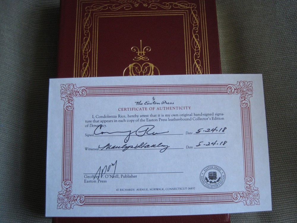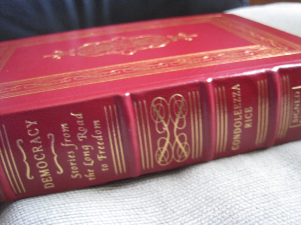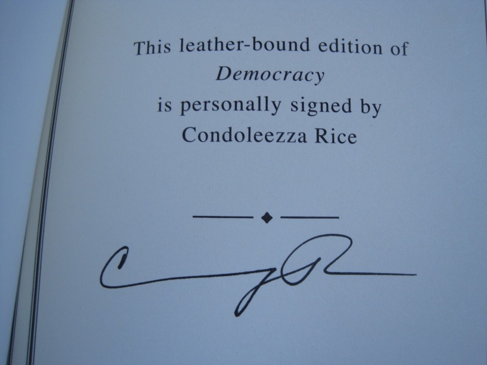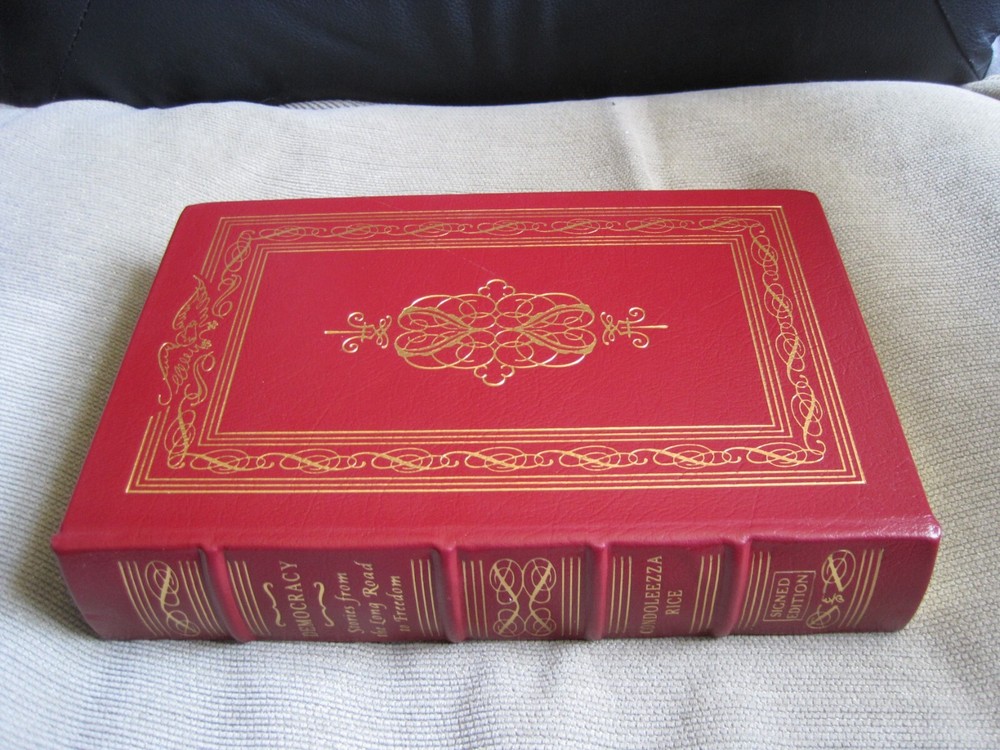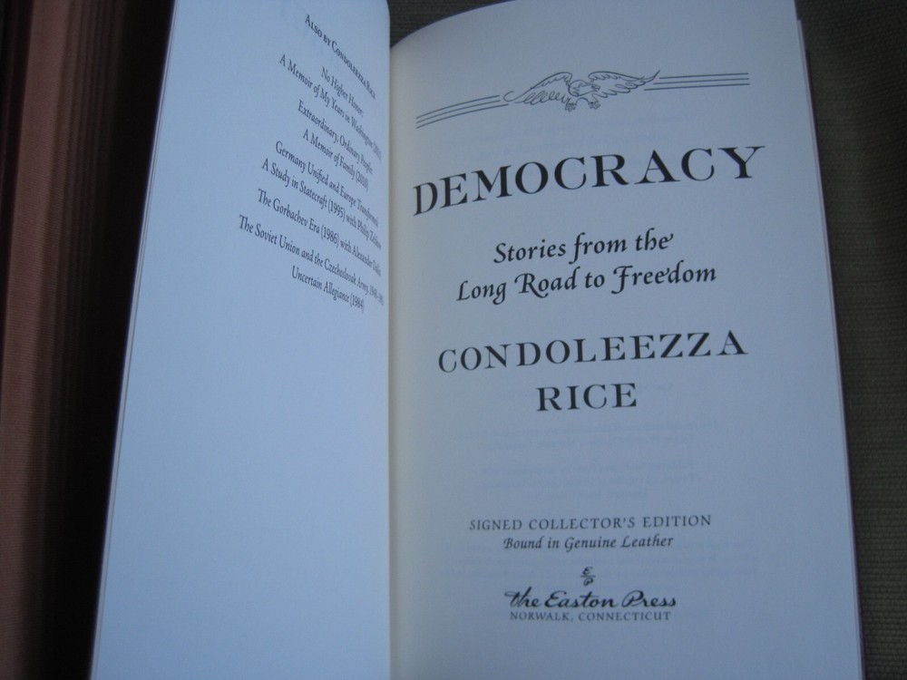 This is a leather bound signed collector's edition of former Secretary of State Condoleezza Rice's best-seller - "Democracy - Stories from the Long Road to Freedom". Condoleezza Rice has excelled as a diplomat, political scientist, and concert pianist. Her achievements run the gamut from helping to oversee the collapse of communism in Europe and the decline of the Soviet Union, to working to protect the country in the aftermath of 9-11, to becoming only the second woman - and the first black woman ever -- to serve as Secretary of State. The book is unread, and in great condition, with just minor imperfections of the gold gild on the side of the pages (see images). Signed by the author on the limitation page, it also includes the signed and dated certificate of authenticity. Easton Press books are the golden standard in the publishing industry, highly collectible and lasting generations. Easton Press Full Genuine Leather Dubbed Spine Accented Wit 22 kt. Real Gold Satin Ribbon Page Marker Distinctive Cover Design Gilded Page Edges To Protect Against Humidity High Quality Acid - Free paper Smyth-Sewn Pages Silk-Moire Endleaves I combine multiple items for savings on shipping charges. I ship worldwide. Please ask about international shipping charges and/or different shipping options. Thank you!