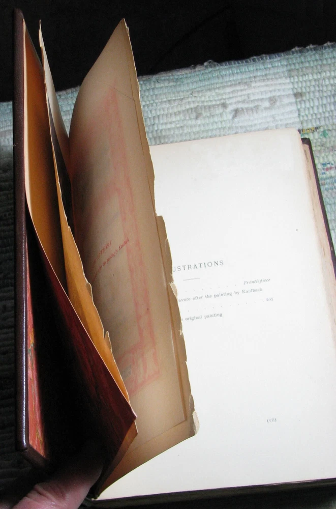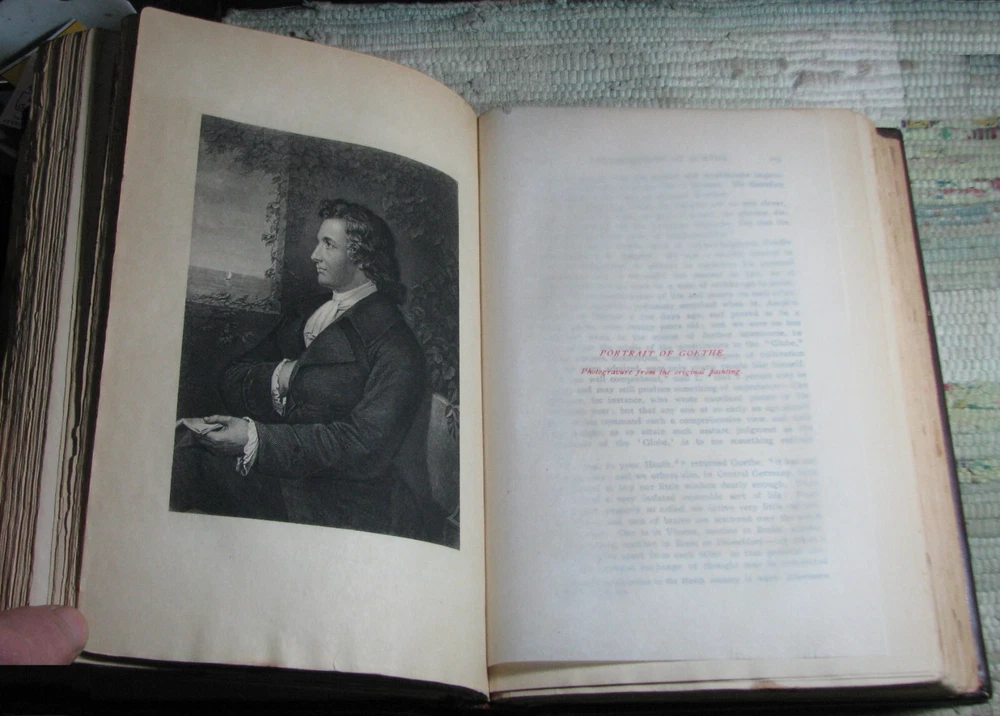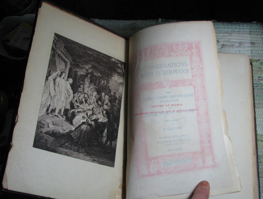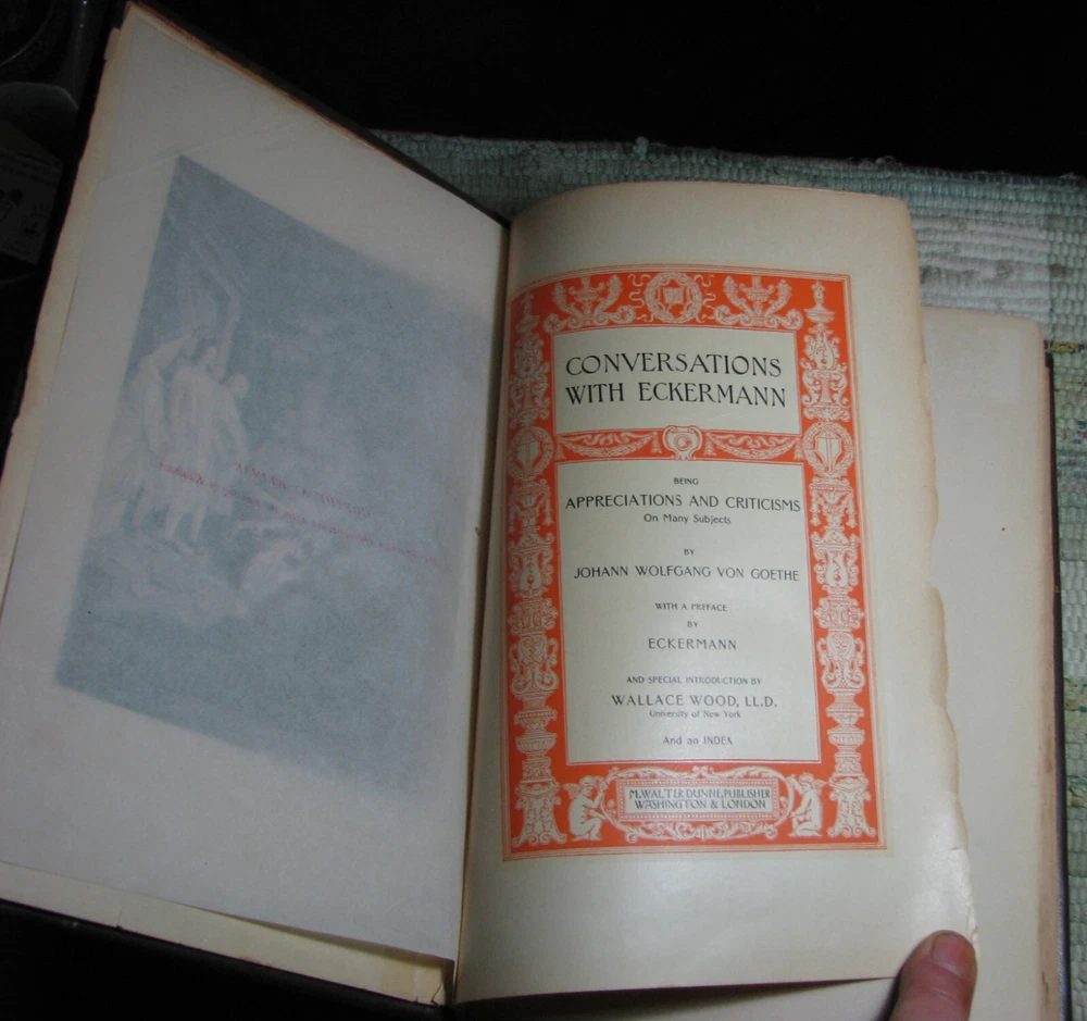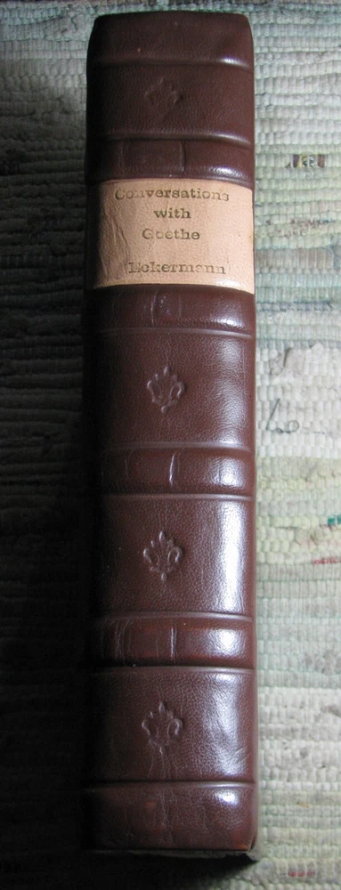 CONVERSATIONS WITH ECKERMANN by JOHANN VON GOETHE 1901 Leather Hardcover CONVERSATIONS WITH ECKERMANN being APPRECIATION'S AND CRITICISMS On Many Subjects by JOHANN WOLFGANG VON GOETHE with a preface by ECKERMANN and special introduction by WALLACE WOOD, LL.D. University of New York And an INDEX M. WALTER DUNNE, PUBLISHER, WASHINGTON & LONDON, 1901, xii+397 pages 9 1/2 x 6 5/8 x 1 3/4 inches Fine Binding, brown leather, red marbled board and end papers, raised bands and guilt stamped spine cover, lightly quilted top edge, rubbings at cover, front end-paper is glued to the front board, stain at tail edge, clean text, good binding, please see photos. Preface by Eckermann and special introduction by Wallace Wood. Goethe at Weimar Photogravure after the painting by Kaulbach Frontipiece. Portrait of Goethe Photogravure from the original painting.
