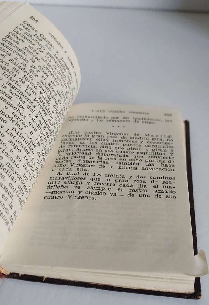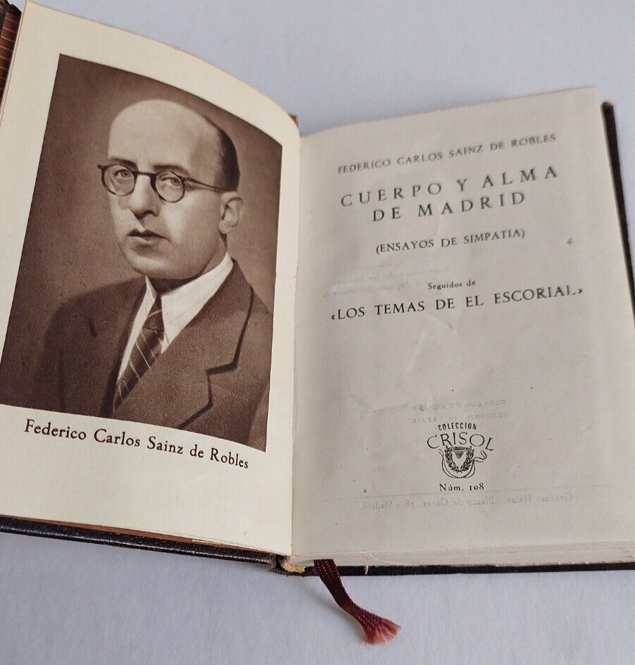 1945 CUERPO Y ALMA DE MADRID. BY FEDERICO CARLOS SEINZ DE ROBLES. COLECCION CRISOL. BOUND IN BROWN PEBBLED LEATHER I F ANY OF THESE STATEMENTS ARE WRONG, PLEASE MESSAGE ME. I APPRECIATE IT!!! YOU ARE GETTING EXACTLY WHAT IS IN PHOTOS NOTHING MORE, NOTHING LESS. YOU WILL BE GETTING THE ITEM IN THE EXACT CONDITION AS YOU SEE IT. PLEASE VIEW PHOTOS FOR EXACT DETAILS THANK YOU BROWSE MY STORE FOR MORE UNIQUE AND AMAZING TREASURES COMICS, COMIX, WOOD WORK, LEATHER GOODS, POTTERY, ART GLASS, VINTAGE AND COLLECTIBLE TOYS AND ACTION FIGURES, PUNK ROCK POSTERS AND FLYERS, PLUS SO MUCH MORE. I AM A RESELLER WHO ENJOYS BRINGING YOU RARE AND BEAUTIFUL ITEMS FROM OUR PAST AND PRESENT. I WILL TRY AND STATE UP FRONT ALL THE DEFECTS THAT THE ITEM HAS. PLEASE FEEL FREE TO MESSAGE ME WITH ANY QUESTIONS. I APPRECIATE YOUR BUSINESS AND WILL TRY TO GO ABOVE AND BEYOND TO GET YOU YOUR ITEM IN EXCELLENT CONDITION.
