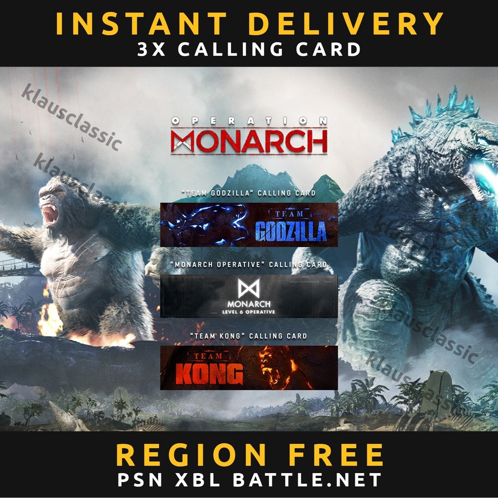 CALL OF DUTY VANGUARD 3X CALLING CARD DIGITAL CONTENT ONLY After purchase you will receive one unique code that allow you to unlock the Team Godzilla, Monarch Operative and Team Kong Calling Card in Call of Duty Vanguard You must have a valid gaming account linked to your Call of Duty account such as PSN, XBL or Battle.net Code must be redeemed on callofduty website, instructions are included with code delivery GLOBAL ACTIVATION Region free will work worldwide INSTANT DELIVERY Usually sent within 5 minutes through eBay messages DIGITAL CONTENT - NO GAME INCLUDED No returns due to the nature of the sale