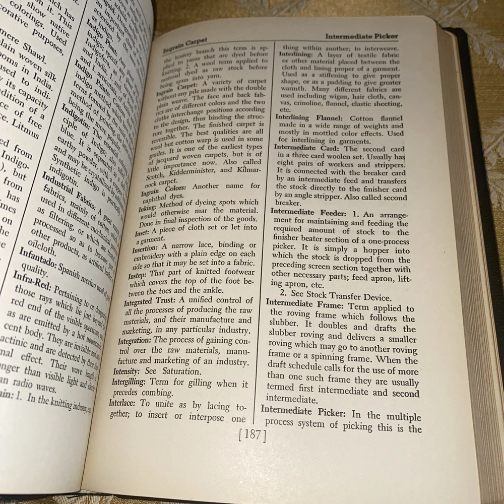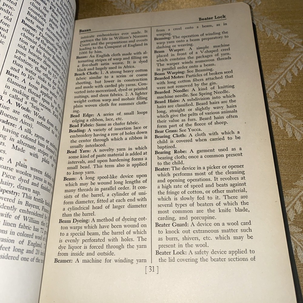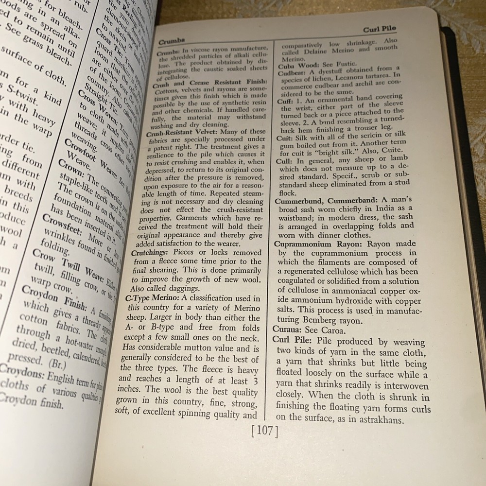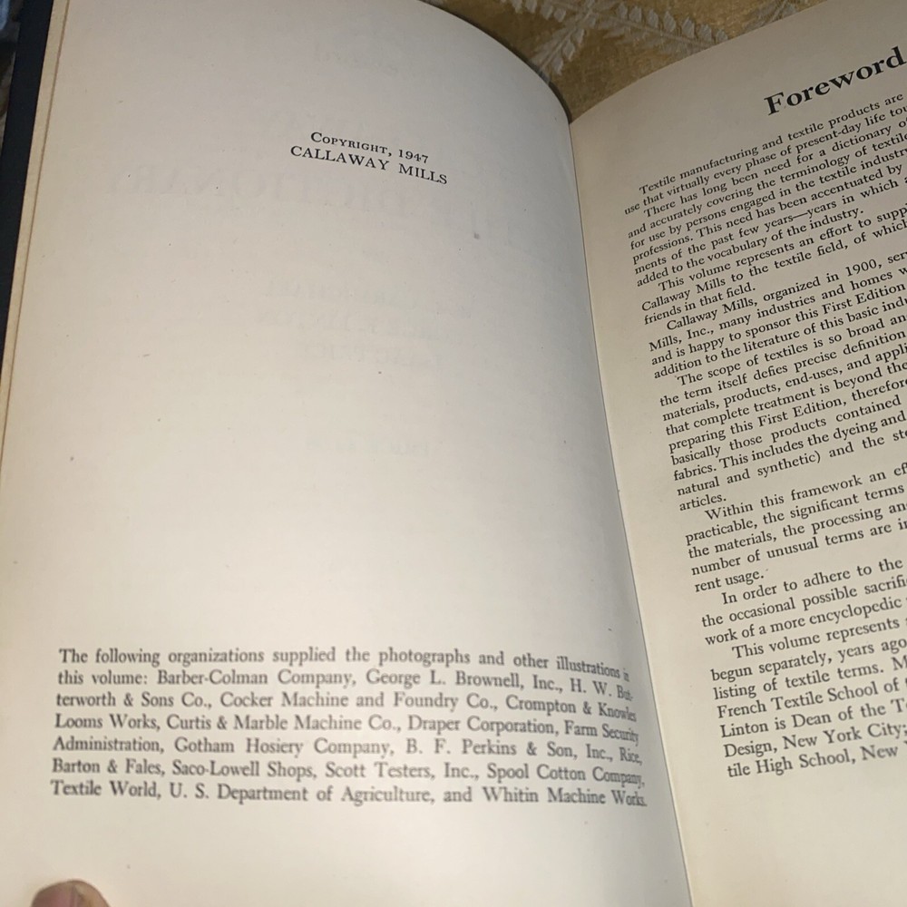 This is a first edition Callaway Textile Dictionary from 1947 written by John Abood. The book covers a range of textile-related topics and is highly informative. It has unique special attributes such as being an illustrated 1st edition, and is an original piece, not a facsimile. The publisher is Callaway Mills, and the book is written in English. The binding is made of genuine leather, and it was printed in the USA. This antiquarian and collectible book is perfect for anyone interested in textiles and their history. It is a valuable addition to any collection, and the information contained within is sure to be of interest to students, researchers, and historians alike.