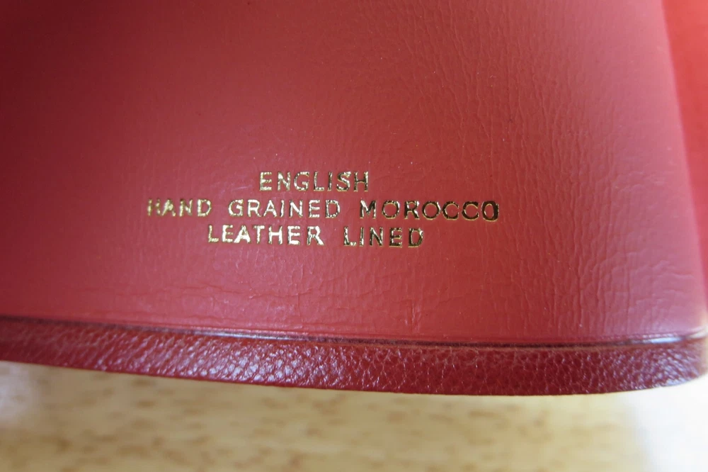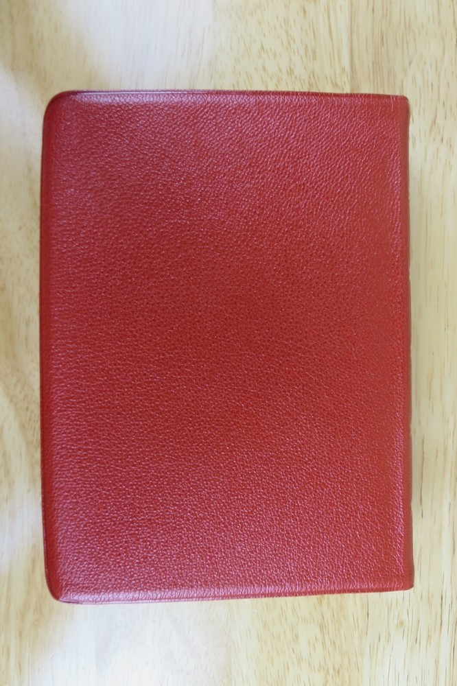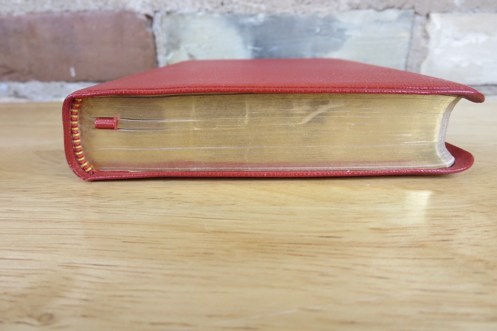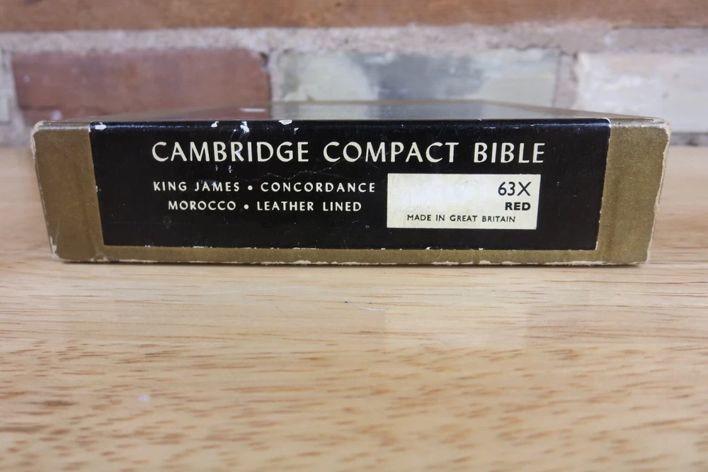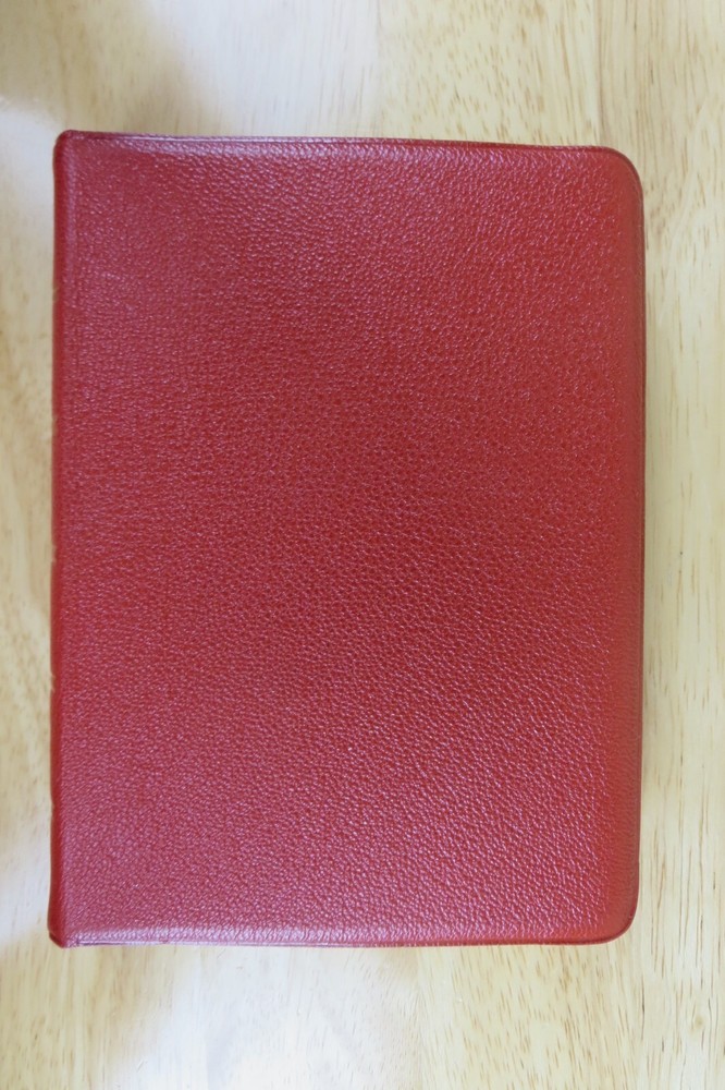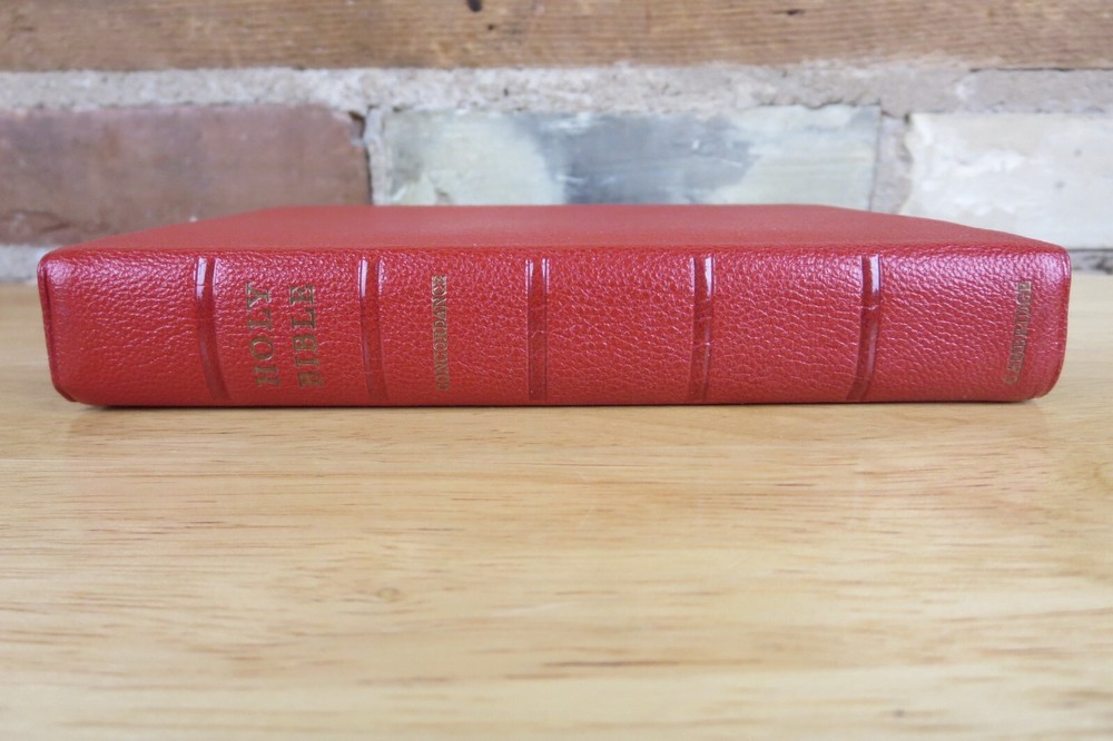 Cambridge University Press is well known for their fine Bibles. This listing is for one such Bible, a King James Version Compact Reference Bible in red hand grained morocco leather. The cover is soft a supple and features an edge lined construction. The Compact Reference is a complete reference Bible in a very portable size, it could fit in a large pocket. This hard to find Bible will not be available for long, buy it now before it is gone for good. Authorized King James Version Bold-figure center references Self-pronouncing index Concordance 8 colored maps with gazetteer Presentation page Black Letter New Testament Red Hand Grained Morocco Leather Leather Lined Semi-Overlapping Covers Ribbon Marker Gold Page Edges India Paper Approximate Cover Size: 6.00 x 4.50 x 1.00 inches