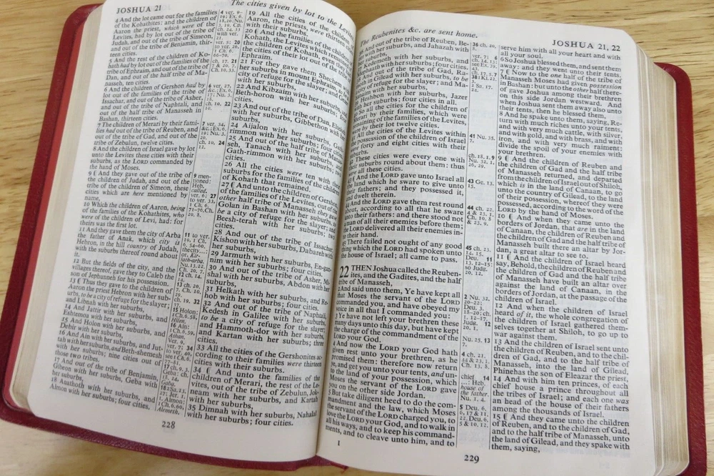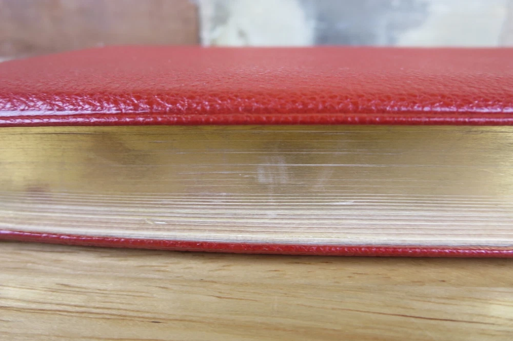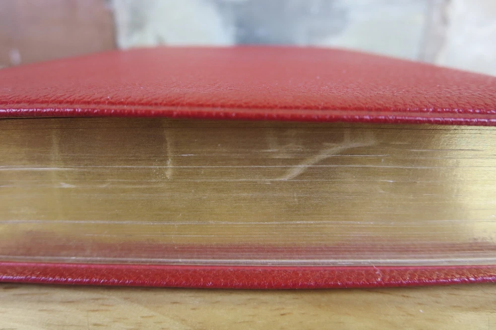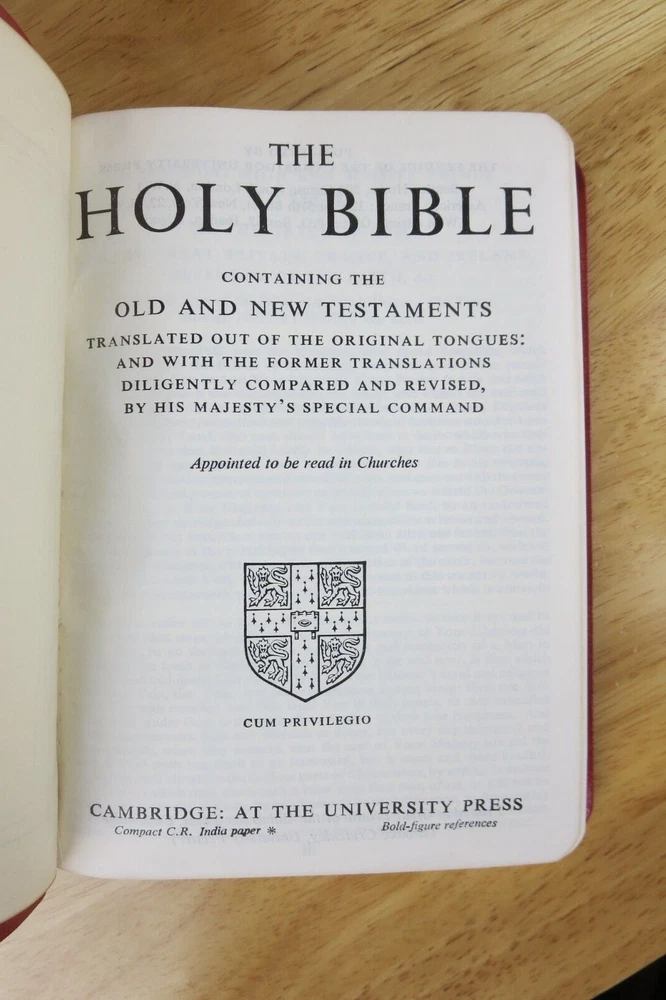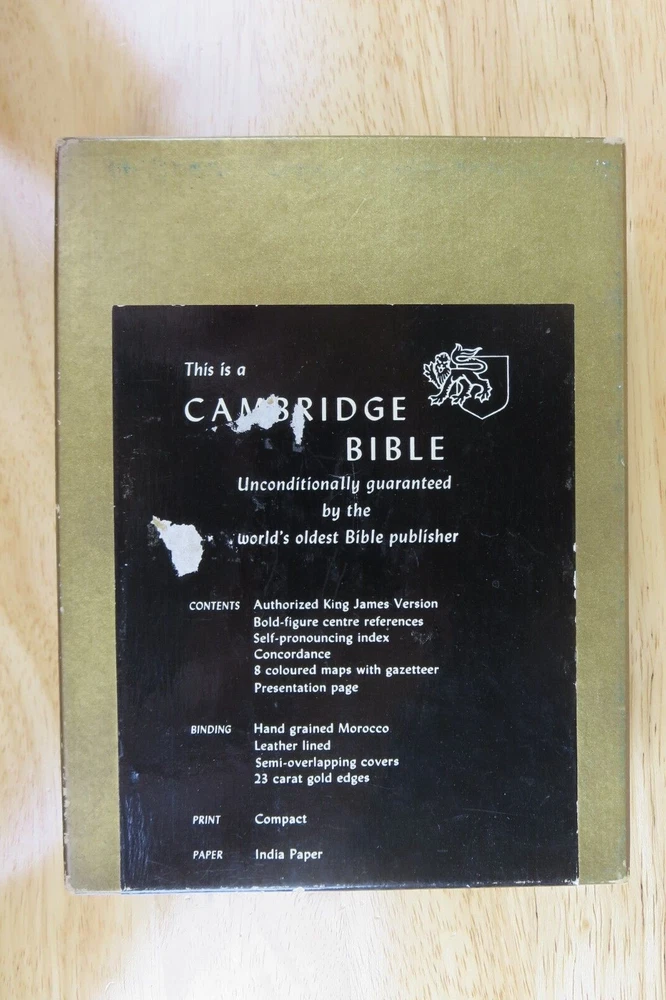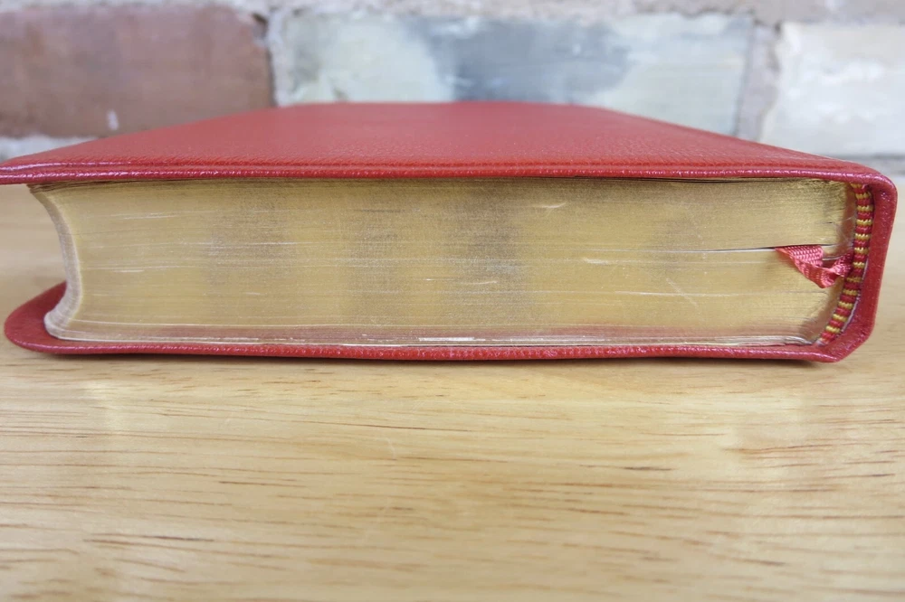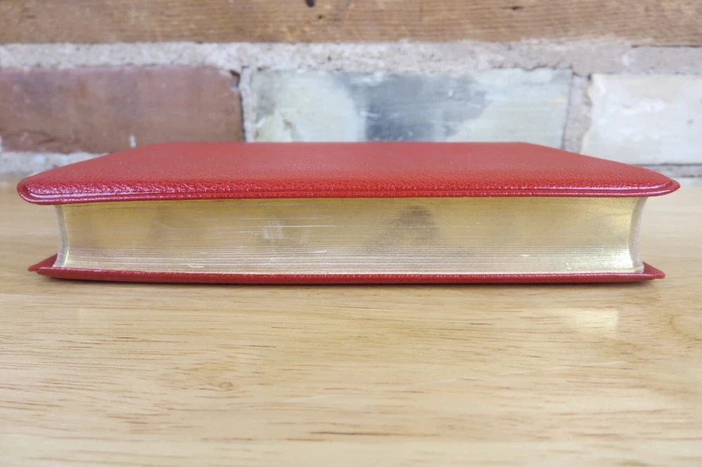 Cambridge University Press is well known for their fine Bibles. This listing is for one such Bible, a King James Version Compact Reference Bible in red hand grained morocco leather. The cover is soft a supple and features an edge lined construction. The Compact Reference is a complete reference Bible in a very portable size, it could fit in a large pocket. This hard to find Bible will not be available for long, buy it now before it is gone for good. Authorized King James Version Bold-figure center references Self-pronouncing index Concordance 8 colored maps with gazetteer Presentation page Black Letter New Testament Red Hand Grained Morocco Leather Leather Lined Semi-Overlapping Covers Ribbon Marker Gold Page Edges India Paper Approximate Cover Size: 6.00 x 4.50 x 1.00 inches