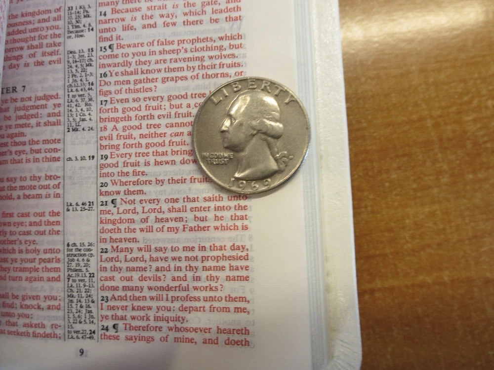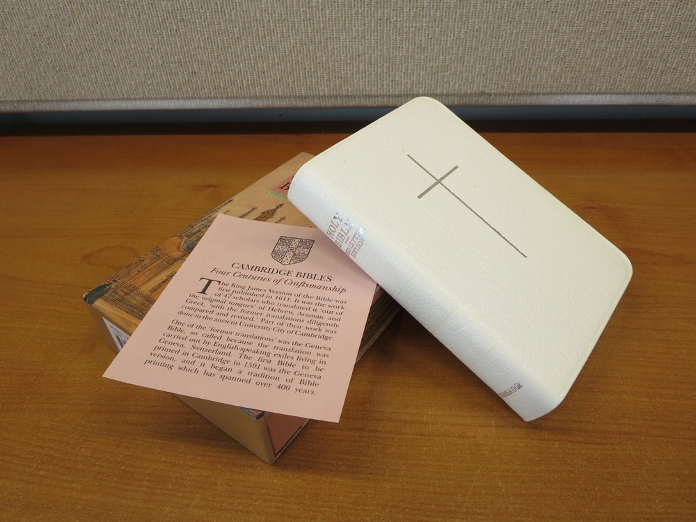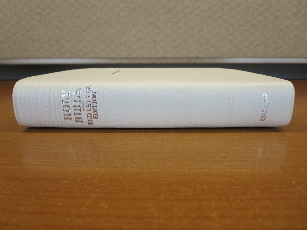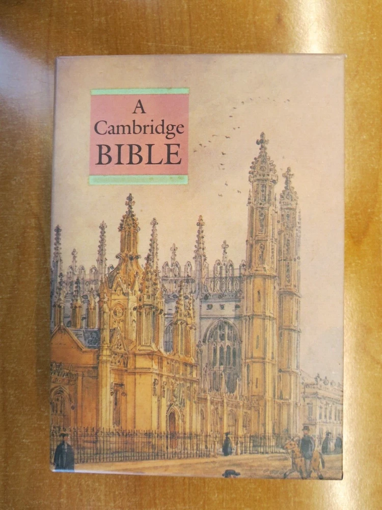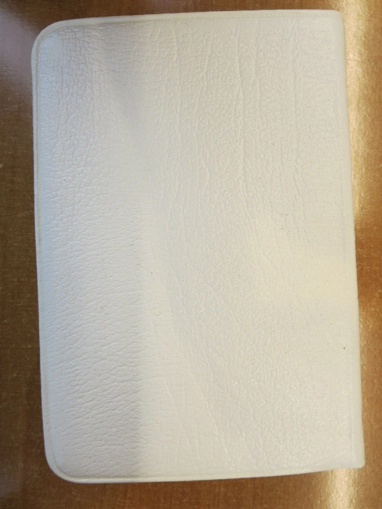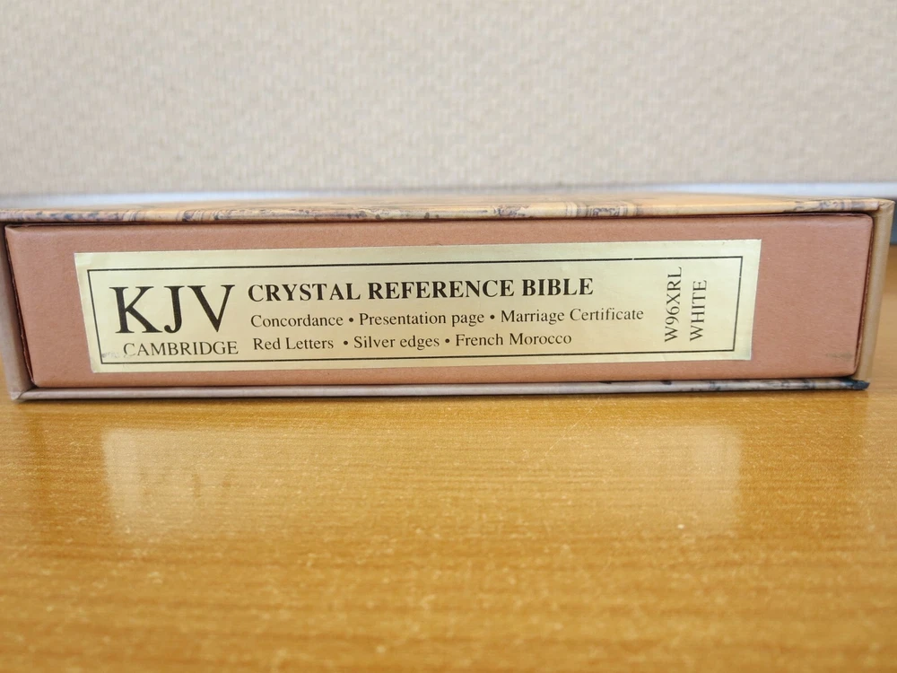 This hard to find Bible is in new condition and comes with preferred King's College double slip case box. The box does have mild shelf wear. Cambridge University Press needs no introduction, being one of the premier publishers of quality bound bibles. This listing is for the now out of print and very hard to find Cambridge Crystal Reference (AKA Pocket Concord) KJV Bible in White French Morocco. These Bibles are preferred by many fans of the KJV because the pagination exactly matches the full size Cambridge Concord reference Bible. Cambridge still makes a pocket KJV Bible but it uses a reduced Pitt Minion text and does not match the Concord Bibles. Published originally over 40 years ago, as the Crystal Reference Edition, this tiny book is one of the most compact reference Bibles ever produced. The type is small but bold and the Bible has exactly the same page layout and pagination as the renowned Concord Reference and Wide-Margin editions. It uses the classic Times Semi-Bold typeface, with pronunciation marks and red-letter text for the words of Christ. The Cambridge bold-figure cross-reference system leaves the text uncluttered and clear. The Bible includes a glossary, is printed on gilt-edged India paper and bound with a ribbon marker and presentation page. King James Version White French Morocco Leather Ribbon Marker Silver Page Edges Center Column Reference Red Letter Text Glossary Approximate Cover Size: 5.63 x 4.13 x 1.00 inches