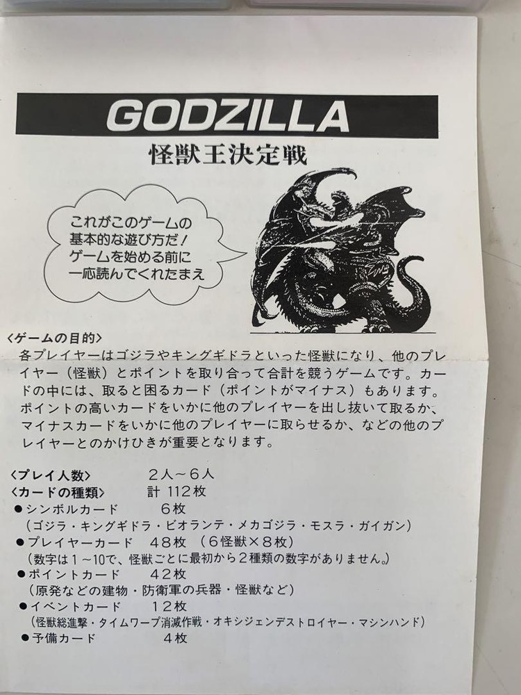 Item Title Card Game Monster King Battle Godzilla Payment Supports managed payments Please pay within 5 days after auction is finished. About Us We are located in Japan. It's our pleasure to make you happy by proposing our recommend item. If you have any questions or request about items, please feel free to ask us. International Buyers - Please Note: -Import duties, taxes, and charges are not included in the item price or shipping charges. These charges are the buyer's responsibility. -Please check with your country's customs office to determine what these additional costs will be prior to bidding/buying. -These charges are normally collected by the delivering freight (shipping) company or when you pick the item up - do not confuse them for additional shipping charges. -We do not mark merchandise values below value or mark items as - gifts - The US and International government regulations prohibit such behavior. Thank you for your understanding.