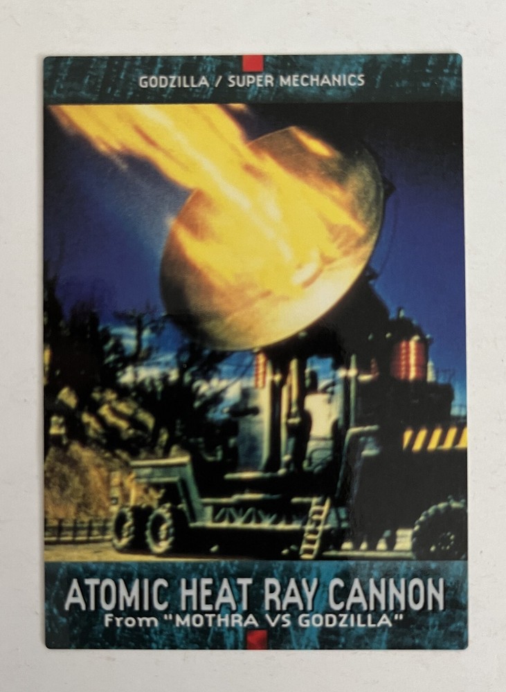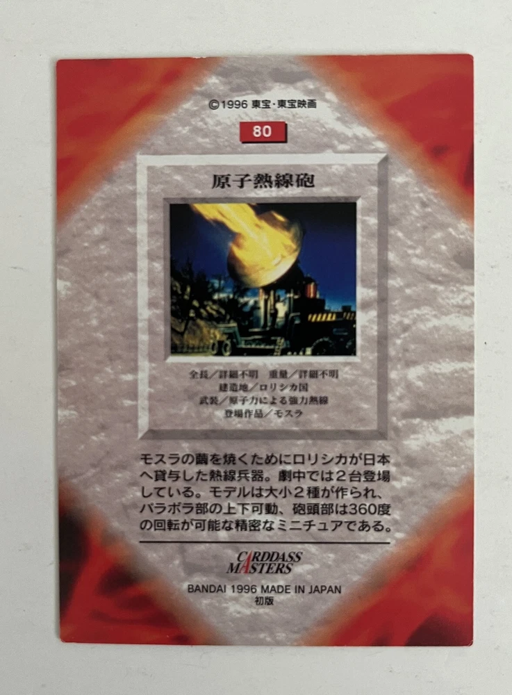 Carddass Masters Godzilla, Japanese non-sport trading card set (Bandai, 1996). Card #80, Atomic Heat Ray Cannon (from the movie Mothra vs Godzilla). Ex+/NM. Rare card set from Japan. From a smoke-free home. I combine shipping for multiple purchases. Please add the items you wish to purchase to your cart, and request a combined shipping total. Please do not pay before receiving a new invoice. Your shipping cost will be based on the destination and weight of the package.
