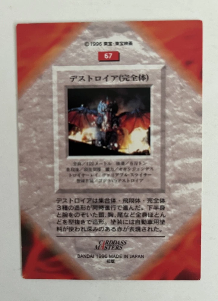 Carddass Masters Godzilla, Japanese non-sport trading card set (Bandai, 1996). Card #67, Destroylah (from the movie Godzilla vs Destsroyah). Ex+/NM. Rare card set from Japan. From a smoke-free home. I combine shipping for multiple purchases. Please add the items you wish to purchase to your cart, and request a combined shipping total. Please do not pay before receiving a new invoice. Your shipping cost will be based on the destination and weight of the package.