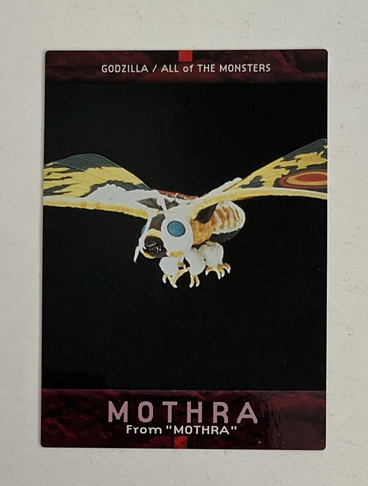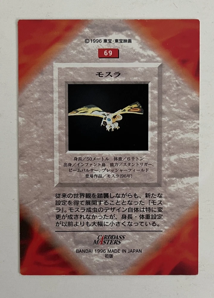Carddass Masters Godzilla, Japanese non-sport trading card set (Bandai, 1996). Card #69, Mothra (from the movie Mothra). Ex+/NM. Rare card set from Japan. From a smoke-free home. I combine shipping for multiple purchases. Please add the items you wish to purchase to your cart, and request a combined shipping total. Please do not pay before receiving a new invoice. Your shipping cost will be based on the destination and weight of the package.