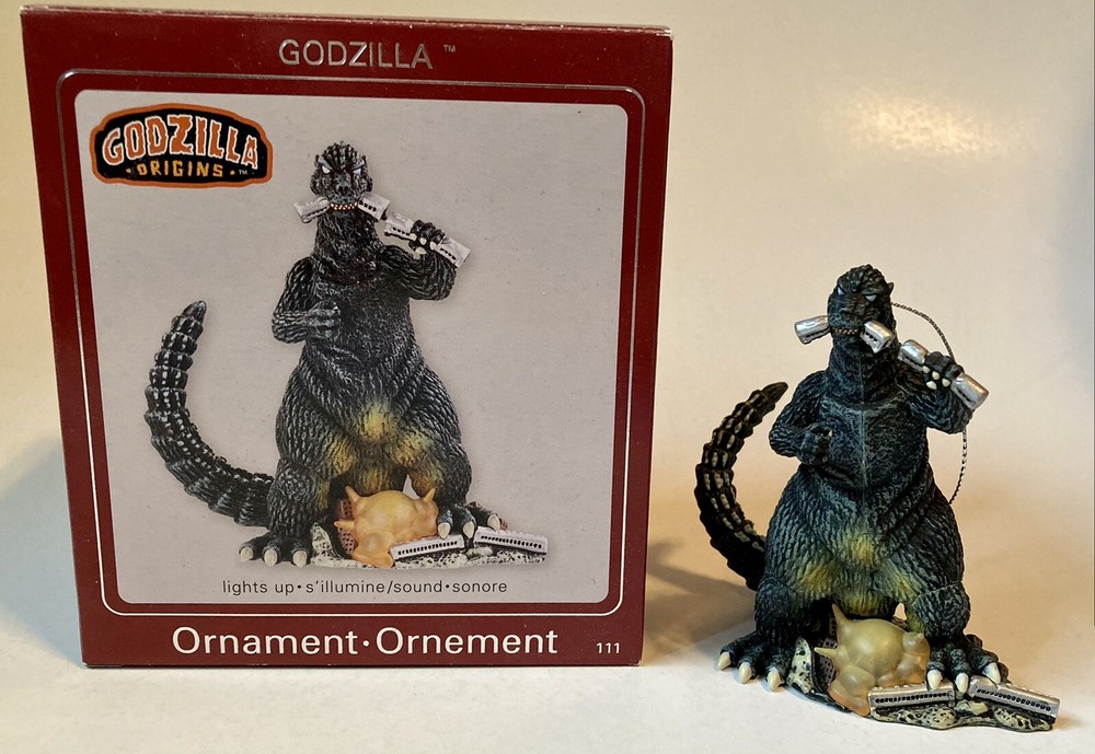 This is a 2009 American Greetings Heirloom Godzilla Origins light and sound ornament. Ornament and box are in excellent condition from a non smoking home. Needs new batteries for light/sound to work