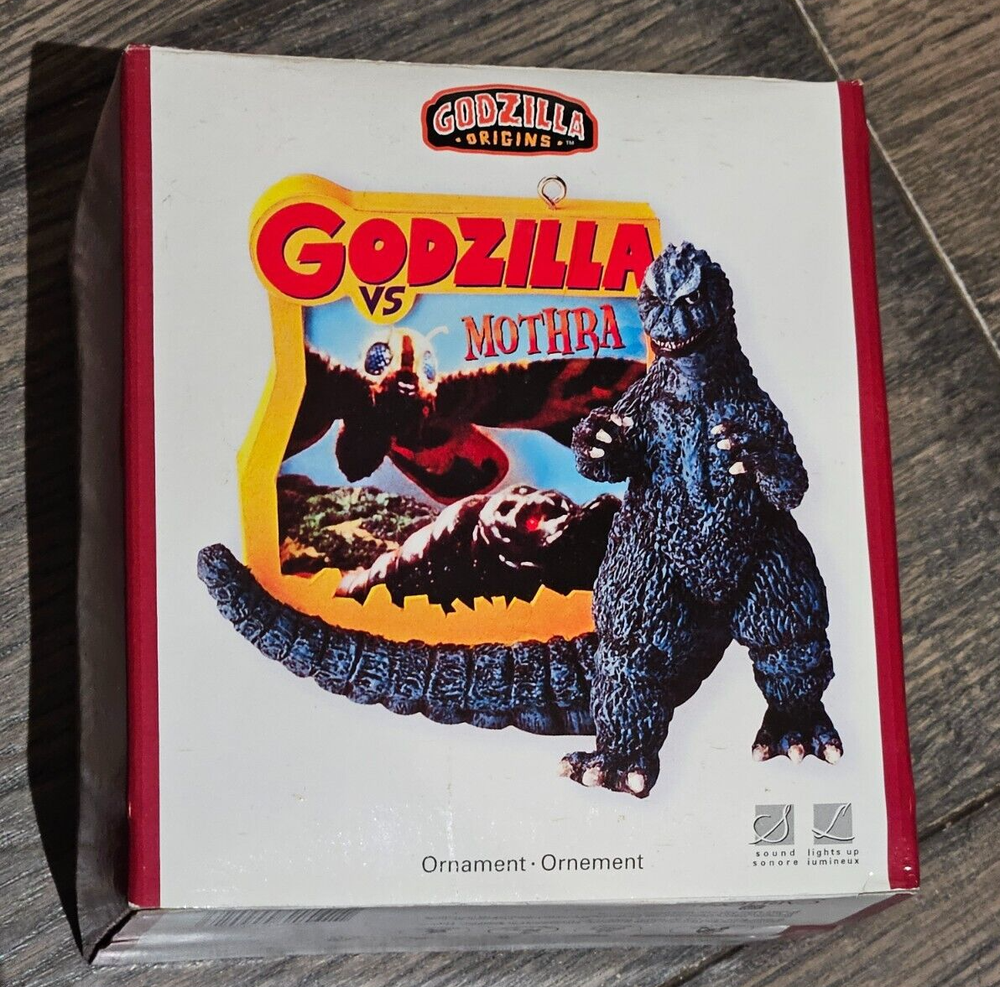 This Carlton Heirloom ornament features Godzilla and Mothra in a battle scene, with light-up and sound effects. It is a medium-sized multicolor ornament from the year 2007, part of the Godzilla franchise. The ornament is an original design by Carlton Cards, made in China, and weighs 20 oz. Perfect for adding a unique touch to your Christmas tree or holiday decor collection.