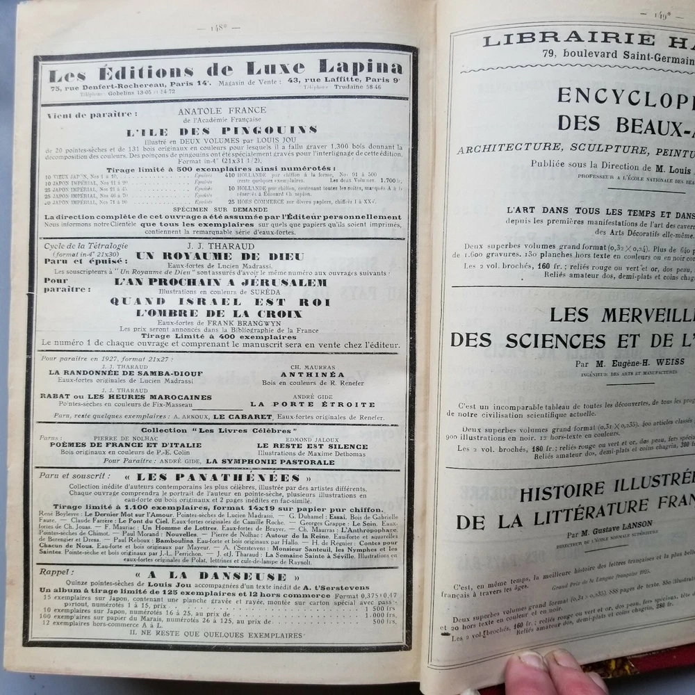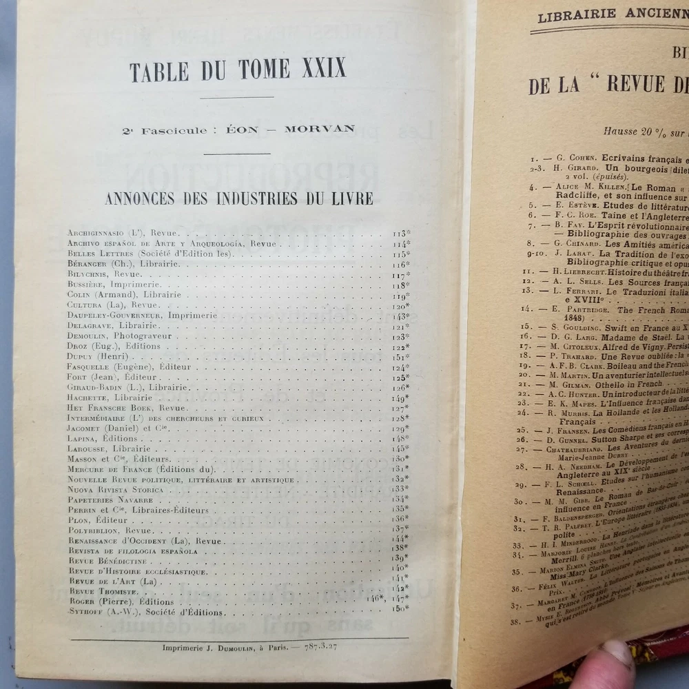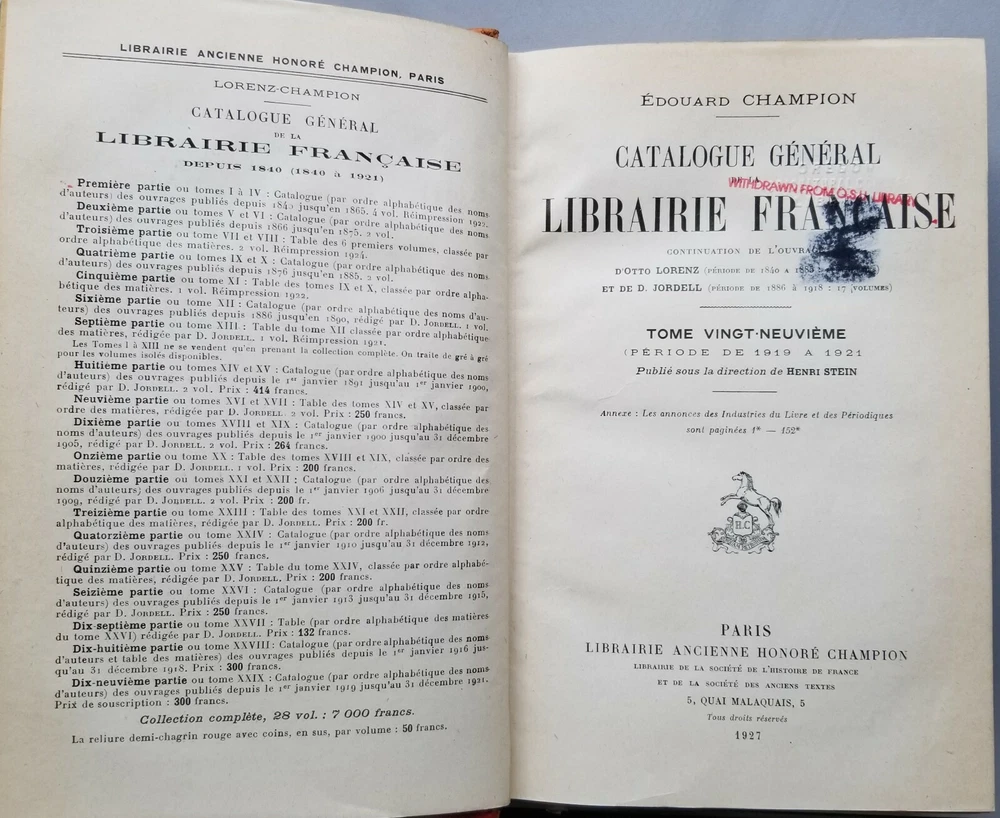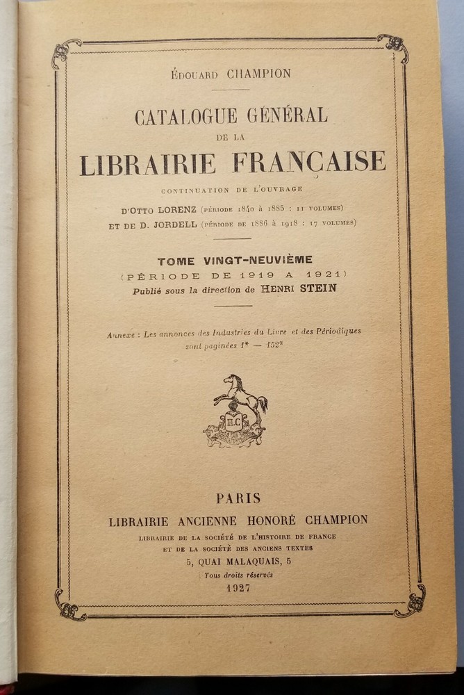This vintage book from 1927 is a treasure trove of French literature. With leather binding and published by Paris Librairie Ancienne Honore Champion, this original piece is a must-have for collectors of antiquarian books. The Catalogue General De La Librairie Francaise 1919-1921 A-Z covers a wide range of topics, including reference, literature, and more. It is written in French and contains special attributes such as being an ex-library edition. This book is a rare find and perfect for anyone interested in exploring the literary history of Europe.