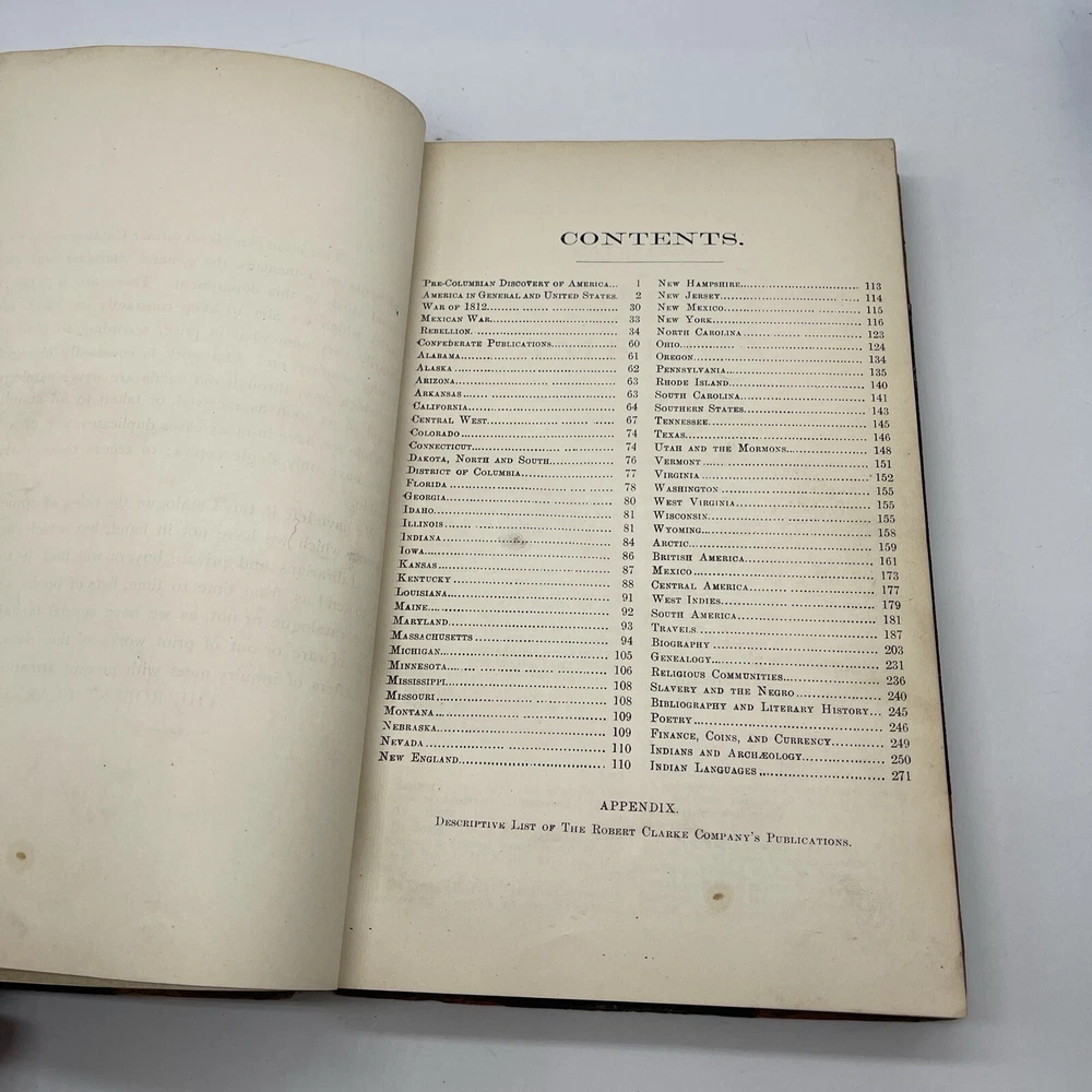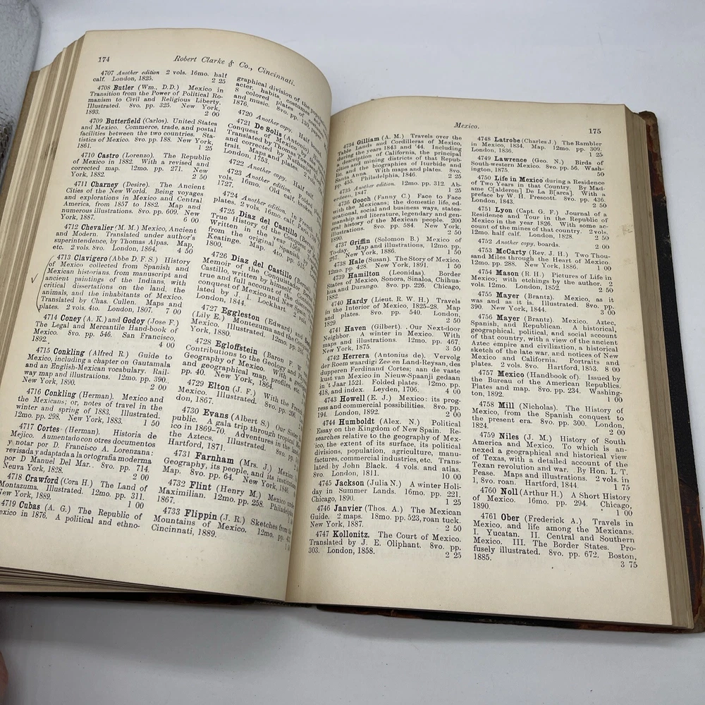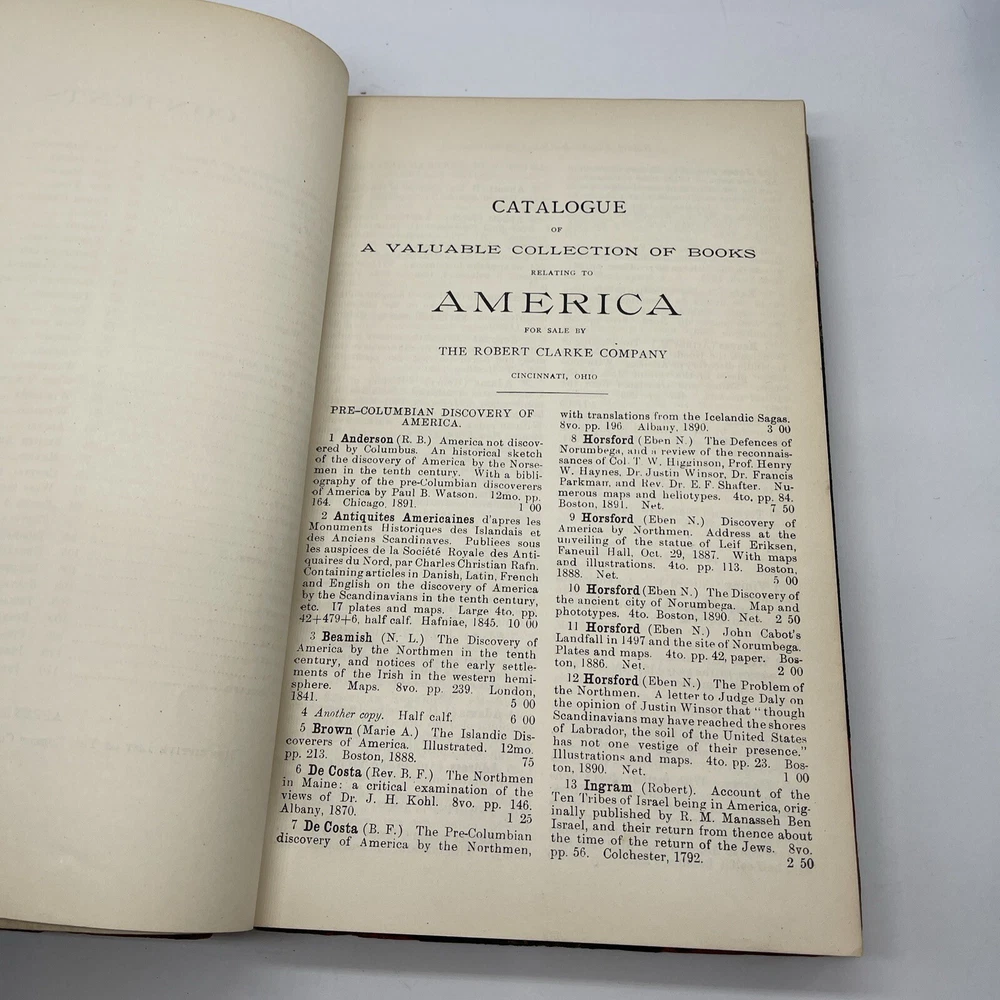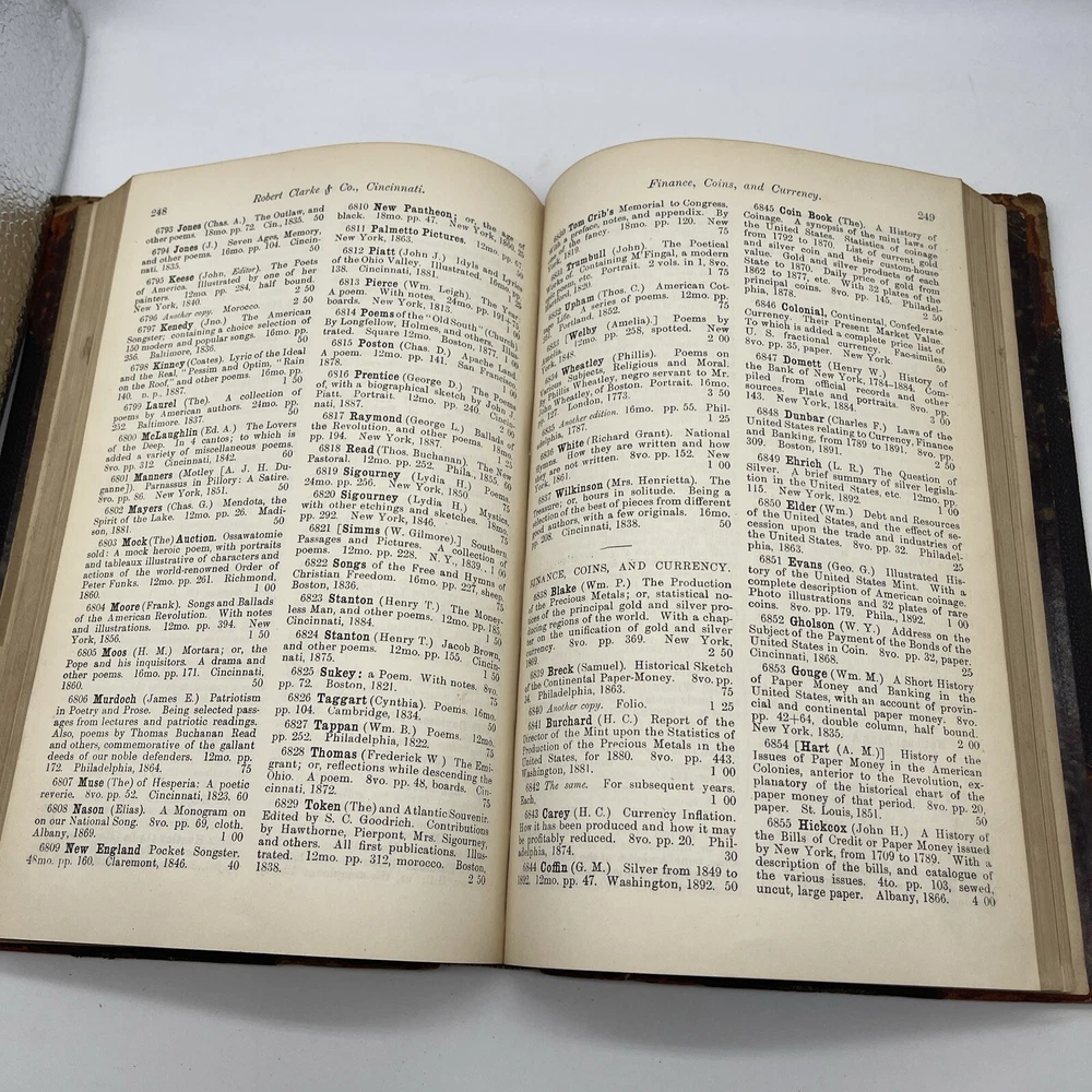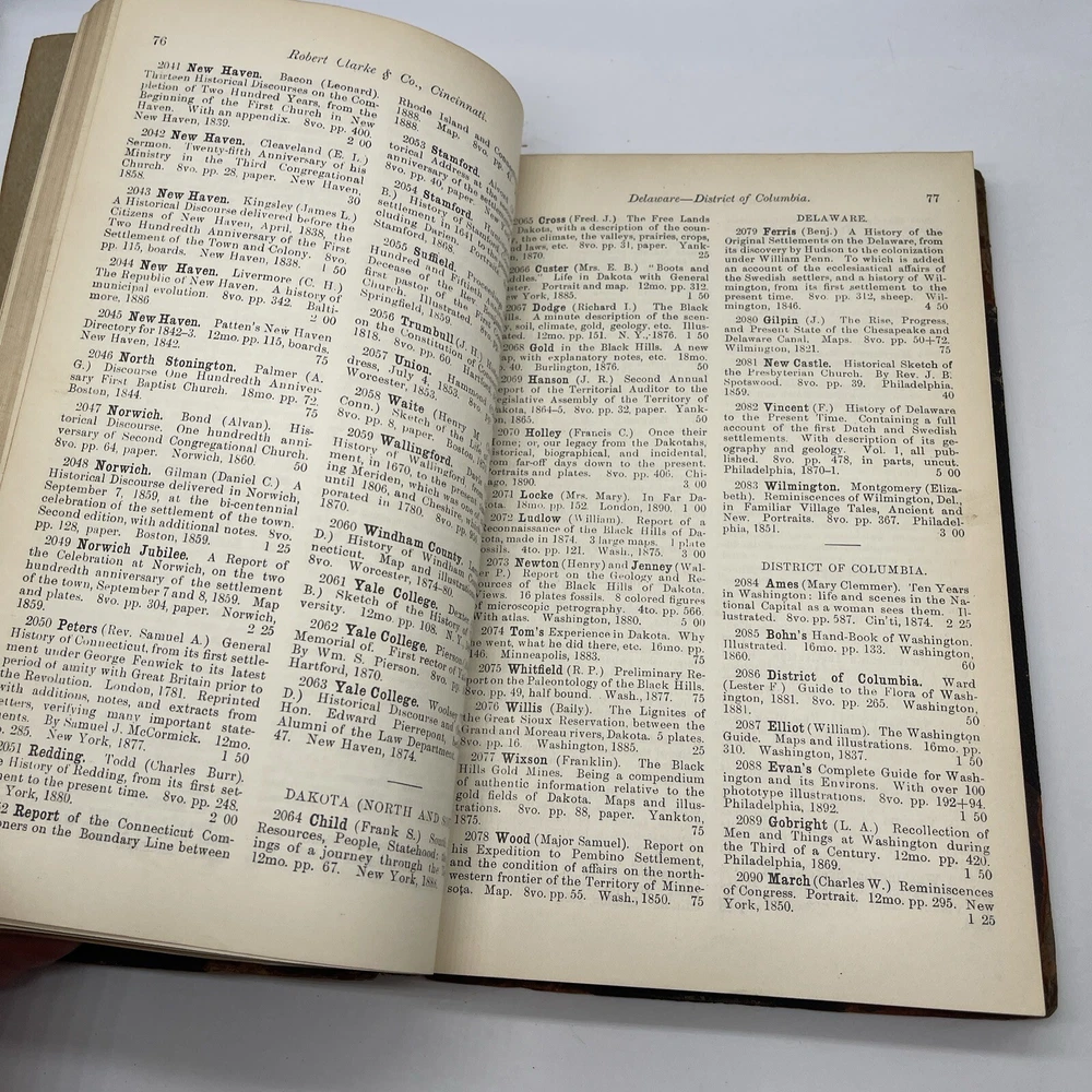 This catalogue presents a unique collection of valuable books and pamphlets curated by Robert Clarke. The collection features works that cover a diverse range of topics, including reference, language, and history. The bindings of the books are made of high-quality leather, which adds to their overall aesthetic value. The place of publication for most of the works in the collection is Cincinnati, which makes them a valuable piece of American history. The books and pamphlets are all original and not facsimiles. The collection is a must-have for collectors and enthusiasts who value unique and rare works.