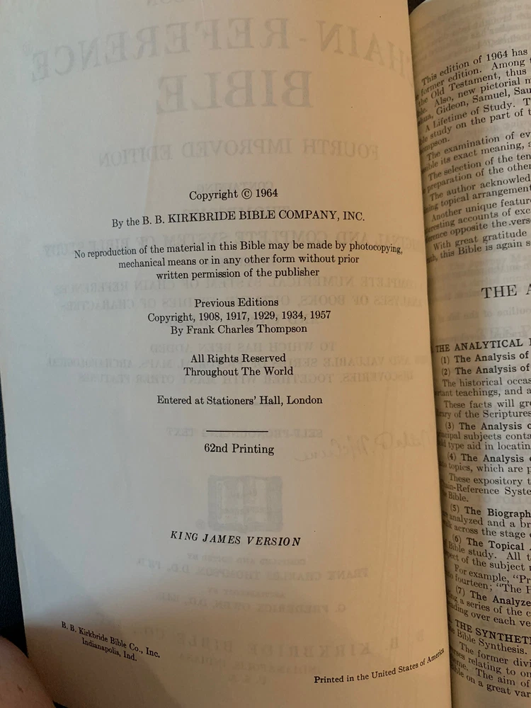 Chain Reference Bible KJV Thompson 1964 Bonded Leather Lined Kirkbride Black. See photos for condition There is a page torn out at the front There is some writing but not at all extensive throughout