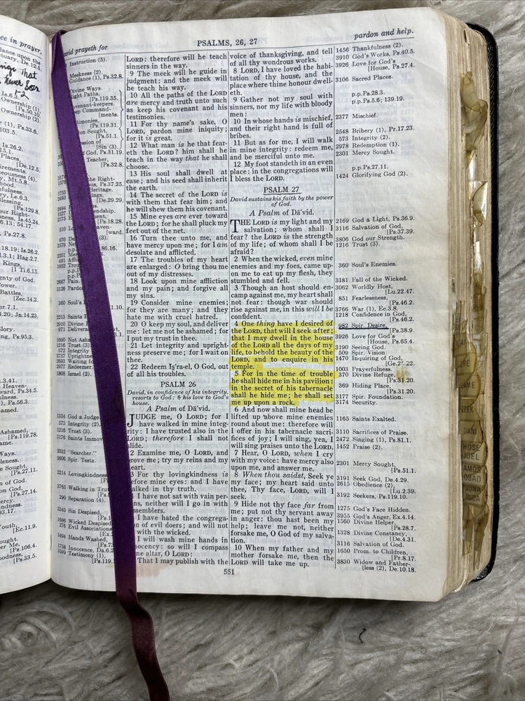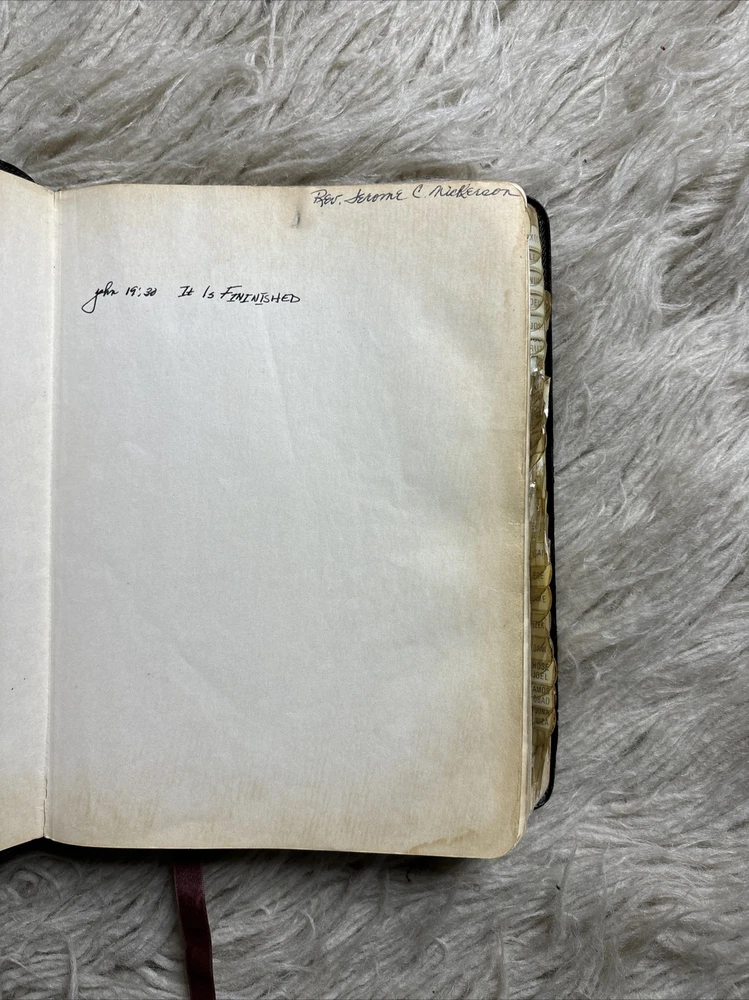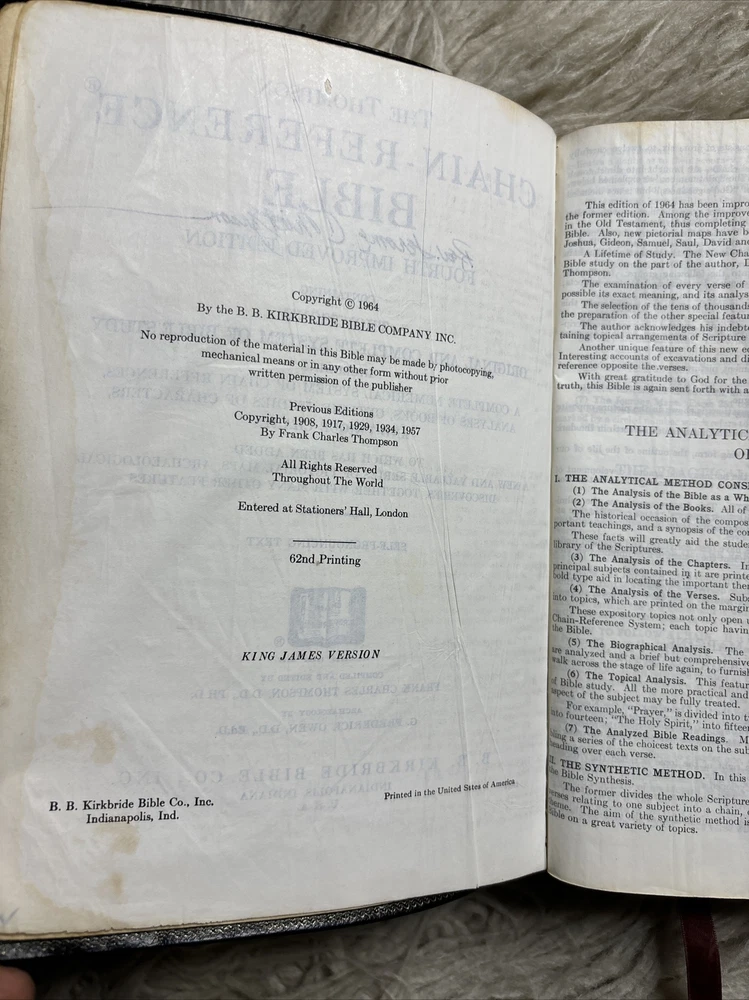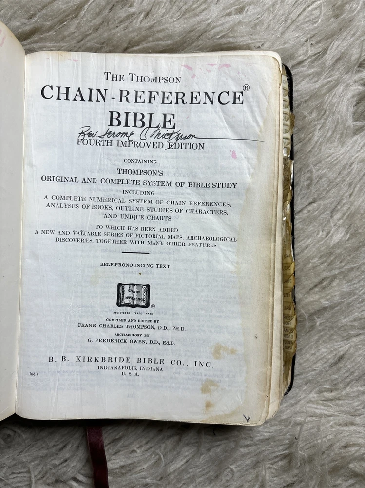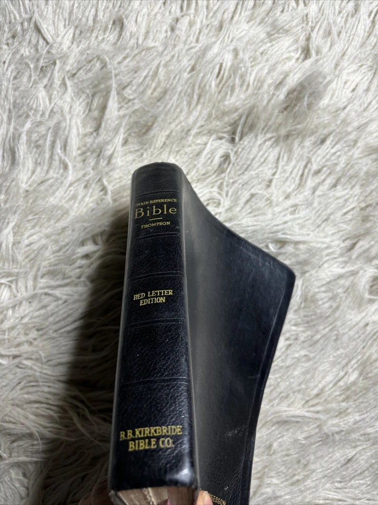 Chain Reference Bible Thompson Red Letter Edition B B Kirkbride Genuine Leather. There are some discoloration on some of the pages, pen and marker markings. Please view all of the pictures for the condition Ds