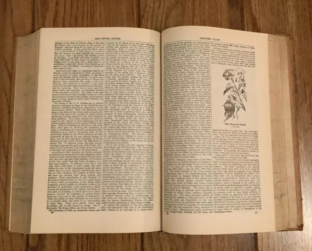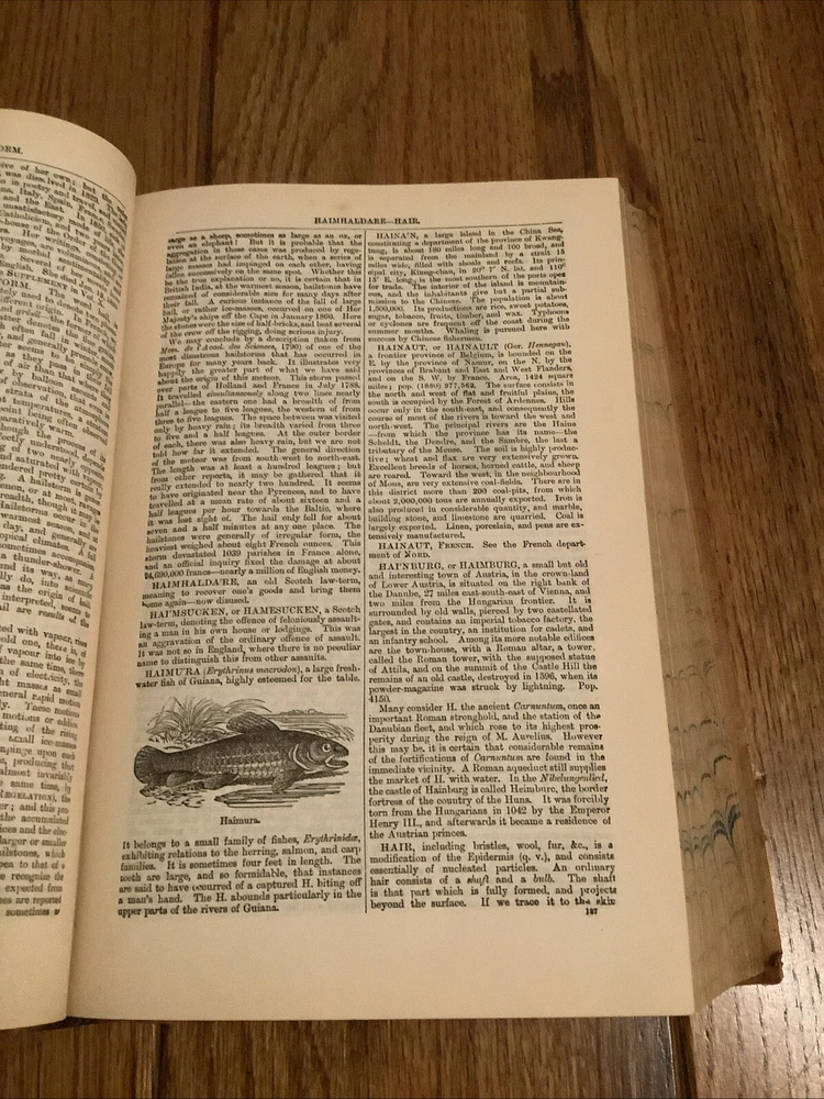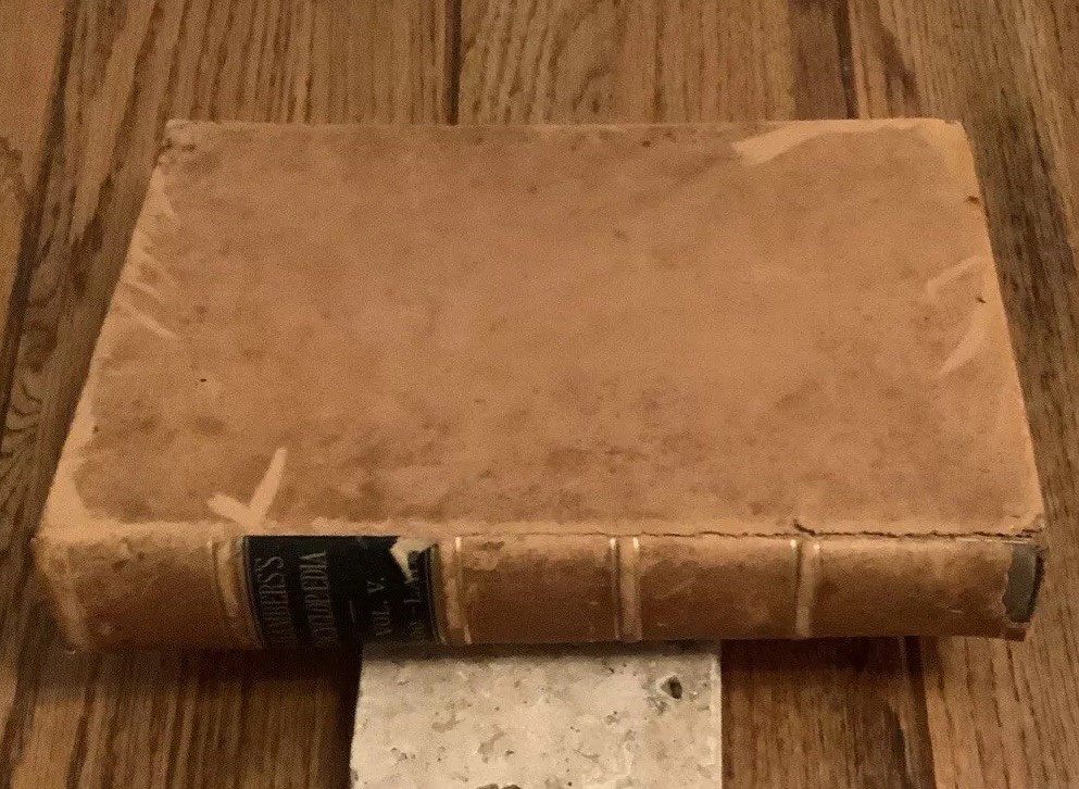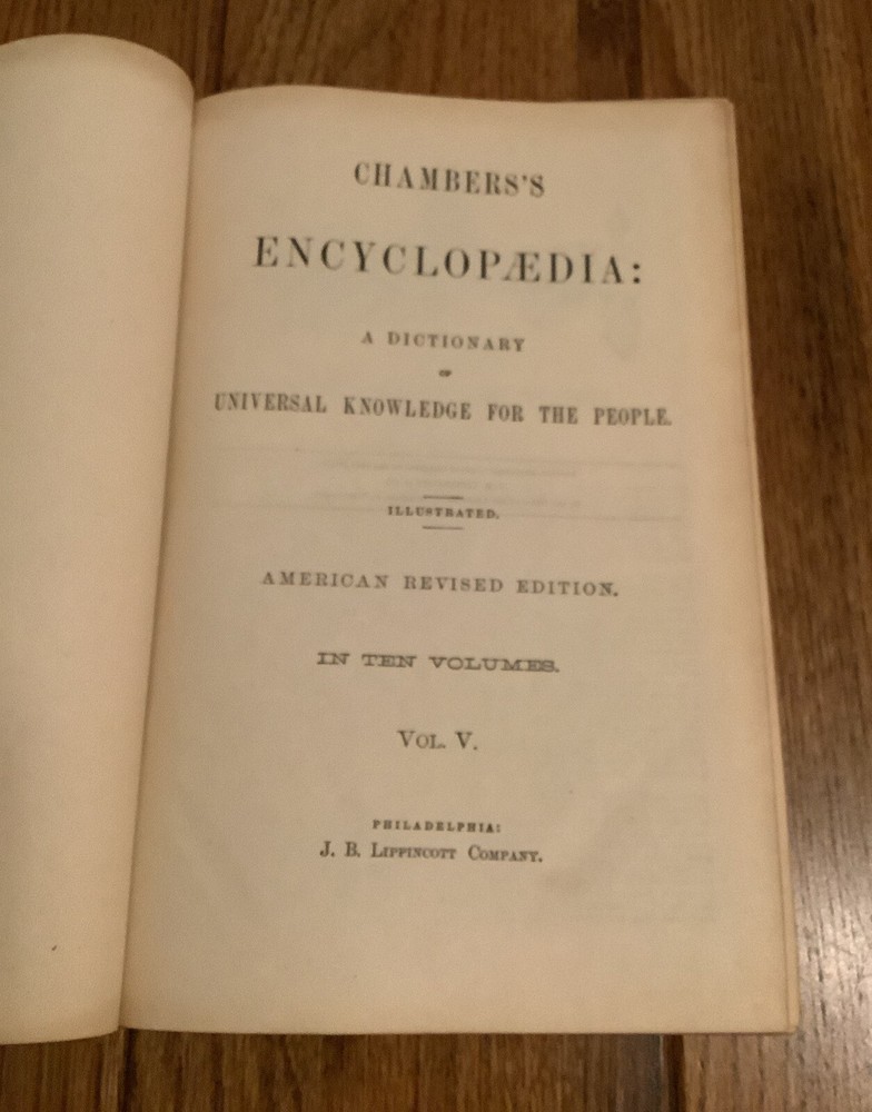 Chambers’s Encyclopaedia: A Dictionary Of Universal Knowledge for The People. Volume 5 out of a set of 10. This is an American Edition. Published by J. B. Lippincott Company. {ANTIQUARIAN & VINTAGE 1875} The condition of this full leather covered book is acceptable. Please note the leather covers have scars worn corners, wear to the edges, and the spine cover has wear, piece missing at the bottom with gilt lettering and design. The text blocks are marbled. The end pages have some tanning. The pages have tanning and no marks were noted. You may find a small tear on some of the pages. The text is full of black and white drawings. The binding is sound overall, a broken front hinge. No dust jacket was issued. The text is written in dictionary form it begins with good-good conduct through the beginning of the letter L. What a fascinating book!! This is a lovely vintage book!!!!! Please examine all of the photographs carefully. Proceeds to the Blount County Public Library in Maryville, Tennessee. Thank you for visiting our store!vs