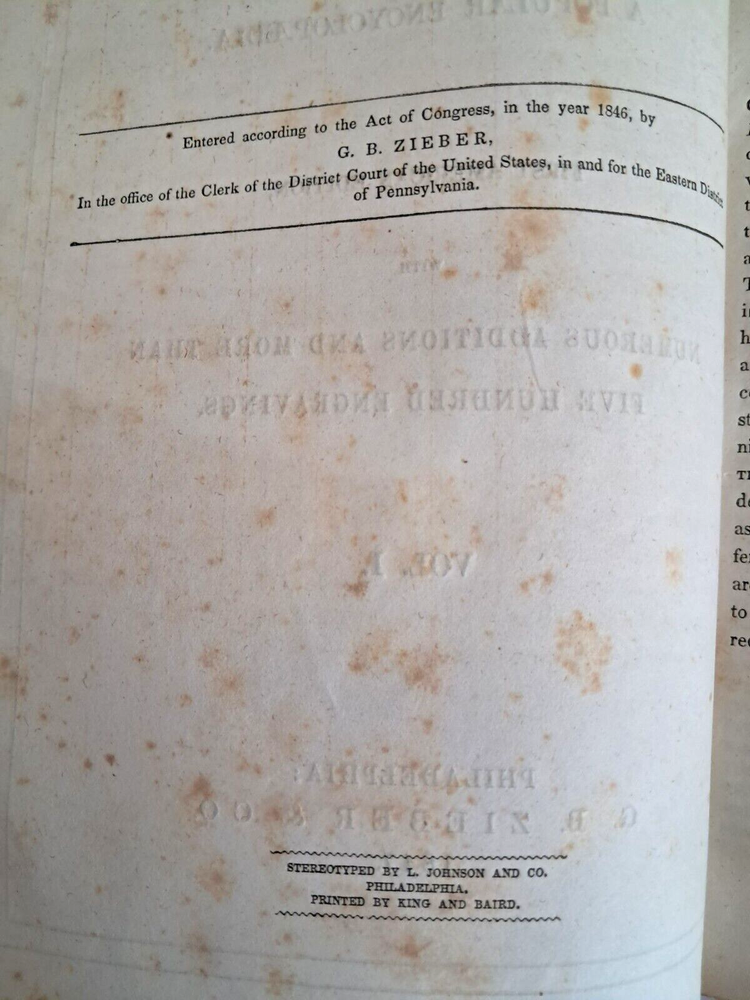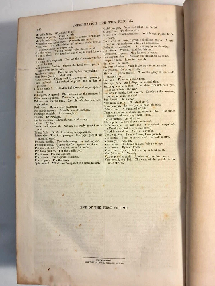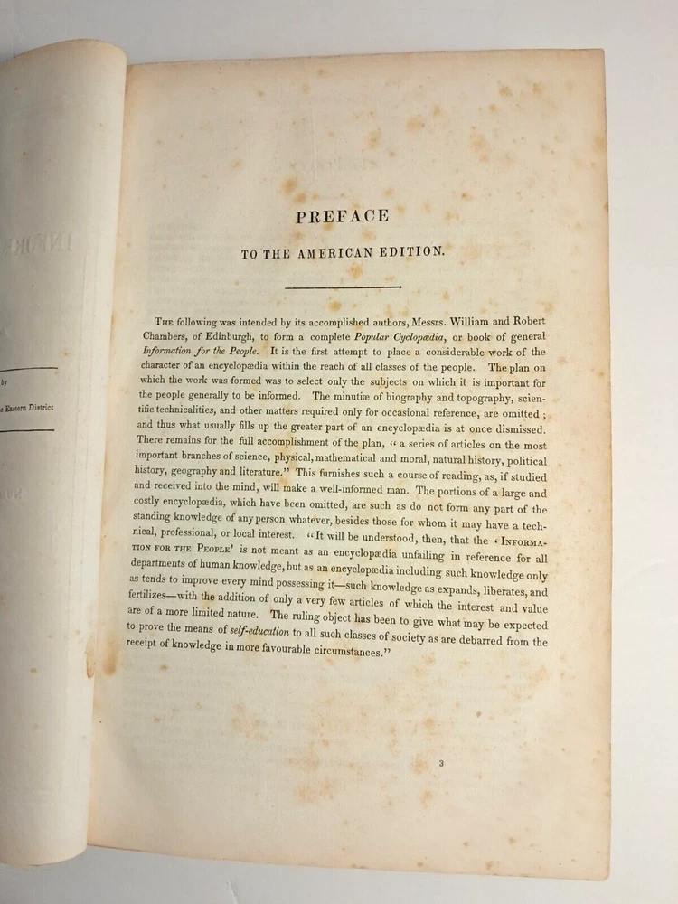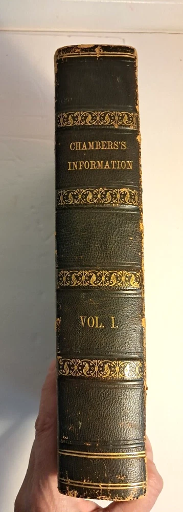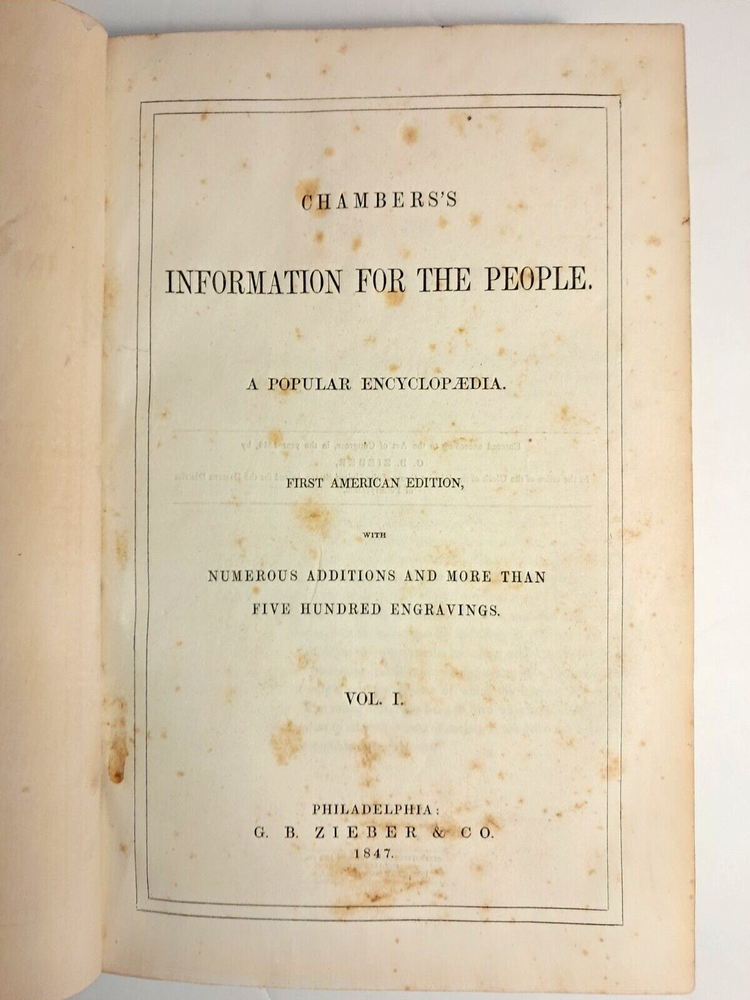 Please see all photos for condition, stains, damage and wear. Antique Book. Chambers's Information for the People Vol. I . The American Edition. Published by G. B. Zieber & Co. Philadelphia,PA USA 1847. 840 Pages. Hardcover, partial black leather. Weighs 2 pounds 13 oz. 10.5" x 7" x 2". Ships via USPS Mail. Author: Chambers, William and Robert. Printed by King and Baird.