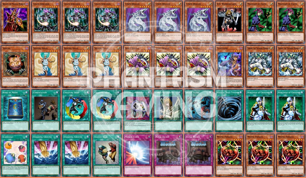 Deck Name: Chaos Recruiter (Chaos Return) (A) # Main Deck (40) 1 - Breaker the Magical Warrior 3 - Chaos Sorcerer 3 - Cyber Dragon 1 - D.D. Warrior Lady 2 - Magician of Faith 3 - Mystic Tomato 1 - Sangan 3 - Shining Angel 3 - Spirit Reaper 1 - Tsukuyomi 2 - Zaborg the Thunder Monarch 1 - Book of Moon 1 - Confiscation 2 - Creature Swap 1 - Enemy Controller 1 - Graceful Charity 1 - Heavy Storm 1 - Mystical Space Typhoon 2 - Nobleman of Crossout 1 - Scapegoat 2 - Smashing Ground 1 - Snatch Steal 1 - Mirror Force 2 - Royal Decree You will receive all of the following cards listed above. Most cards will will be in near mint condition. In the case of certain older cards we will do our best but some cards may be light or even moderatly played in extreme condtions. Those conditions being the card has not been reprinted in a number of years and con no longer be easily purchased in light or near mint condition. Set, Rarity, and Edition will vary and cannot be special requested. These lists are constructed with least expensive rarities we have available in stock. All cards are play legal copies. Note: If purchasing a Yugioh Deck all Speed duel cards are 100% legal at all levels of play. Store Policies Here at PMG_LLC , we pride ourselves on having the best customer service around. If you have any questions or can't seem to find something that you want please do not hesitate to contact us. We will do our best to respond to all questions within one business day. Hours of Operation: Monday-Friday: 2:30pm - 10:00pm Saturday- 10:00am - 8:00pm Sunday 11:00am - 5:30pm Note: We are closed all national holidays. Info: Thank you for choosing PMG_LLC . We appreciate your business. We ship Monday through Friday to make sure you get your deck as quickly as possible. All orders priority orders can use combined shipping. In order to use the combined shipping your whole purchase needs to be checked out as one order. We ship once we have received your payment and payment has cleared. As always if you have any questions or concerns please feel free to contact us via email. Shipping Information: We ship Monday through Friday, barring national holidays during which the United States Postal Service is closed. If you purchase a card on Friday or Saturday please bear in mind it will not ship until Monday. US Shipping: First Class Mail : Free. Comes with tracking information. Priority Mail with Delivery Confirmation : $9.99 All orders are shipped in appropriate protective material inside bubble mailers. International Shipping: We do not offer international Shipping Return Policy: You must return items sold and fulfilled by PMG_LLC within 30 days of delivery to be eligible for a refund. Returns which are damaged in the mail due to improper return packaging will receive partial refunds. We will process a full refund for all items returned in their original condition. In order for us to process your full refund you must include the full name associated with the order as well as the eBay order number inside the return packaging. We will not process returns which do not include the buyer's name and order number. Requirements: Please return items with the original plastic packaging. Failure to do so may result in a partial refund. Also you must inform us of any returns you may wish to process before sending them back. Any items simply send back to us without prior contact will not be eligible for refunds. Important Notes Remember that to benefit from our domestic combined shipping on priority orders you must to pay in a single payment. If you place two separate priority orders you will be charged the $7.50 shipping fee for both orders. If you place multiple orders for Priority shipping you will be charged the corresponding shipping costs for each order, even if you place the orders on the same day. We do not refund shipping costs as we tend to package orders throughout the day and may not notice that you would otherwise have qualified for combined shipping. We want to provide you with 5 Star service and earn your Positive Feedback, so if for any reason you are not happy with your transaction, contact us before leaving feedback. Business Day - Our business day runs from Monday to Friday from 9am to 4pm, excluding US national holidays. Any orders placed or payments cleared less than 4 hours before the close of business will be considered orders from the following business day.