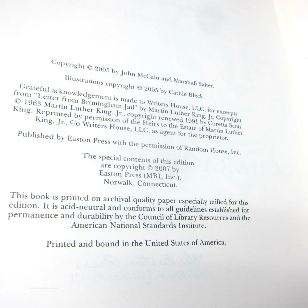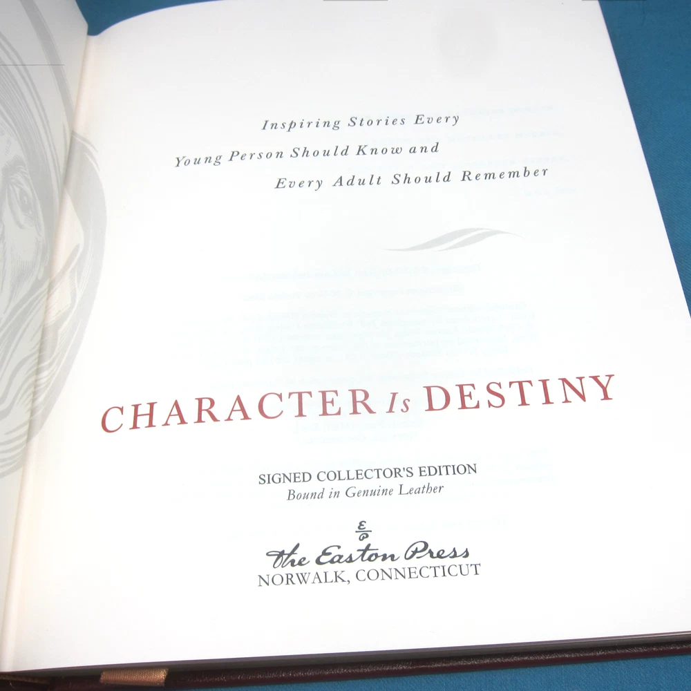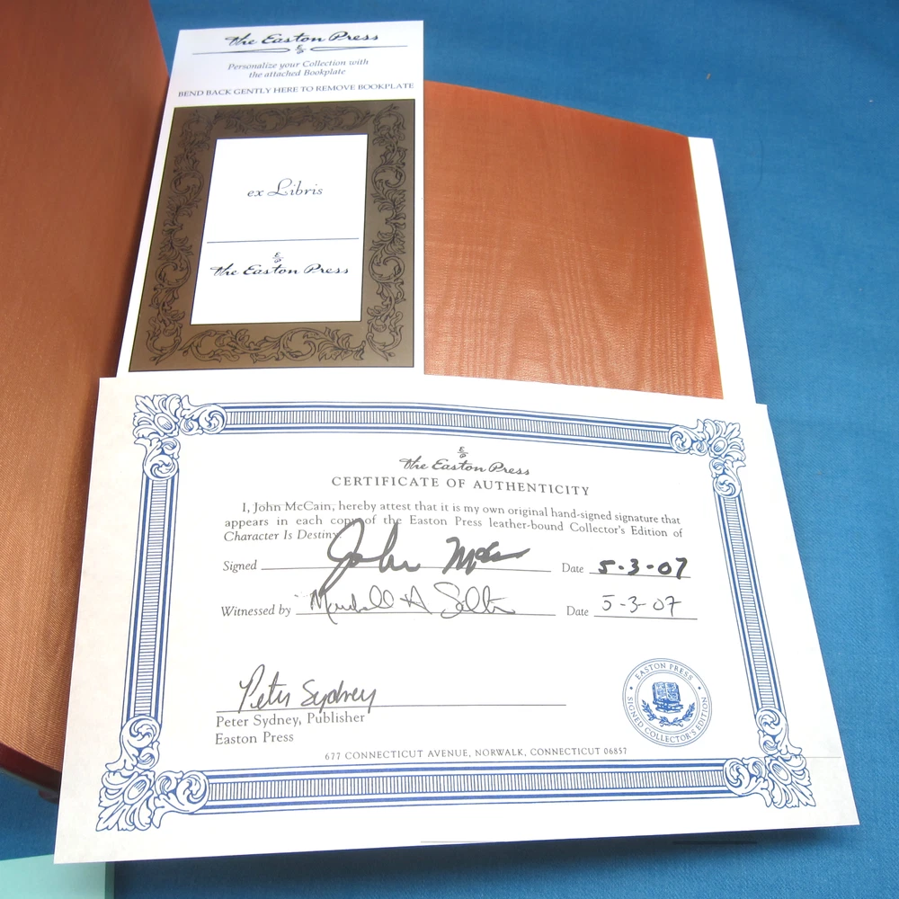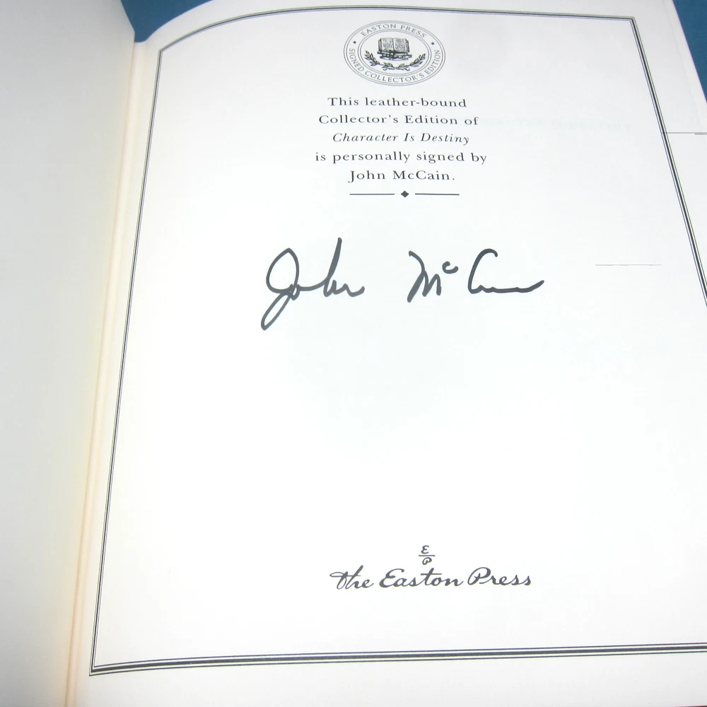 Character is Destiny, by John McCain. Beautiful leather-bound edition, signed by John McCain, and including a certificate of authenticity verifying the signature. Includes an unused Easton Press bookplate. Like new condition, never read. Gilt is bright and fully intact. Leather binding is in mint condition.