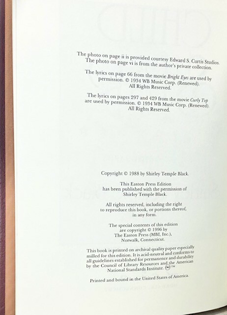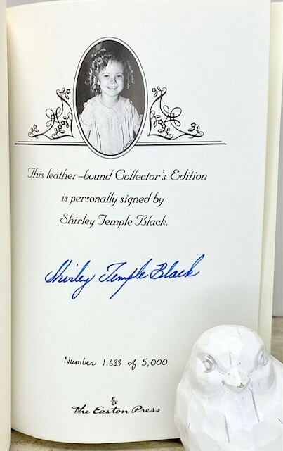 Child Star an Autobiography SIGNED by SHIRLEY TEMPLE Black #1633 of 5000 Easton Press Condition and Terms This book is in excellent, unused or very gently-used condition. There are no attached bookplates or embossed seals. Sharp corners, no obvious scuffs or rubs. There are little to no scratches/marks to the gilded page-edging (see photos). Please see the photographs for best description. Please review all photos carefully before purchasing, and feel free to ask questions if the photos do not suffice. We can also provide additional photos upon request. Synopsis Shirley Temple Black-- the quintessential child star of the 30s and 40s--tells in her own words the colorful story of her life as an actress. Born in 1928 in southern California, Shirley Temple was extraordinary from the start. At the age of three, she began acting, often in exploitative films directed and produced by some abusive studio executives. But Shirley's talent and perseverance could not be thwarted, and she soon entered a fruitful relationship with Twentieth Century Fox. Before long she was making films with the top stars of the day, including Gary Cooper, Carole Lombard, Lionel Barrymore, Joel McCrea and many others. There was something magical about Shirley Temple that cheered the soul of America during the Depression. She was the number one movie star of the nation for four consecutive years, from 1935 through 1938. In Child Star Shirley Temple Black reveals the whole story, the ups and downs of life as a Hollywood prodigy--including numerous kidnap threats and even a murder attempt against her.