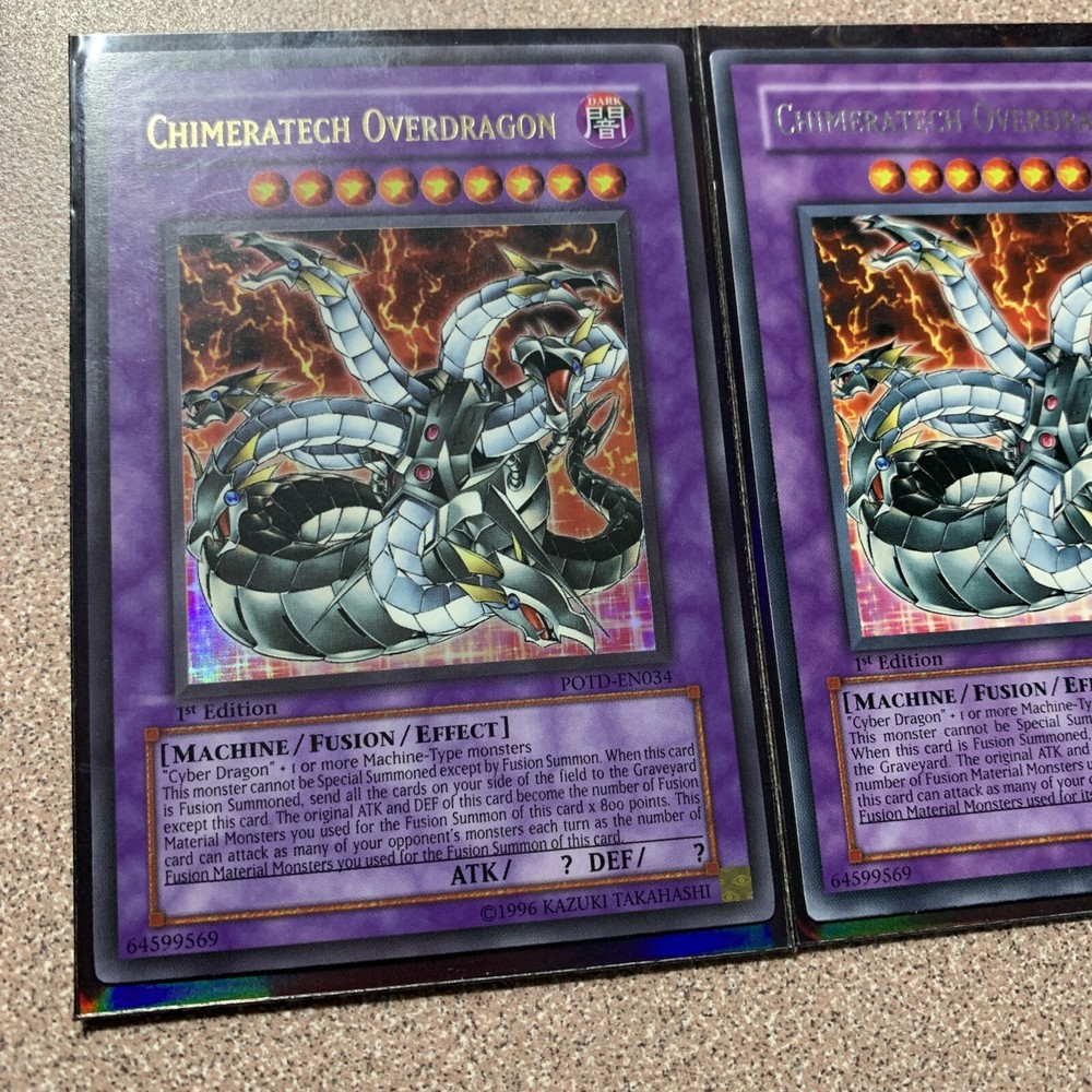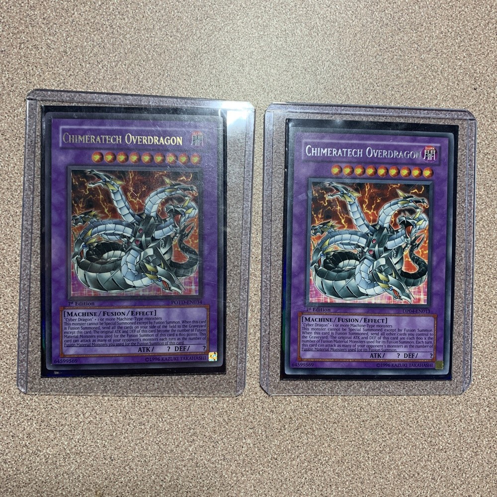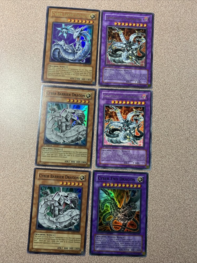 Chimeratech Overdragon POTD-EN034 1st ed + Cyber End & Laser Dragon - READ DESC. Condition is "Used". Shipped with USPS Priority Mail. LOT OF 4 CARDS - CHIMERATECH OVERDRAGON (X2) / CYBER LASER DRAGON / CYBER BARRIER DRAGON (X2) / CYBER END DRAGON CHIMERATECH OVERDRAGON: POTD-EN034 (ULTRA RARE) (1ST EDITION) DP04-EN013 (RARE - SILVER LETTERING) (1ST EDITION) CYBER END DRAGON: STON-ENSE1 LIMITED EDITION (SUPER RARE) ALTERNATE ART VARIANT CYBER BARRIER DRAGON (X2): SOI-EN006 (SUPER RARE) (ONE 1ST EDITION + ONE NOT) CYBER LASER DRAGON: SOI-EN007 (ULTRA RARE) **ALL CARDS ARE IN EXCELLENT TO NEAR MINT CONDITION WITH ONLY THE ULTRA RARE'S HAVING VERY LIGHT WEAR ON THEIR EDGES.** **PLEASE FEEL FREE TO MAKE OFFERS OR MESSAGE ME WITH AN QUESTIONS OR REQUESTS FOR MORE PICTURES!**