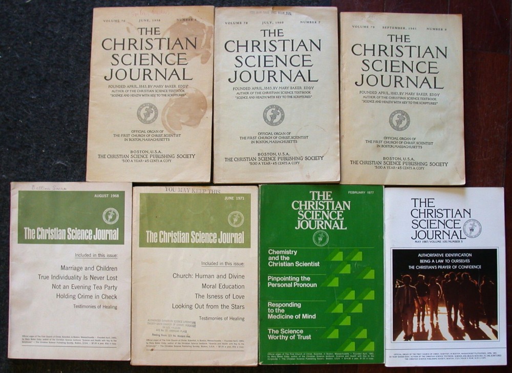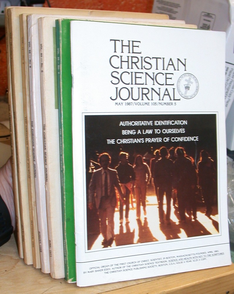 Included in this lot of seven issues of The Christian Science Journal are: Vol. 76, No. 6 - June 1958 Vol. 78, No. 7 - July 1960 Vol. 79, No. 9 - September 1961 Vol. 86, No. 8 - August 1968 Vol. 89, No. 6 - June 1971 Vol. 95, No. 2 - February 1977 Vol. 105, No. 5 - May 1987 See our other auctions for more Christian Science periodicals!