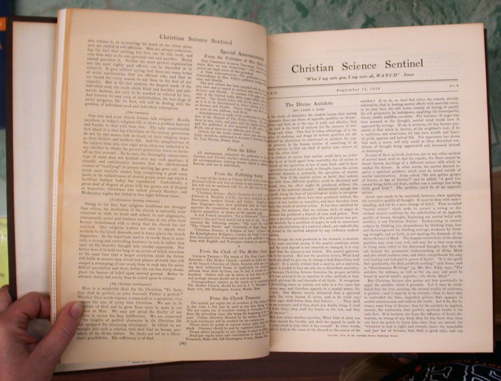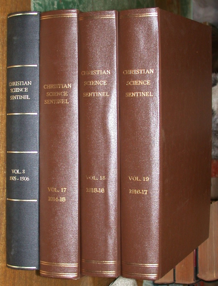 This lot of volumes of the Christian Science Sentinel includes: Vol. 8 - 1905-06 Vol. 17 - 1914-15 Vol. 18 - 1915-16 Vol. 19 - 1916-17 Each volume runs over 1,000 pages except Vol. 8, which is over 800 pages. All years include an index. The loose issue included is Volume XXI, Number 10 (November 9, 1918). Check out our other auctions for more Christian Science periodicals!