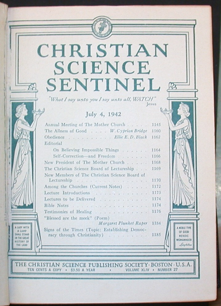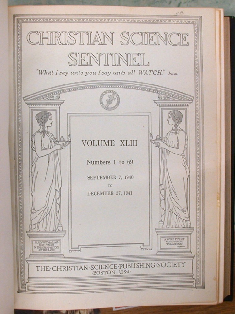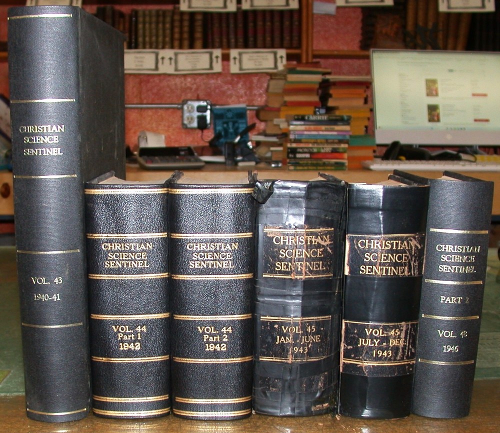 This lot of volumes of the Christian Science Sentinel includes: Vol. 43 - 1940-41 Vol. 44 Part 1 - 1942 Vol. 44 Part 2 - 1942 Vol. 45 Part 1 - 1943 Vol. 45 Part 2 - 1943 Vol. 48 Part 2 - 1946 Vol. 43 is a tall oversized volume, but after that the other volumes are smaller in size. Each volumes runs over 1,100 pages, and all years (except 1946, which is missing Part 1) include an index. The loose issue included is Volume XLIII, Number 65 (November 29, 1941). Check out our other auctions for more Christian Science periodicals!