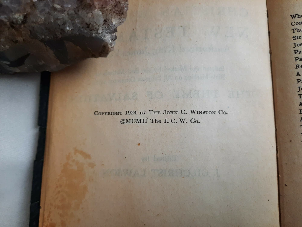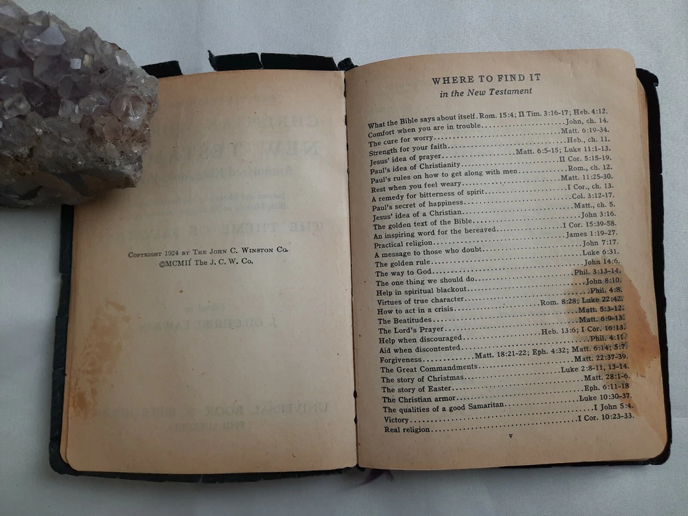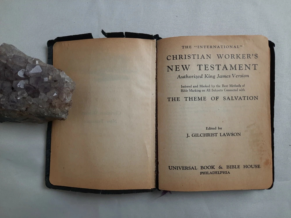 Christian Worker's New Testament Bible Pocket Size (1924) ~ Pre-owned periodical, in good condition for age. Writing on some pages and some stains, some tears and frays on pages. Overall in good shape. Item sold as is, see photos. ~ Softcover, leatherbound book. ~ Pocket-sized copy of the bible. ~ Edited by J. Gilchrist Lawson. ~ Published by Universal Book & Bible House of Philadelphia. ~ Copyright 1924, by The John C. Winston Co. ~ Printed in the United States. ~ From a smoke free and pet free home. ~ All items are sold as is, please see photos for more details. ~ International orders through the U.S. Global shipping center will be accepted.