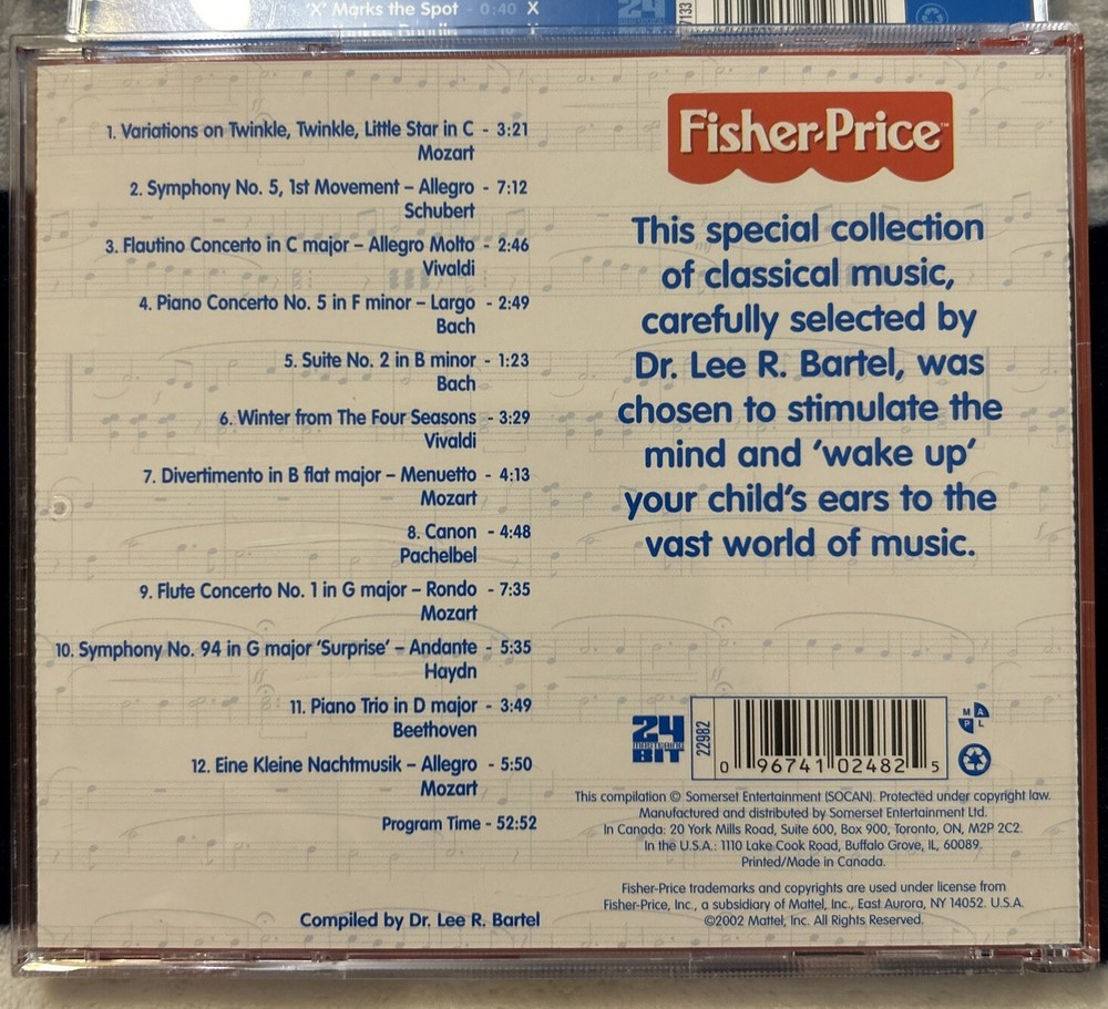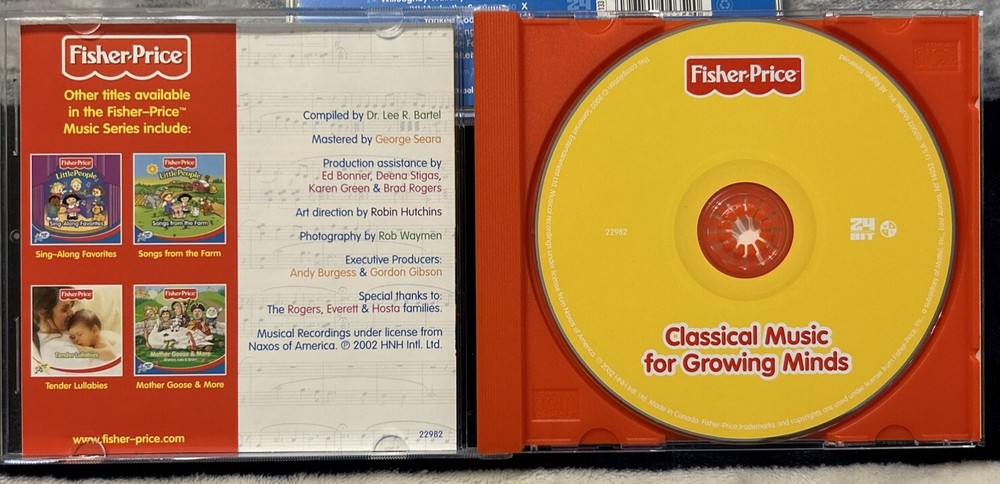 Immerse your little ones in the beautiful world of classical music with this Fisher-Price CD titled "Classical Music for Growing Minds." The album features enchanting musical compositions that are perfect for children's ears. The CD comes in its original packaging and is compatible with any CD player. It was released in 2002 by Fisher-Price and is in excellent condition. Get your hands on this timeless piece of musical art today and watch your children's minds grow and flourish! Great Condition!!