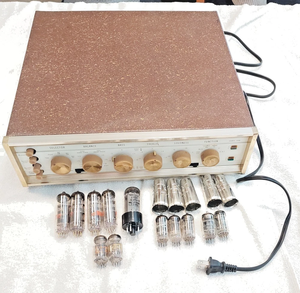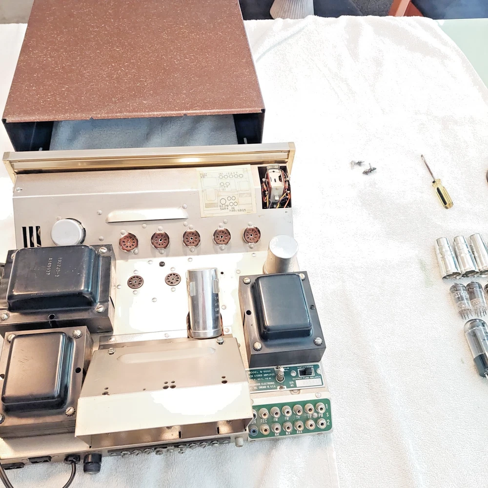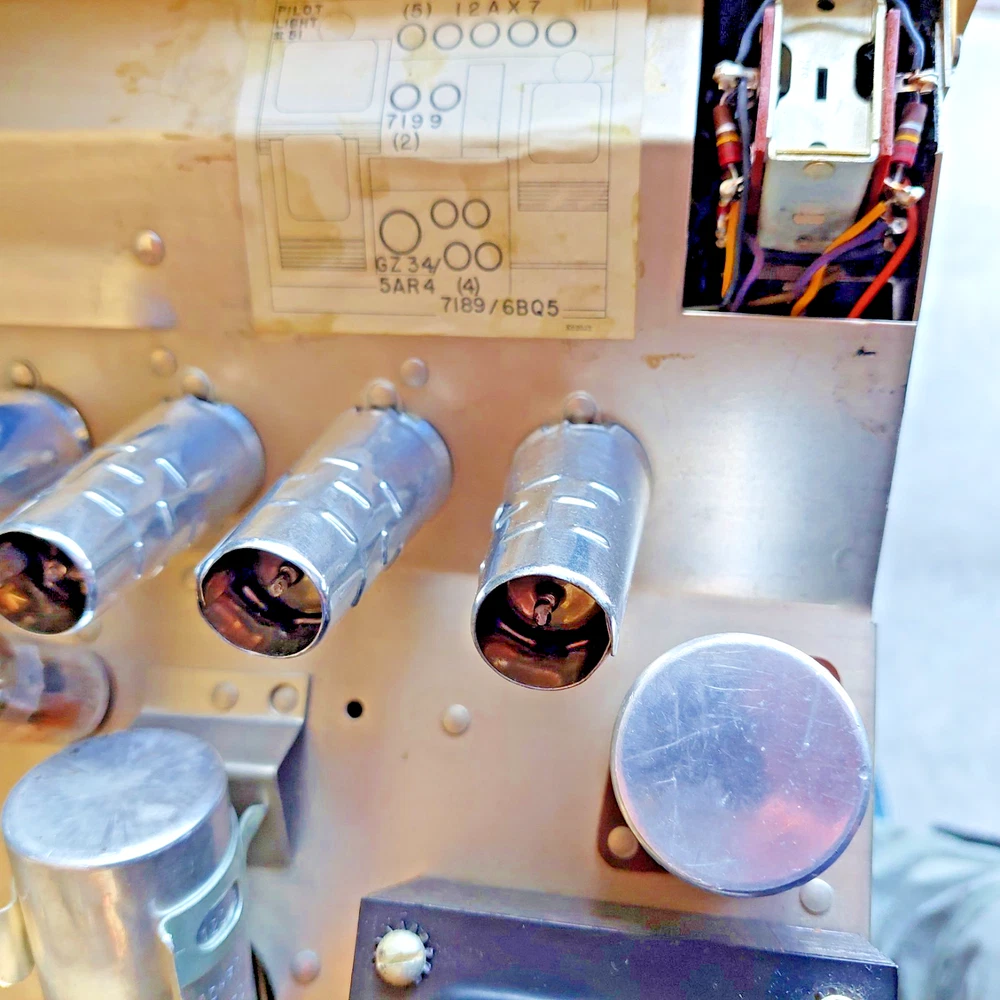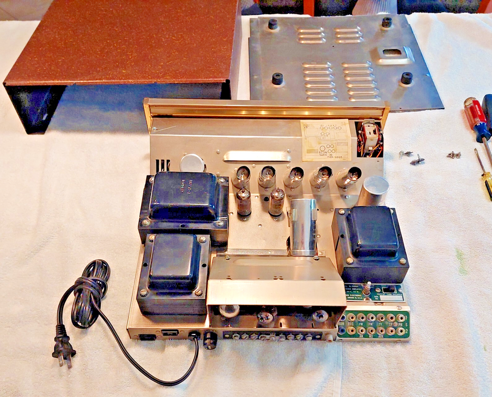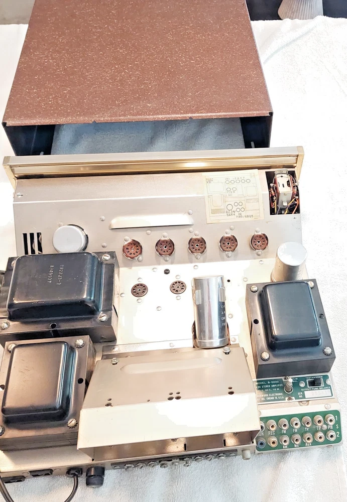 **** Price Reflect a Clean Unit, Fresh Total Restoration and All Vintage either NOS or NOS Tested Balance Premium Tube Complement ( Mullard-Great Britain ,EU-E.Germany & USA. Long Life vacuum tubes ) *** **** FREE LOCAL PICKUP with Demo before Purchase, by Appointment ***** **** Pickup in Cutler Bay, FL. 33190 (Miami-Dade County) **** THIS UNIT IS CROSS LISTED On Multiple Sites*** **** SHIPPING TO USA lower 48 States ONLY To eBay Verified address NO PO BOXES , *** 3 shipping options Economy USPS,UPS,FedEx, Insured, Adult Signature required upon delivery. Pick the lowest cost rate to your zip code and we will make it happen. PLEASE READ THIS ENTIRE DESCRIPTION BEFORE YOU BUY. Ask Questions before you buy. We respond to eBay msgs quickly. This is a Very Long Detailed Description ( NO A/I listing descriptions used here ) ONE(1) FRESH Electronic Restoration(05/17/2025) 1959 SHERWOOD S-5000 (S5000) version=I (S-5000 I) Stereo 12-Tube Integrated Amplifier (RE-Tubed with Premium Tubes all vintage US, Great Britain, E.Germany-Russian vintage tested tubes on a recently Dan Nelson Calibrated TV7D/U tester.) SN# 955418 (Production of the Sherwood S-5000 ca. 1959-1962). Unit will come with Printed copies of the Service manual( all SKU's , parts list, trouble shooting tips ect. and Sherwood S5000 User/Operation/Setup Manual with Diagrams and full Operating Specs. Included Excellent Condition Original Metal Cabinet, Bottom Panel and all original knobs. This unit is In working and excellent sonic condition. Fully tested after restoration for 20hours (Stereo&Mono all Line Level channels with CD player&Cassette Player/Aux, TV & Tape input and also tested both High-Level and Low-Level Phono Channels with a Phillips 312/Stanton EE680 cart. turntable. The chassis is grounded for connection to your turntable ground wire connect to one of the side panel nut/bolt/screws. Original 1959 Excellent Quality Power Supply Stamped in metal 'B9922J3-3 A949937' and Two(2) Original Ultra linear Output Transformers 'B920J4 M549935' all 3 PS/OPTs with Braided Cloth wiring. SPECS: P ower output: 20 watts per channel into 8Ω (stereo) Frequency response: 20Hz to 20kHz Total harmonic distortion: 0.5% Input sensitivity: 2mV (MM), 200mV (line) Signal to noise ratio: 60dB (MM), 80dB (line) Speaker load impedance: 4Ω, 8 Ω, 16Ω Valve complement: 4 x 7189( EL84/6BQ5/E84L/7320 ), 2 x 7199, 5 x 12AX7/ECC83, 1 x 5AR4/GZ34 notes on Power tubes: 6BQ5/EL84's ave. life 500 hours, 7189=6BQ5B 1,000 hours average, E84L/7320 premium tubes average life 5,000 hours. Dimensions: 14 x 13.5 x 4 inches net weight: 32.5 lbs (amp with tubes and shields) Shipping Weight: 39lbs, well padded heavy duty box 20x20x10" Vacuum Tube Complement (mixed Vintage USA, Great Britain, East German/Russian) : 4xNOS Date Matched('79-22') Quad E84L's/ 7320 Gold Pins branded for DuMont (The E84L/7320 is a premium Long-life version of 7189's= /6BQ5B/ which were upgraded versions of EL84's/6BQ5's). Quad is white inked "Made in Germany" "7320/E84L". then Red ink "ERP" "79-22" . This quad have solid disk top-side getter with a center dimple and were either made in East Germany or made by Reflector in Sartov, USSR to Russian military specs for export. 5x 12AX7/A's (3 are Mullard inked 'Great Britain' 1965 'I63' 2x'B5J4' 'B5K2' inked 'Made in Great Britain' branded for GE. The 4th is a late 1960's 'IE' GE 7025/12AX7A(best inserted in V1-for low noise phono amplifier tube) and the 5th is a GE 12AX7A dated 1964. All tubes tested balanced and strong) 2x 7199 vintage 1960's Black Plate USA tested trong. One RCA(early 1960's) and one Westinghouse(1967) 1x5AR4/GZ34 NOS unused Sovtek(Tested very Strong NOS+ balanced plates dated 2001 Russia -High reliability tube) Notes: Our 50years+ exp. with Cabinets/Cages/Covers/Consoles enclosures : ( cabinets, metal cages and Console Enclosure hinder air-flow and as such your tubes will only generally last 1/2 as long. So we suggest operating this Sherwood S-5000 outside of its cabinet for daily use. We also suggest using all tube audio units in operation without covers. Additional we suggest using a high quality computer fan behind these tube type units to dissipate vacuum tube heat ( just visit your local Computer repair/parts store many have fans available for low cost). In 2025 a NOS vintage tube complement(12 Premium tubes) in these units cost was as much as an unrestored unit with average/user supplied used tubes. 'A Light that burns twice as bright( twice as Hot without ventilation ) burns 1/2 as long' . Please Follow this suggestion and Your tubes will love you! ). For Shipping: This unit will be mounted securely in its original metal cabinet and wrapped very well after we pull and pack all tubes carefully inside a separate box. This Unit&Cab, Tubes and all Docs with this printed description will then all be packed into a New Heavy Duty ULINE/UHAUL Small Electronics box 20"x20"x10" all 6 sides will have ample thick Styrofoam padding. Restoration work done to Factory Specifications. Full Details of restoration are below: About us: We are Honest Sellers and Great Communicators 27+year seller to Happy Customers on ebay with 100%+ feedback on Vintage Electronics[Tubes, Amps/PreAmps/Receivers/Radios/Speakers and other tube type audio Gear): We have sold analog tube audio units since PRE-Ebay DAYS from the late 1970's. Please read our feedback from very recent sales of Tube Audio PreAmps ( Dyna PAS-2, Valve Audio Labs MP-L1S MKII ), Receivers( Fisher 400), Int Amps (Harman Kardon A30K/A300, Eico ST-40), Power Amps (Dynaco ST-70), Tube Type Analog Tuners(AM/FM) stereo Radios( SCOTT LK-110 Stereomaster MPX, Fisher 1000-R(101-R) ). Please contact us before you purchase if you have < 10+ feedbacks. Our buyers tend to be higher-end audiophiles and audio collectors. We always welcome 'newbies' to the tube audio world but if this is your 1st tube amp purchase please have a friend who has exp. with tube audio to help and assist you in setup and pr
