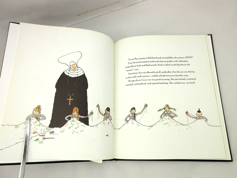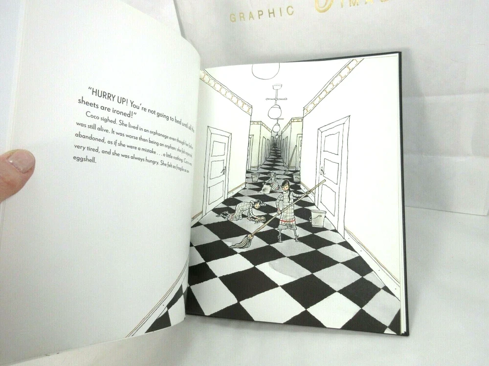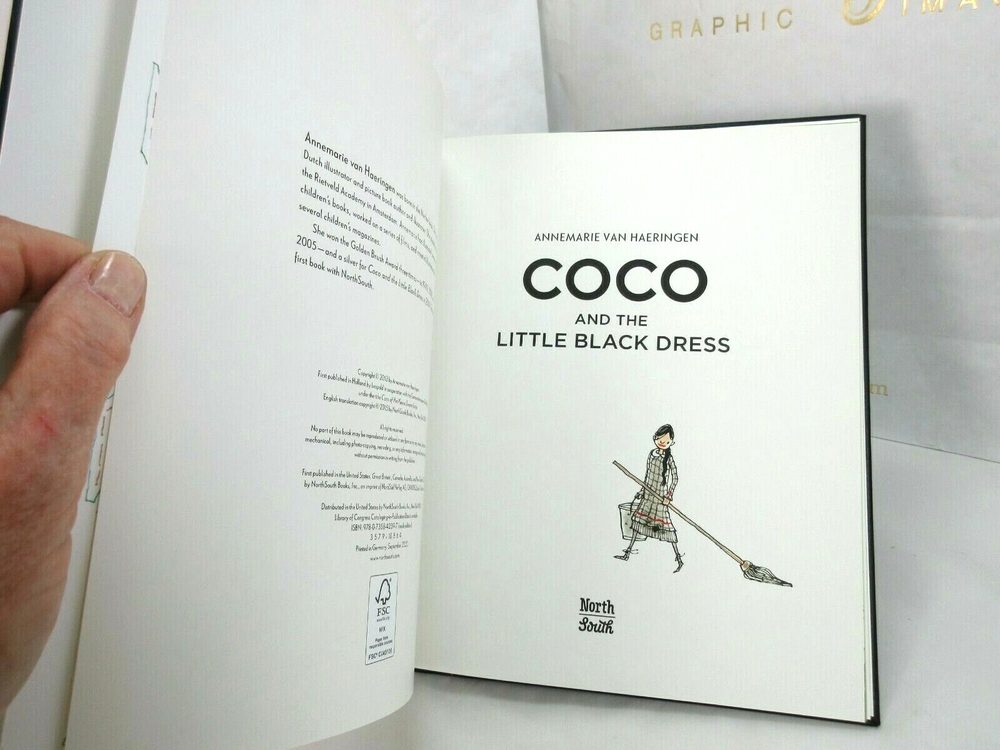 Coco and The Little Black Dress Bound by hand in bonded leather There is a small imperfection in the leather on the cover (see pic #2). Otherwise perfect. Reduced price. A beautifully illustrated picture book biography of Coco Chanel. Coco Chanel (1883-1971) was a famous French fashion designer. Born into a poor family, strictly brought up in the orphanage, influenced by the style of wealthy suitors , she remained faithful throughout her life to the simplicity. A luxurious simplicity , which has produced memorable style icons like the little black dress and perfume Chanel No. 5. 32 pages Size: 8.2" x 0.2" x 10" List price is $95 "Hurry up! You may only go to bed when all the sheets are ironed." Little Coco grew up in the orphanage and had to work hard for a living sewing and embroidering like an angel. Until her eighteenth birthday . Coco knew one thing for sure Coco. She would never, never be poor again.