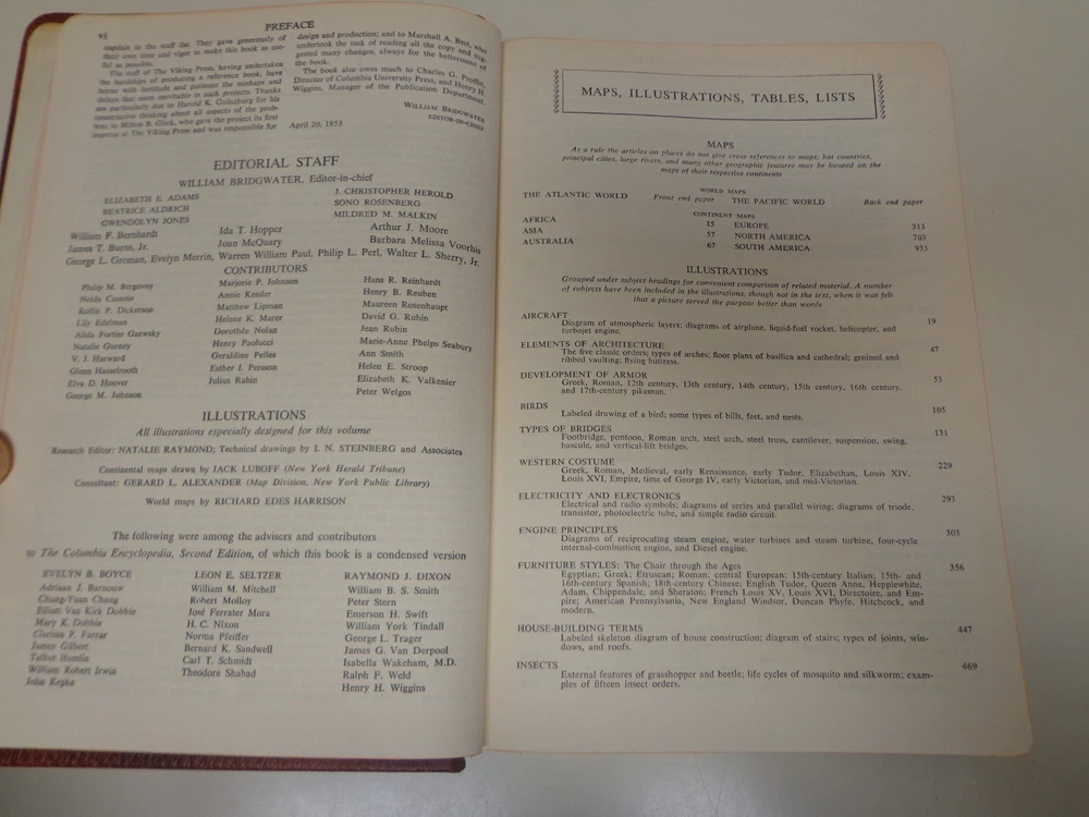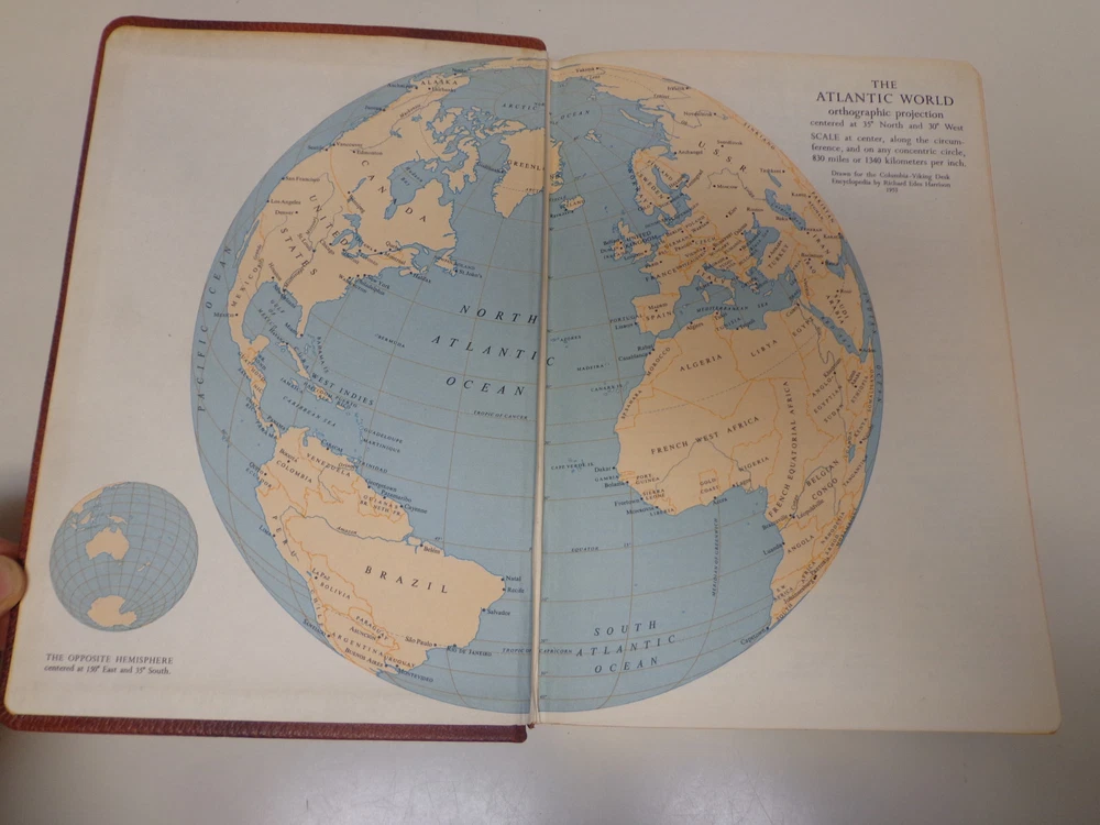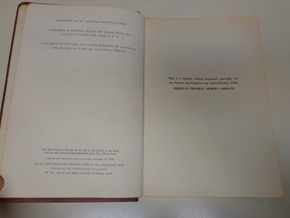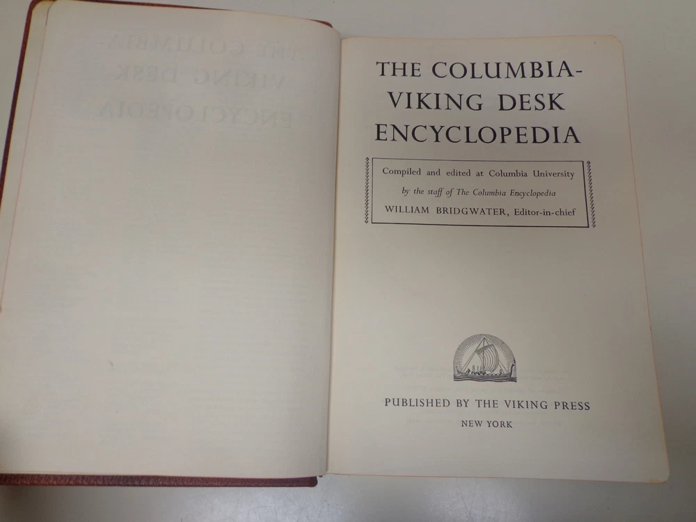 Columbia Viking Desk Encyclopedia 1959 Leather American Mineral Spirits Co Columbia Viking Desk Encyclopedia compiled by William Bridgewater The book features a unique look at the world of the Desk Encyclopedia with lots of interesting information and exhaustive research, plenty of social details and neat advice, book is out of print. The book is a special leather-bound edition from the American Mineral Spirits Company, displays very nicely. Copyright 1959 Pages: 1059 pages Publisher: Viking Press The book measures approx. 10 ½ by 7 inches. The cover is nice and clean with some slight wear, overall nice condition. The spine end is nice with some light wear and scuffing. The boards and corners are nice with some minor denting and wear. The hinges and binding are tight and strong. The pages are bright and clean, minor denting on a few page corners, book is nice. Shipping weight is 5 pounds Inventory: 1018BC094