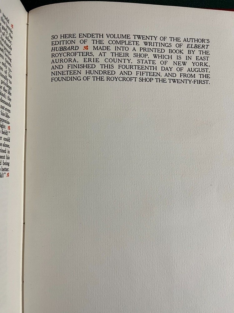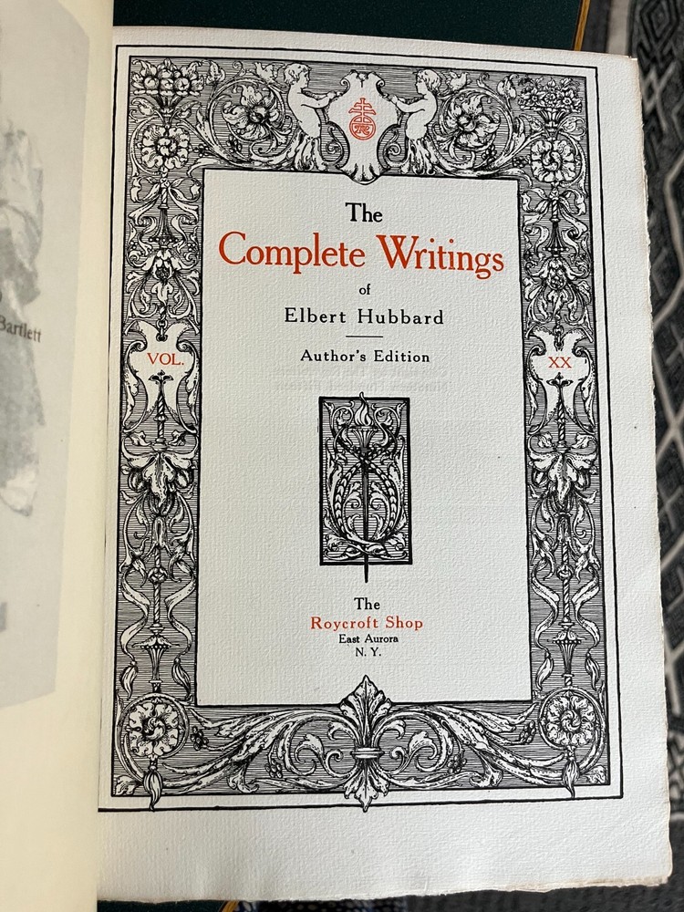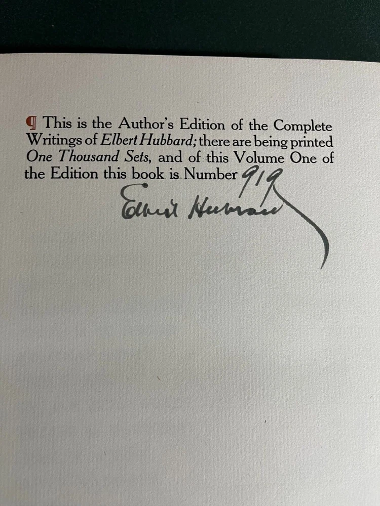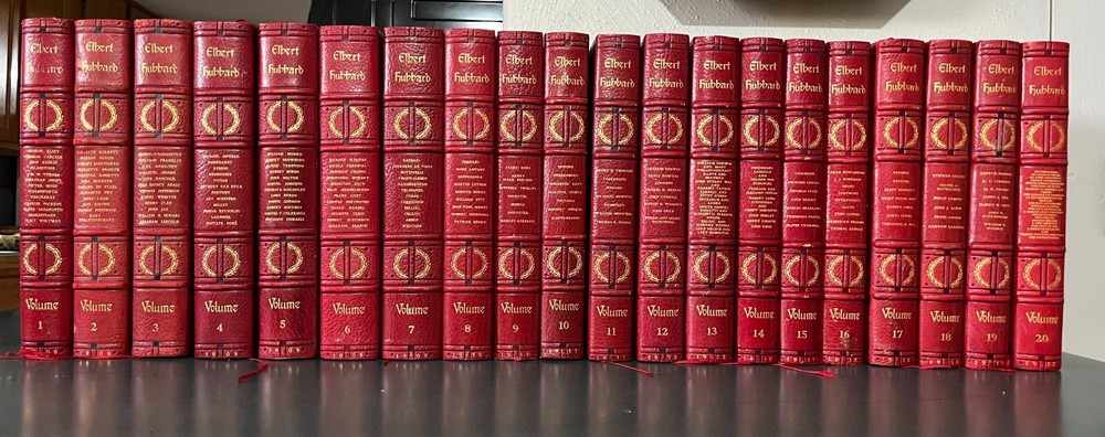 Complete Writings of Elbert Hubbard Author Edition, CompleteSet Volumes 1-20. East Aurora, NY; (1908--1915): The Roycroft Shop. LimitedEdition. Quarto. Limited to 1000 sets. This set set is #919, each volume signedby Elbert Hubbard. Excellent Condition. I received these from the original owner,my great-aunt, but no longer have space to keep them.