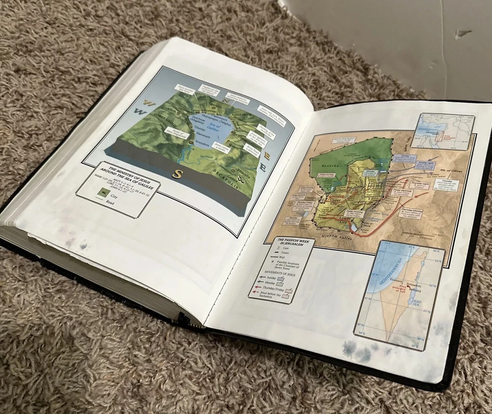 Light writing on the first few blank pages of book. A few of first pages are beginning to separate from binding. A little bit of water to damage to last few pages with maps. Please let me know if you have any questions!