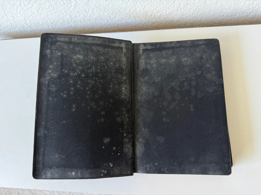Has some staining possibly mold on the inside of cover front and back. See photos No weird odors No writing inside No torn pages Outside leather has some scuffs and tears spine and front and back as shown See all photos for exact condition Ships bubble wrapped in box FRGL BX