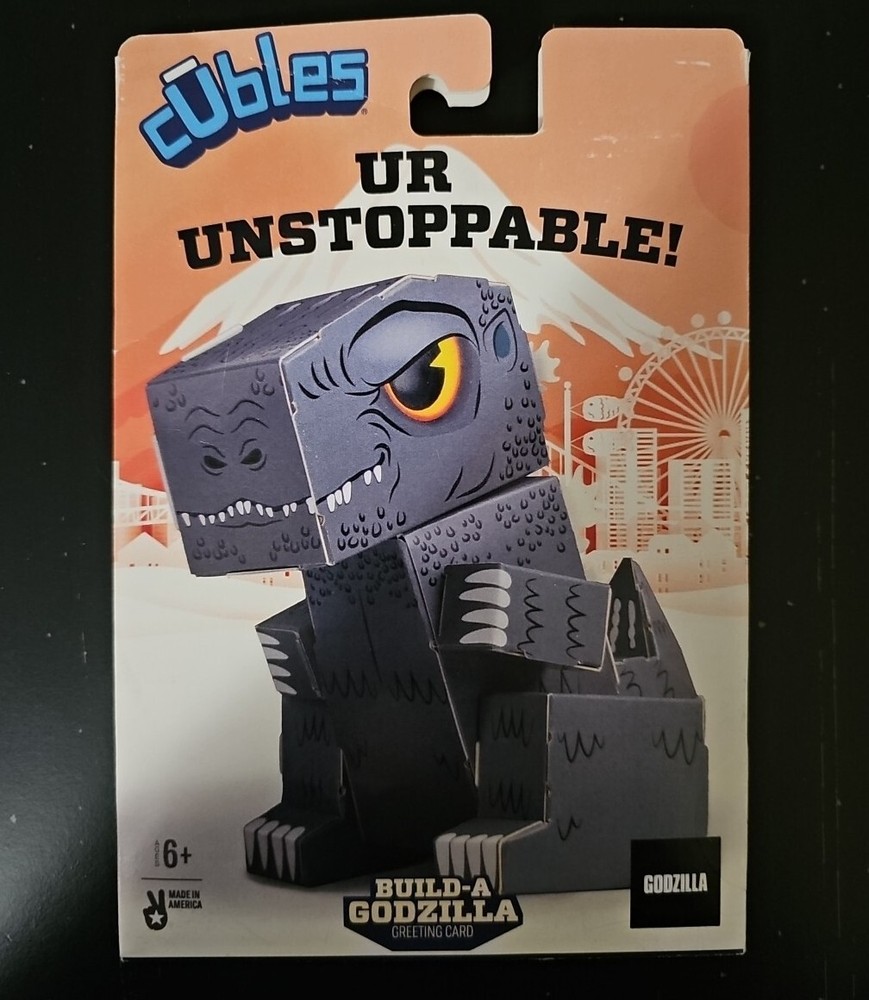 Cubles Godzilla Greeting card w/ a build a paperboard constructible Godzilla ( over 5 inches tall) Pop out the pieces to start - Fold , Connect , Build to bring Godzilla to Life...