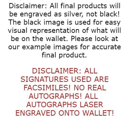IF THERE IS A SIGNATURE THESE ARE NOT ACTUAL AUTOGRAPHS. FACSIMILE SIGNATURES!!! PRINTED AUTOGRAPHS!!! NOT REAL AUTOGRAPHS!! THESE ARE NOT ACTUAL AUTOGRAPHS. FACSIMILE SIGNATURES!!! PRINTED AUTOGRAPHS!!! NOT REAL AUTOGRAPHS!! THIS IS NOT A VINYL DECAL THAT PEEL OFF. THESE ARE LASER ENGRAVED WHICH MEANS ALL TEXT/DESIGNS WILL BE IN SILVER ****PLEASE SEE EXAMPLE IMAGE**** Dimensions: 3.5" x 2.2" x 0.25" Weight: 3.2oz Comes packaged in black window gift box. PLEASE SEE OUR OTHER LISTINGS FOR OTHER COLORS LIKE DEEP BLUE, ARMY GREEN, GUNMETAL GRAY, ROSE RED, AND MORE!! This is not a vinyl decal that peel off. These are laser engraved which means all text/designs will be in silver (excluding silver which will be black engraving). - FUNCTIONAL & SLIM – Holds 1-15 cards. The slim wallet is ideal for carrying business cards, credit and debit cards, bills etc. The outside notch allows you to push out the cards easily. - RFID BLOCKING – Breathe easy because your cards will be surrounded by the metal body of this wallet protecting them from even the most powerful RFID Chip Readers. - INTEGRATED MONEY CLIP – The money clip allows you to secure several bills to the outside of your wallet in a traditional money clip form. UNISEX: FAVORED BY MEN & WOMEN: Given their sleek design & quality metal construction, these RFID sleeves are popular slim wallets for women & men. They make great gift ideas for the travelers in your life!