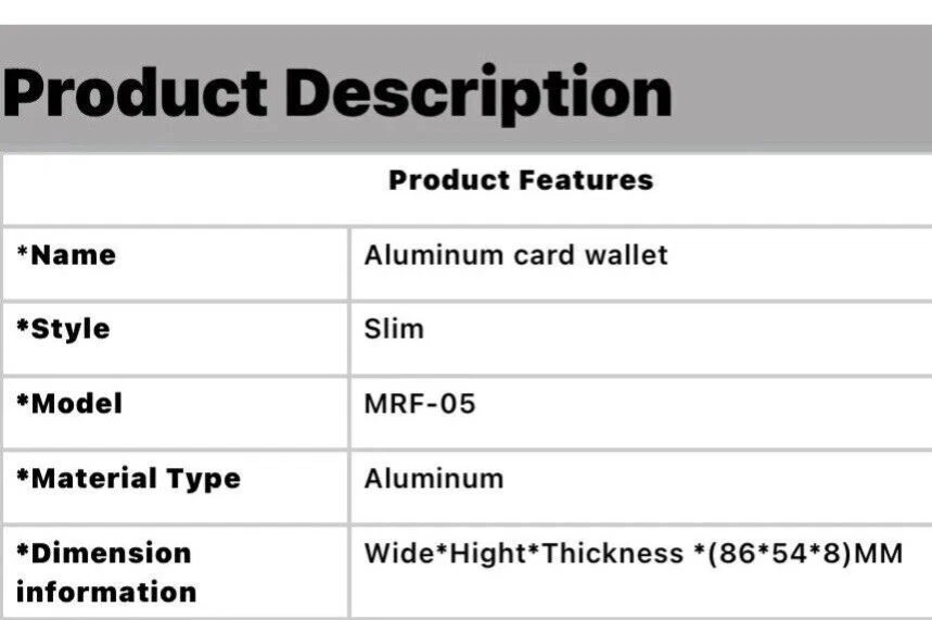 IF THERE IS AN AUTOGRAPH THESE ARE NOT ACTUAL AUTOGRAPHS. FACSIMILE SIGNATURES!!! PRINTED AUTOGRAPHS!!! NOT REAL AUTOGRAPHS!! THESE ARE NOT ACTUAL AUTOGRAPHS. FACSIMILE SIGNATURES!!! PRINTED AUTOGRAPHS!!! NOT REAL AUTOGRAPHS!! THIS IS NOT A VINYL DECAL THAT PEEL OFF. THESE ARE LASER ENGRAVED WHICH MEANS ALL TEXT/DESIGNS WILL BE IN SILVER ****PLEASE SEE EXAMPLE IMAGE**** Dimensions: 3.5" x 2.2" x 0.25" Weight: 3.2oz Comes packaged in black window gift box. PLEASE SEE OUR OTHER LISTINGS FOR OTHER COLORS LIKE DEEP BLUE, ARMY GREEN, GUNMETAL GRAY, ROSE RED, AND MORE!! This is not a vinyl decal that peel off. These are laser engraved which means all text/designs will be in silver. - FUNCTIONAL & SLIM – Holds 1-15 cards. The slim wallet is ideal for carrying business cards, credit and debit cards, bills etc. The outside notch allows you to push out the cards easily. - RFID BLOCKING – Breathe easy because your cards will be surrounded by the metal body of this wallet protecting them from even the most powerful RFID Chip Readers. - INTEGRATED MONEY CLIP – The money clip allows you to secure several bills to the outside of your wallet in a traditional money clip form. UNISEX: FAVORED BY MEN & WOMEN: Given their sleek design & quality metal construction, these RFID sleeves are popular slim wallets for women & men. They make great gift ideas for the travelers in your life!