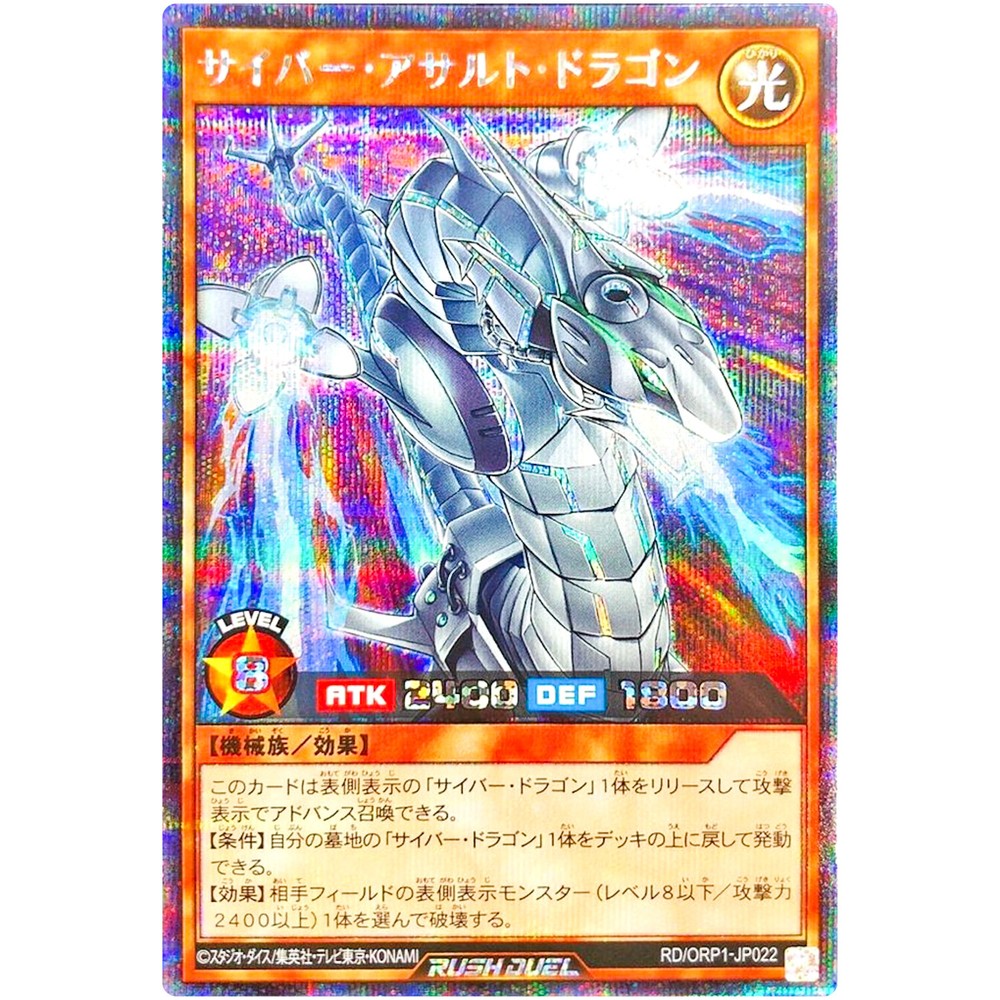 Item Discription RD/ORP1-JP022 Cyber Assault Dragon Front Back Card Name : Cyber Assault Dragon Character : Cyber Assault Dragon Rarity : Secret Rare Card Number : RD/ORP1-JP022 Set : Over Rush Pack Type : Effect Monster Language : Japanese Card Condition : Near Mint Purchased cards will be clipped with cardboard, waterproofed, and shipped without any scratches or folds. Cards over $20 will be packed even tighter with a loader for each card. Shipping Policy Free shipping worldwide. Free shipping does not include tracking. There is an additional cost of US $4 for tracking. If you purchase cards totaling US $30 or more, you will receive a free tracking number. All of the products will be shipped from Japan. Economy Shipping Air mail ( no tracking ) Free Shipping Delivery time : About 2-4 weeks Standard Shipping Air mail ( with tracking ) US $4 Delivery time : About 2-4 weeks Expedited Shipping FedEx or EMS or DHL ( with tracking ) US $24 Delivery time : About 1-2 weeks Payment Policy We accept all major credit cards and Paypal payments. Return Policy We hope you will love your purchase, houever if you need to return it, we have a 30 day return policy. International Buyers Import duties, taxes, and charges are not included in the item price or shipping cost. These charges are the buyerʼs responsibility. Please check with your countryʼs customs office to determine what these additional costs will be prior to bidding or buying. If the cancellation is due to the buyer, wewill charge a fee. If there is a remote charge for your address, we will charge you for additional shipping. We are honored to receive the eBay Japan Awards 2022! I am thrilled to share that my store has won the eBay Japan Awards 2022 ! This amazing accomplishment wouldnʼt have been possible without our wonderful customers. A heartfelt thank you for your ongoing support. We will continue to improve our services, offering a diverse selection of items and top-notch customer care Thank you for helping us achieve this prestigous recognition, and we look forward to serving you in the future! Copyright ©️ 2023 Animart Japan